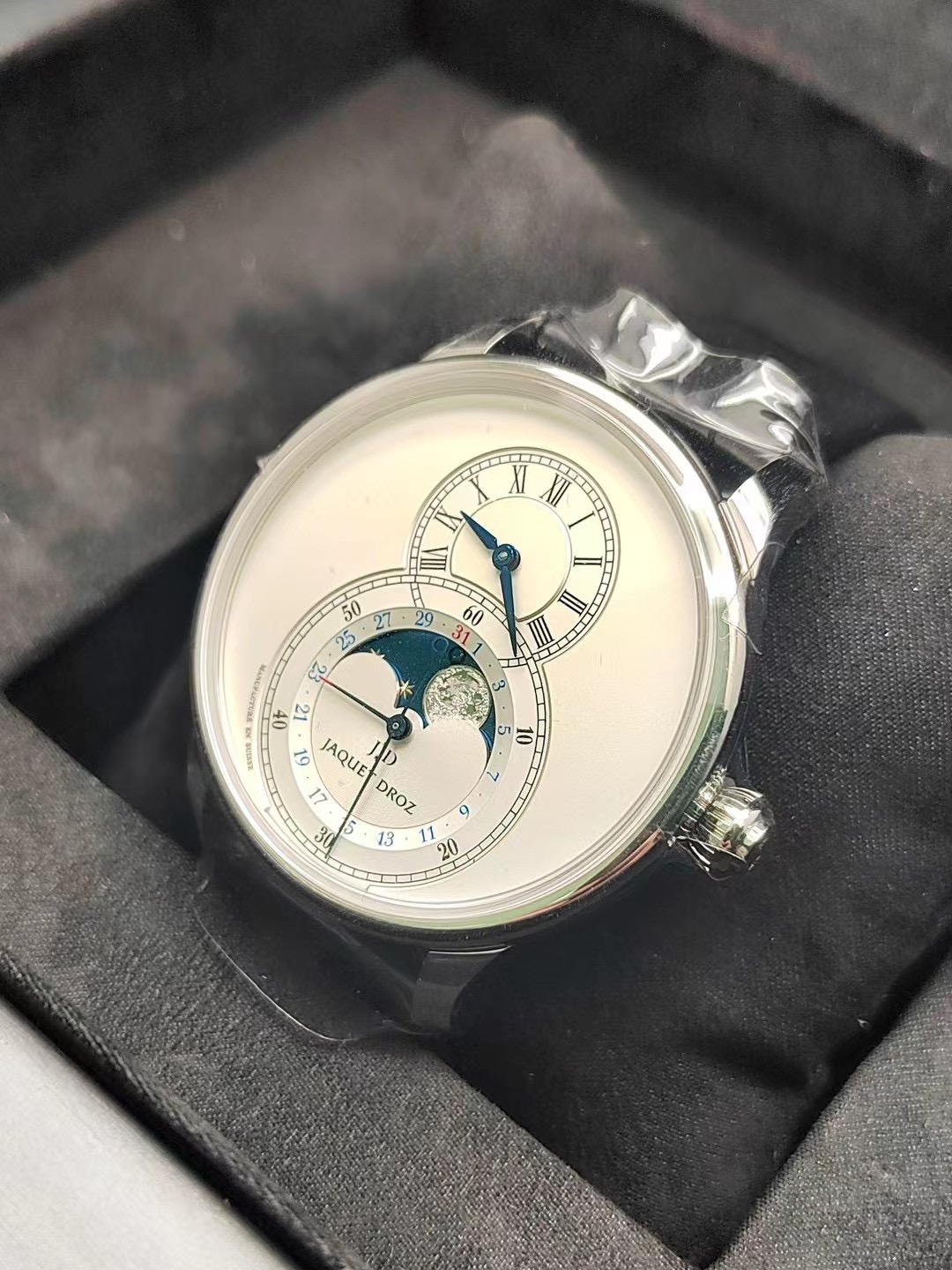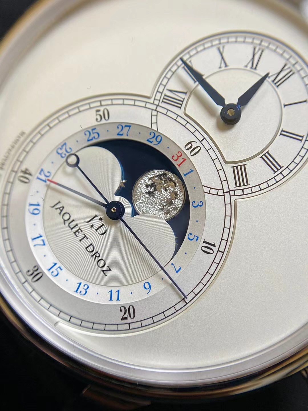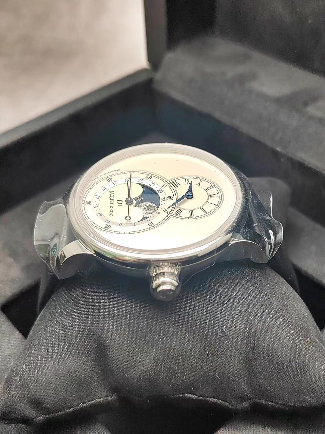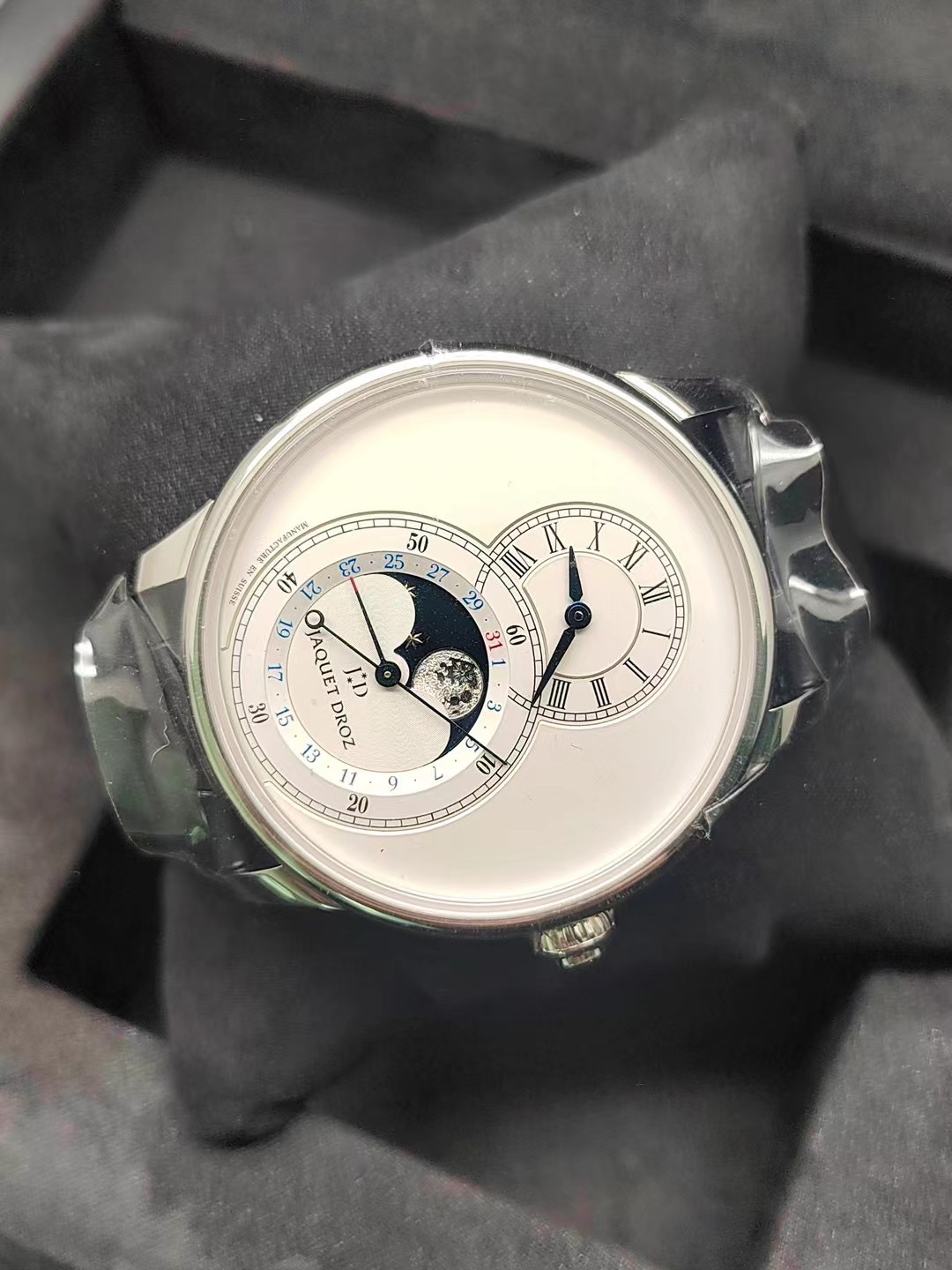 雅克德罗大秒针系列J007530240,镀银蛋白石表盘,蓝色月相刻度盘,18K白金星星和22K白金月亮镶饰,月相,日期显示,43mm表径,公价126500,现特价