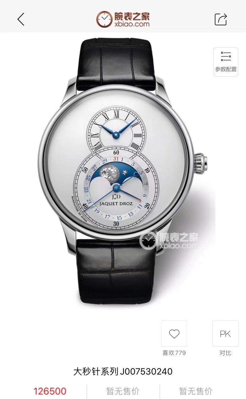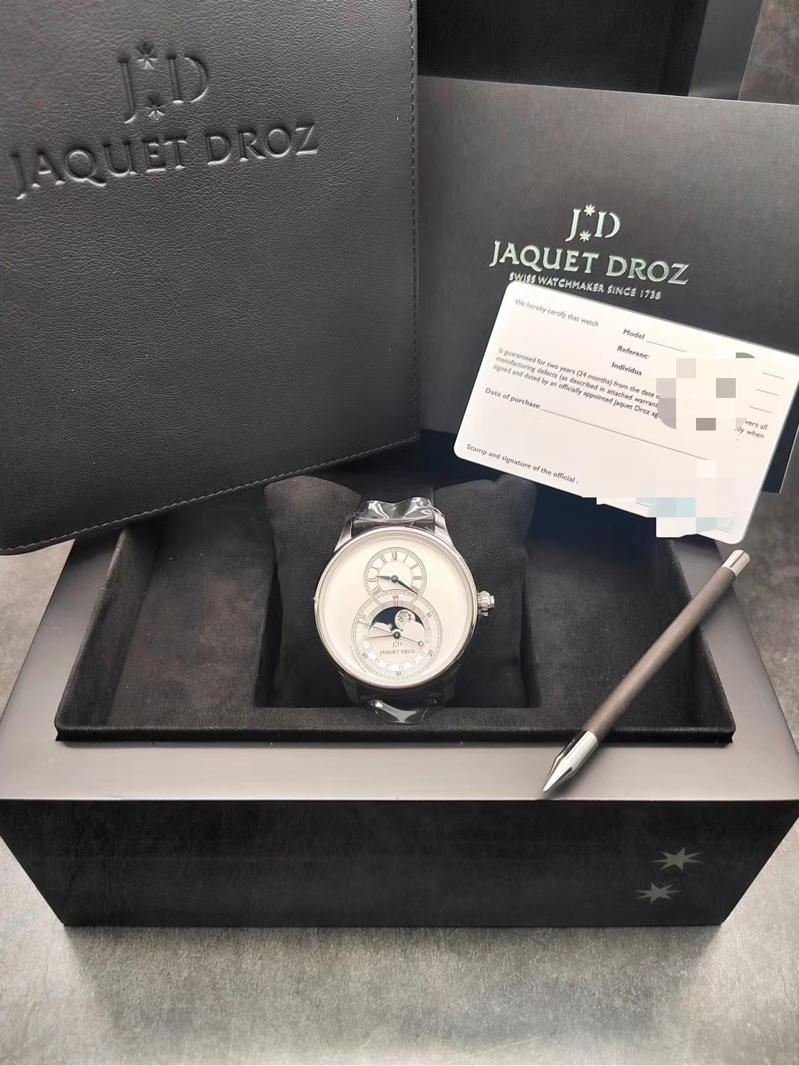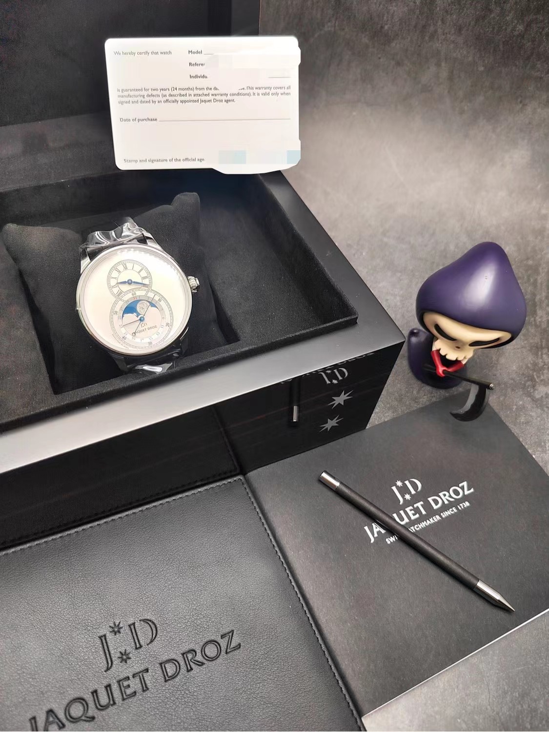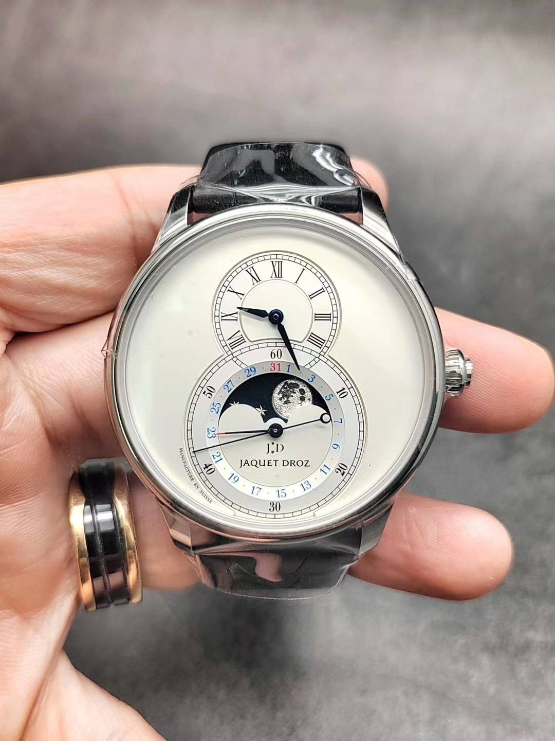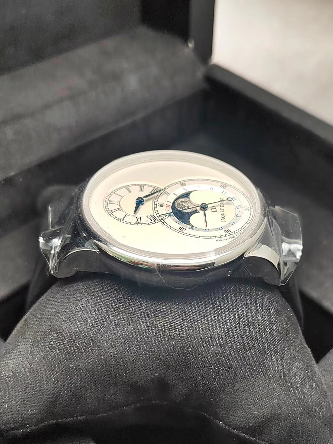 雅克德罗大秒针系列J007530240,镀银蛋白石表盘,蓝色月相刻度盘,18K白金星星和22K白金月亮镶饰,月相,日期显示,43mm表径,公价126500,现特价