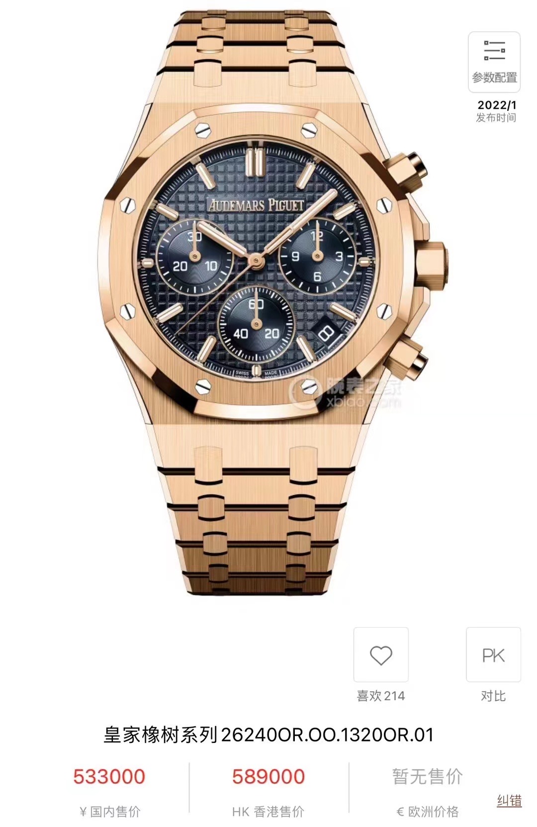 爱彼/Audemars Piguet 皇家橡树系列 26240OR.OO.1320OR.01 自动机械 玫瑰金材质 41mm 日期显示 计时 飞返/逆调功能 公价533000,未使用全套好价分享~