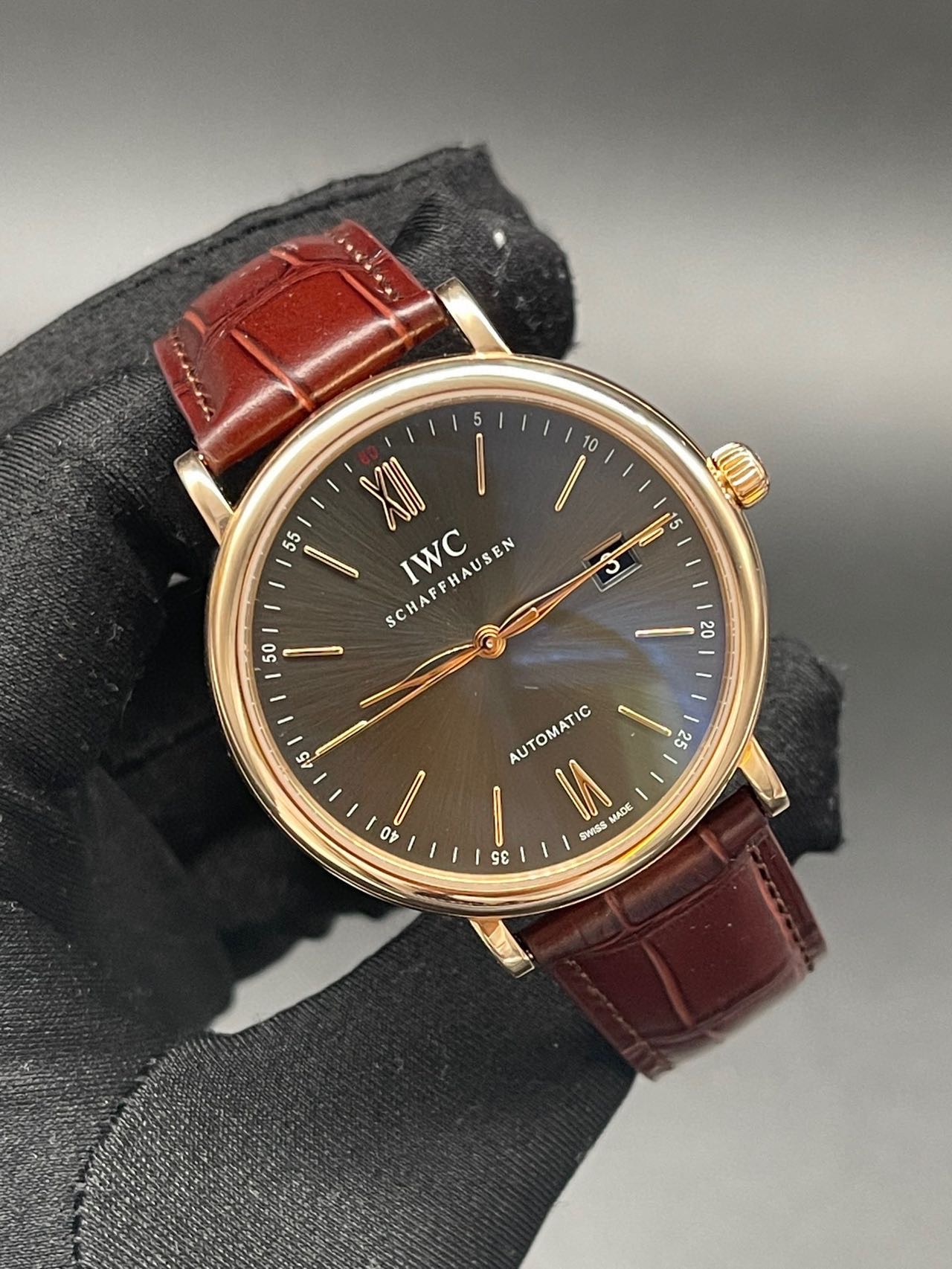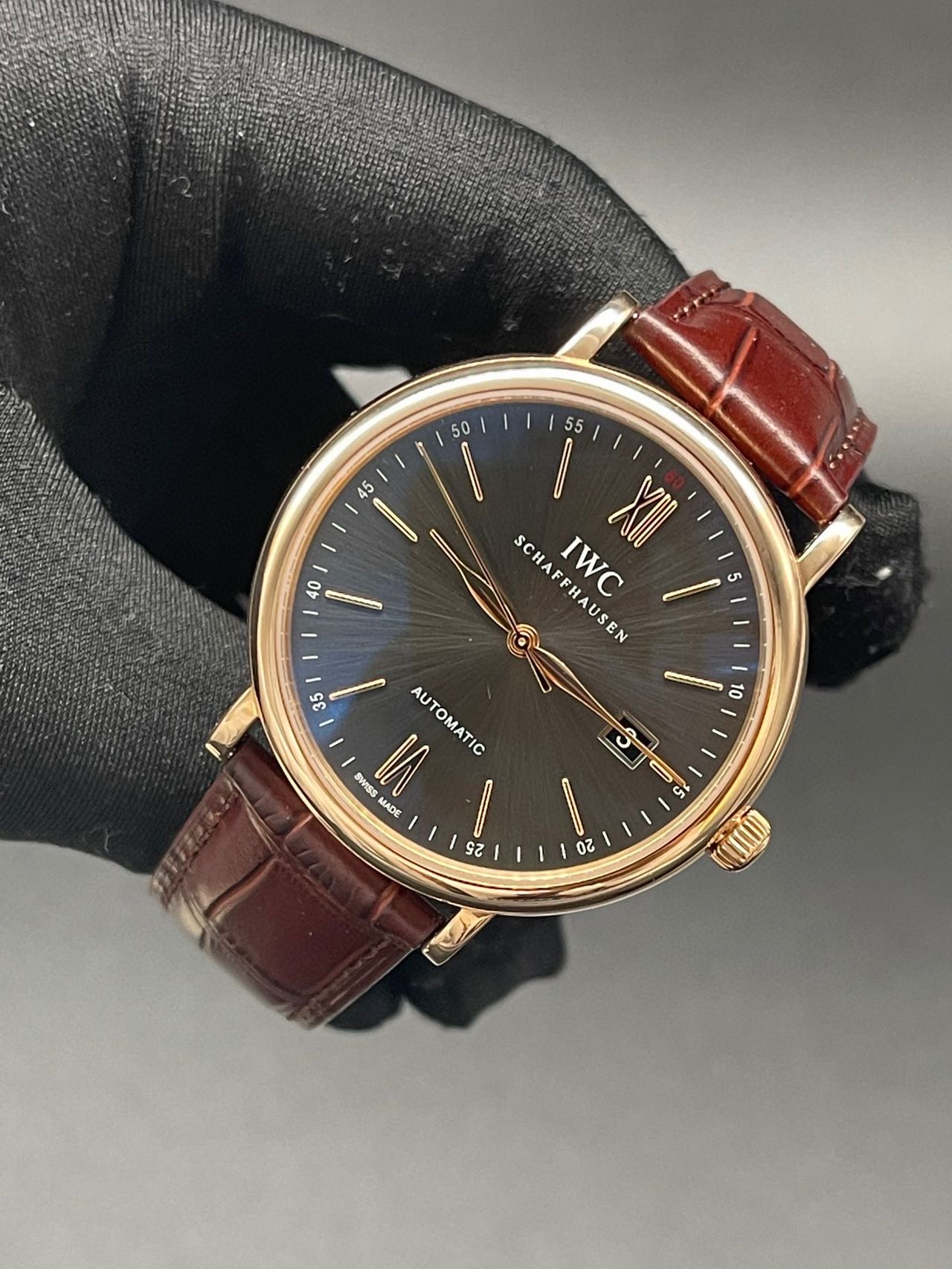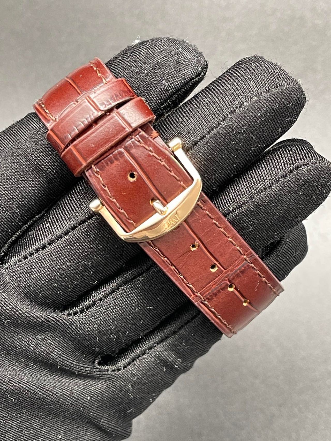 万国柏涛菲诺系列 :IW356511 自动机械男士腕表,表径:40mm ,18K玫瑰金材质 底部设计有经典柏涛菲诺小镇图案 更显高端气场 正装标准 玫瑰金更加完美 18K玫瑰金材质,大三针设计柳叶指针,灰色放射面,附件:20年全套附件,公价85600
