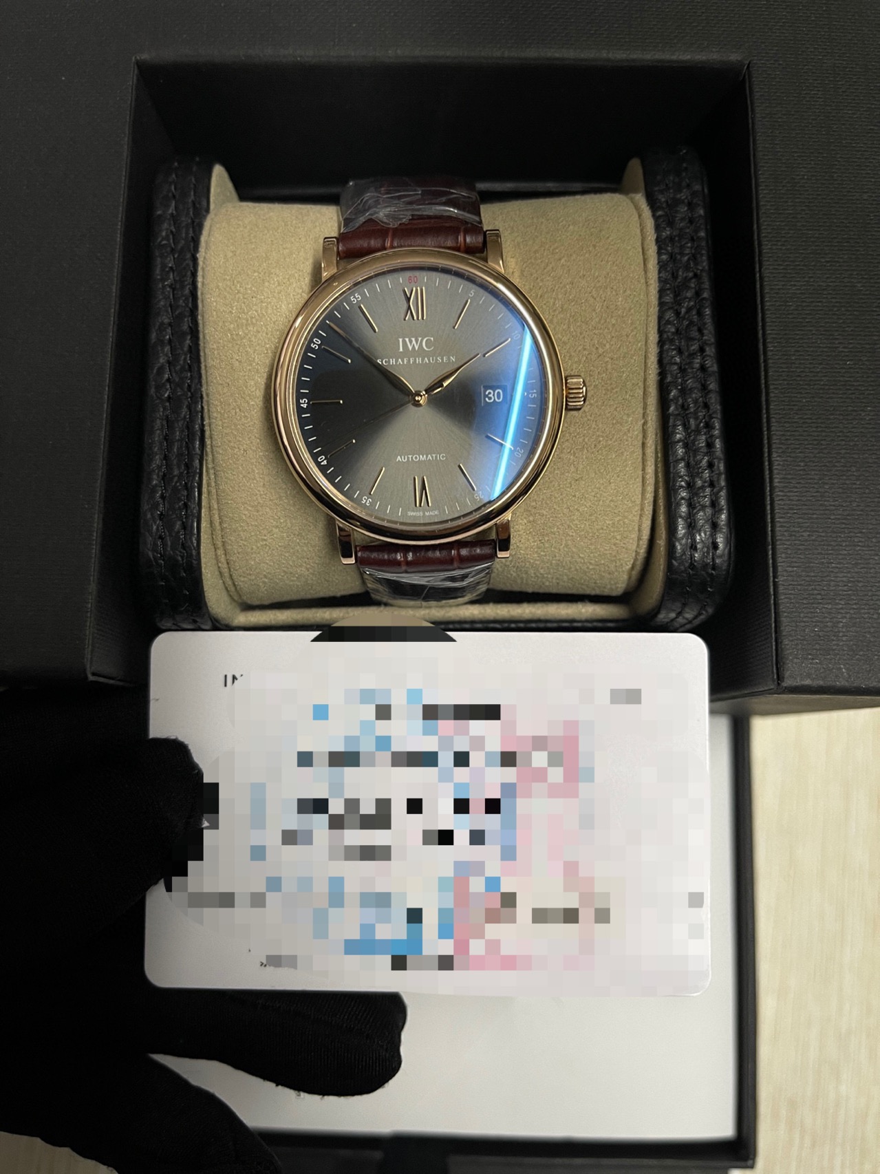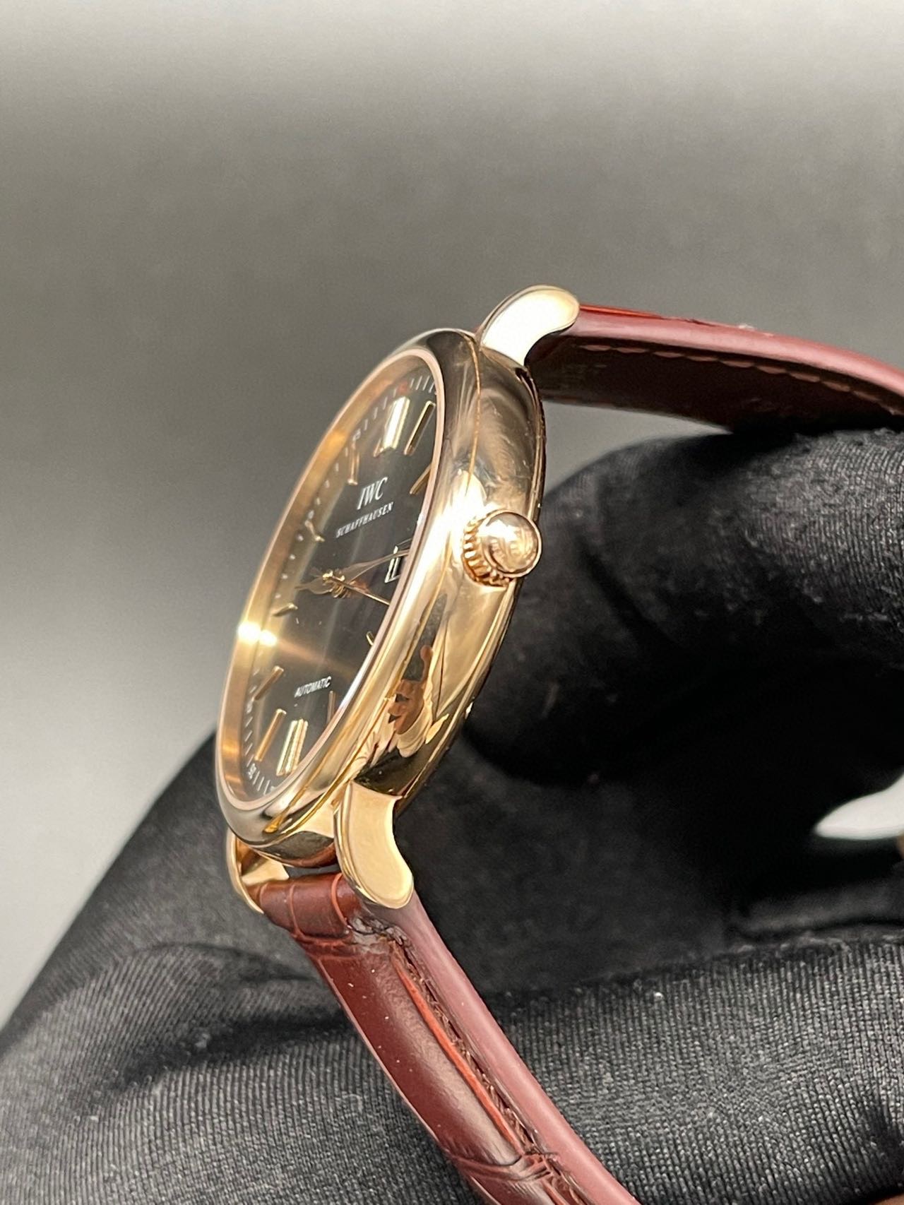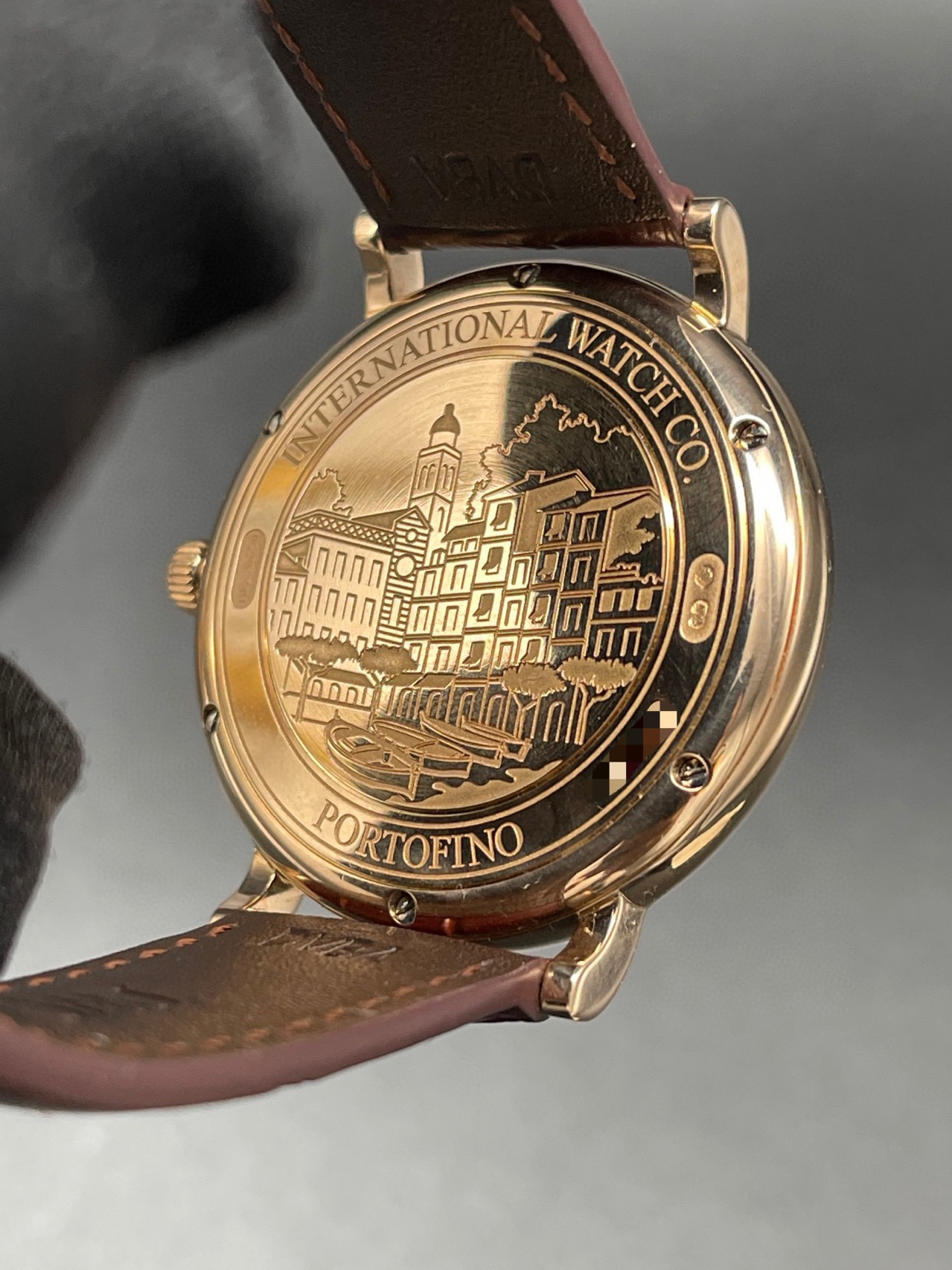 万国柏涛菲诺系列 :IW356511 自动机械男士腕表,表径:40mm ,18K玫瑰金材质 底部设计有经典柏涛菲诺小镇图案 更显高端气场 正装标准 玫瑰金更加完美 18K玫瑰金材质,大三针设计柳叶指针,灰色放射面,附件:20年全套附件,公价85600