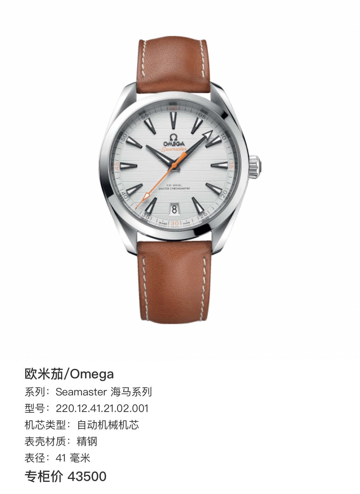欧米茄/Omega Seamaster 海马系列 220.12.41.21.02.001 自动机械机芯 精钢 41 毫米 专柜价 43500