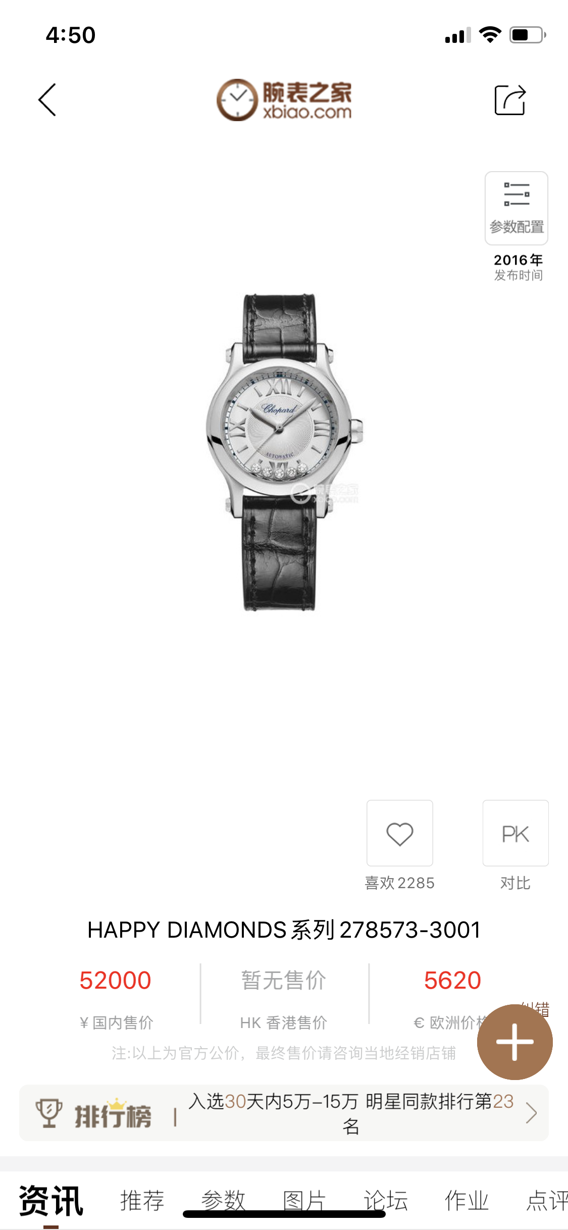 萧邦5钻系列. 278573-3001售价表径30mm.精钢材质.内镶5颗快乐原钻.自动机械.未使用全套.生活防水.公价52000———顾客需知———