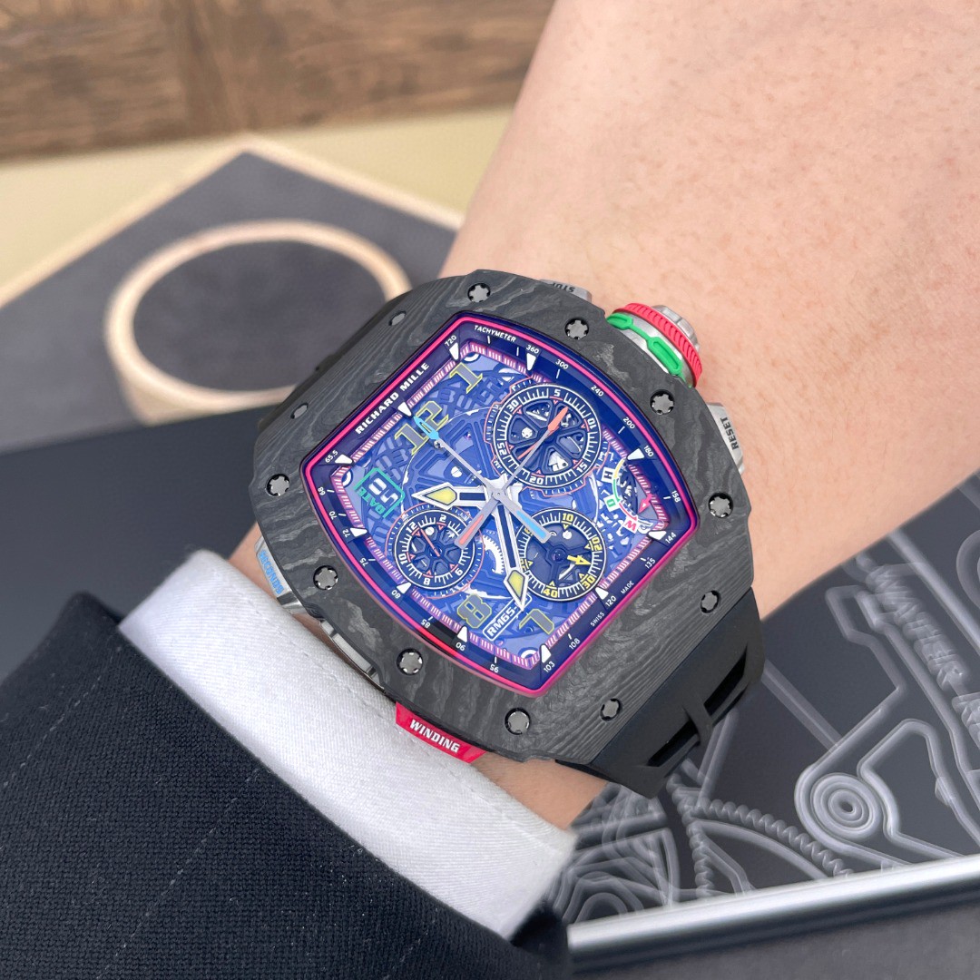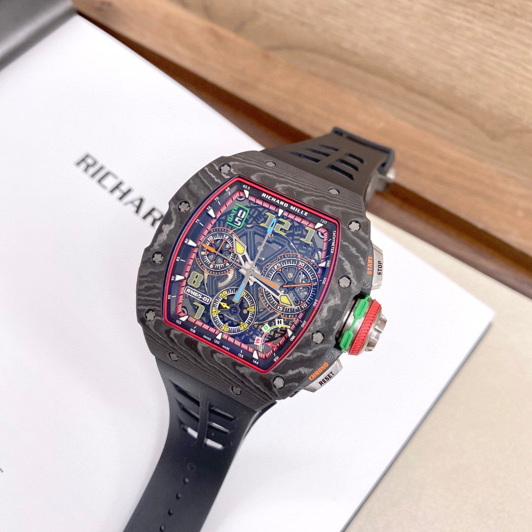 【柜台展示品未使用理查德米勒男士系列碳纤维自动机械男表】 型号:RM 65-01 表径:43*50mm 附件:配盒 ;说明书 ;有字证书(保卡日期2022年10月,具体信息以官方查询为准)功能:日期显示;计时;----专柜价:2368000元