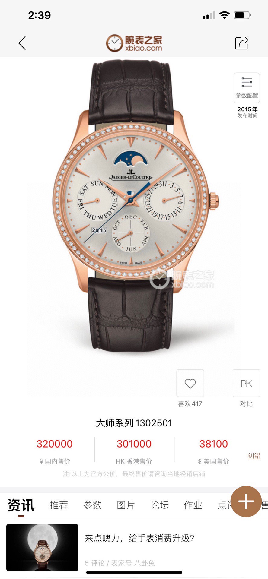 积家 大师系列 万年历 附件:全套 型号:Q1302501 自动机械机芯 玫瑰金 39毫米 专柜价 310000