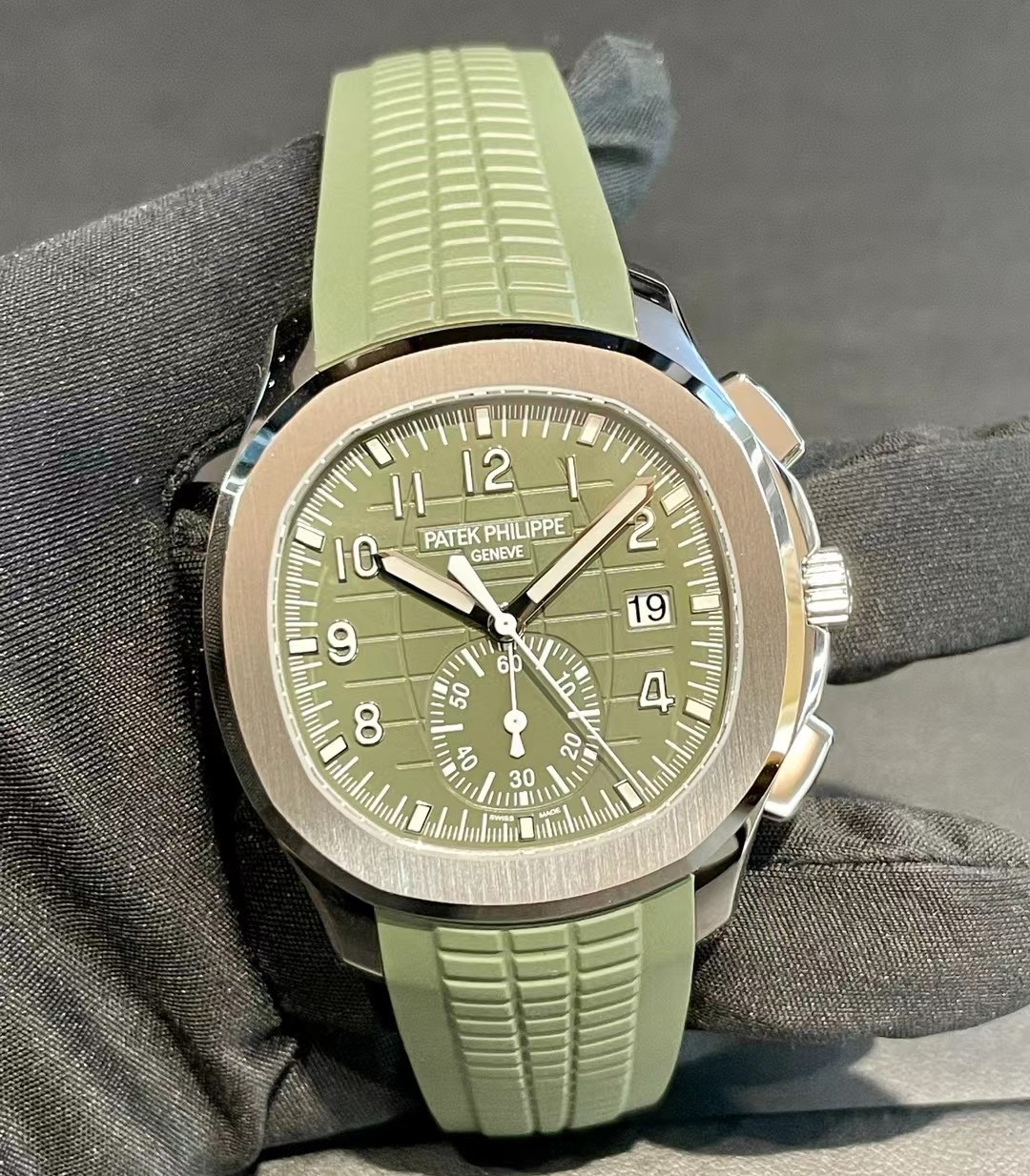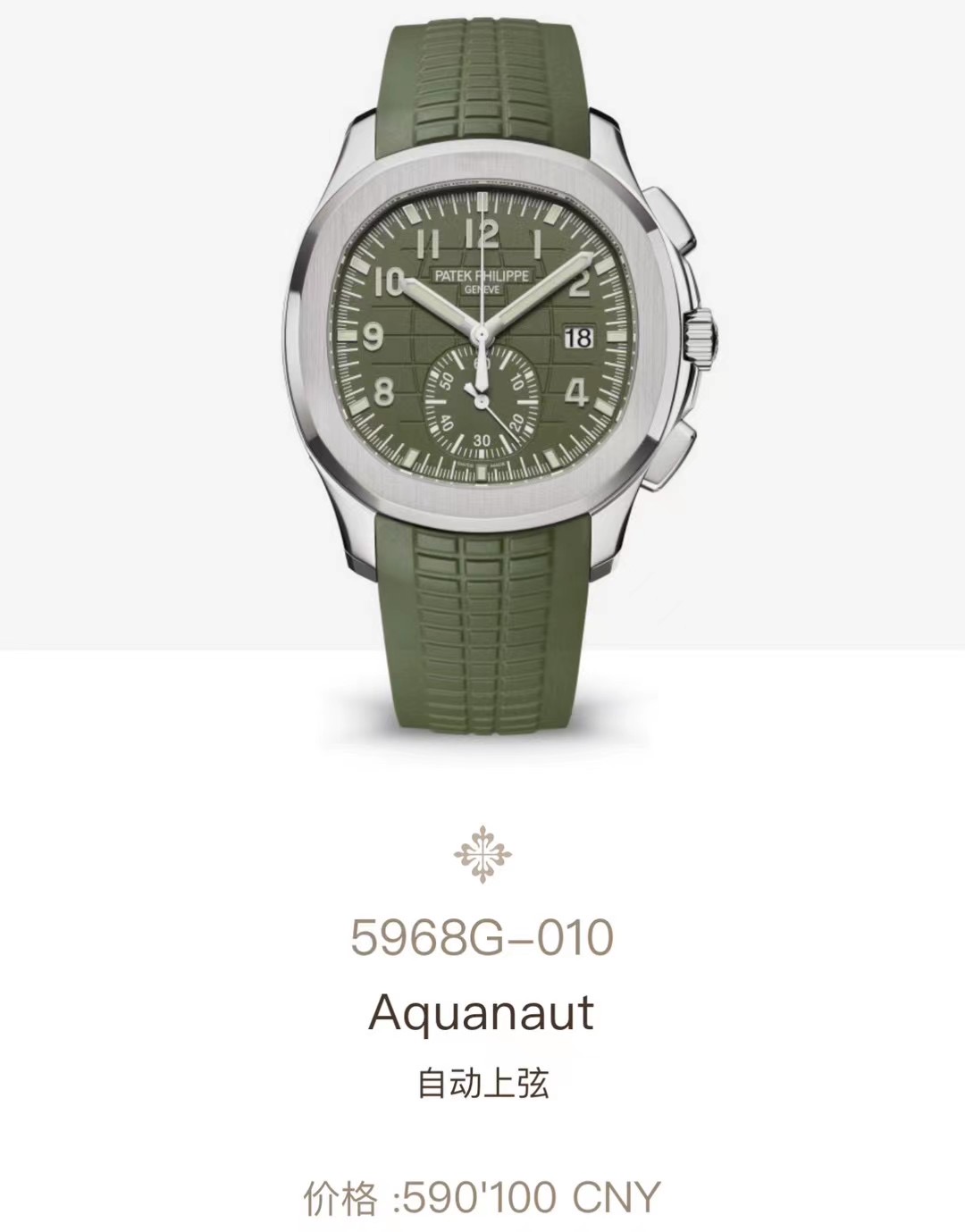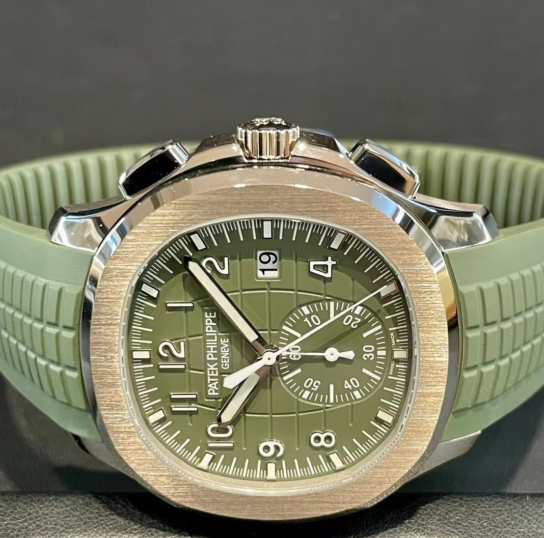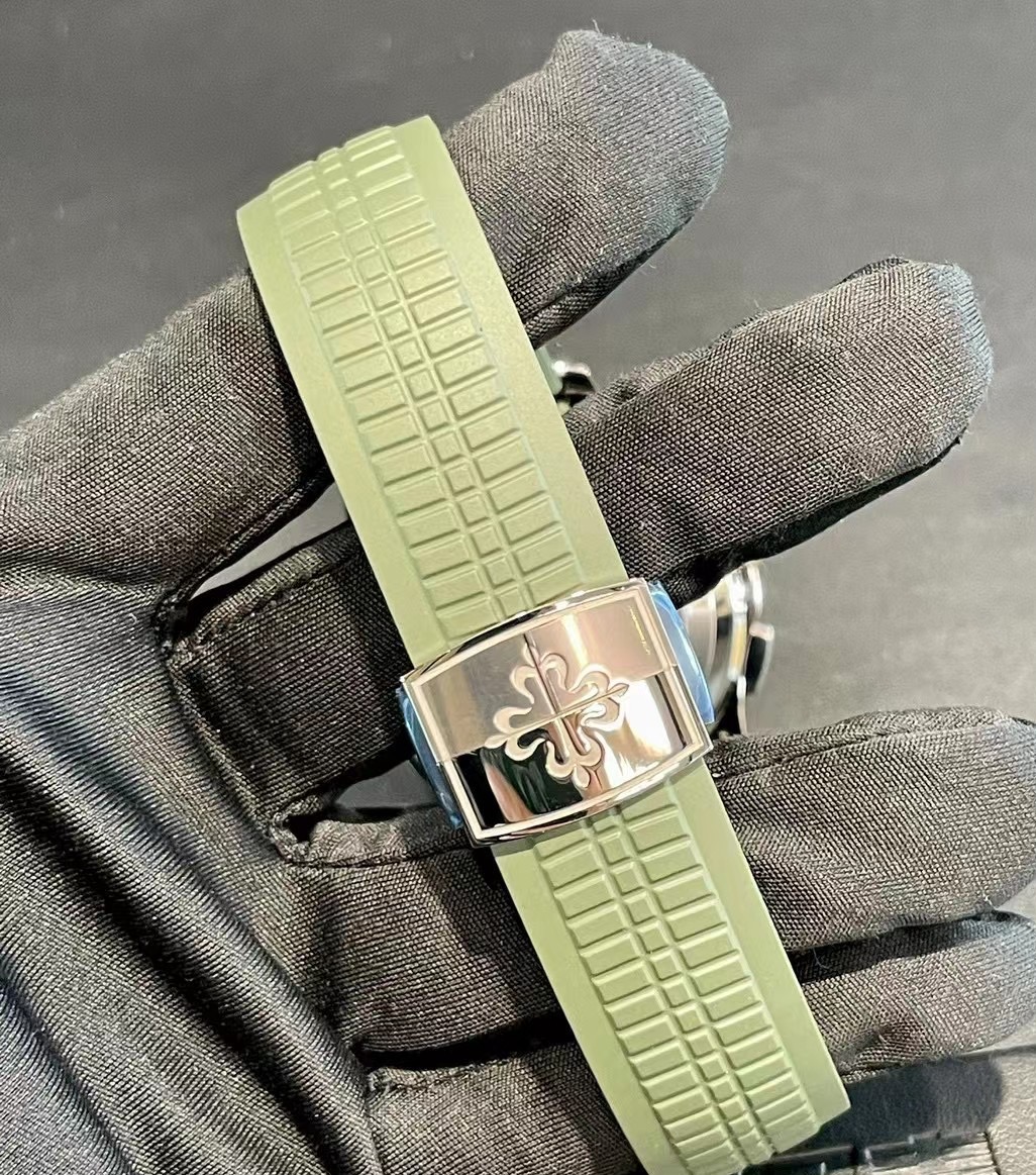 未使用百达翡丽Aquanaut系列5968G-010手雷胶带自动机械计时腕表,42.2mm表径卡其绿色大网格盘面18K白金表壳橡胶表,稀缺表款市面极少看到男女通佩戴,全套附件,公价590100