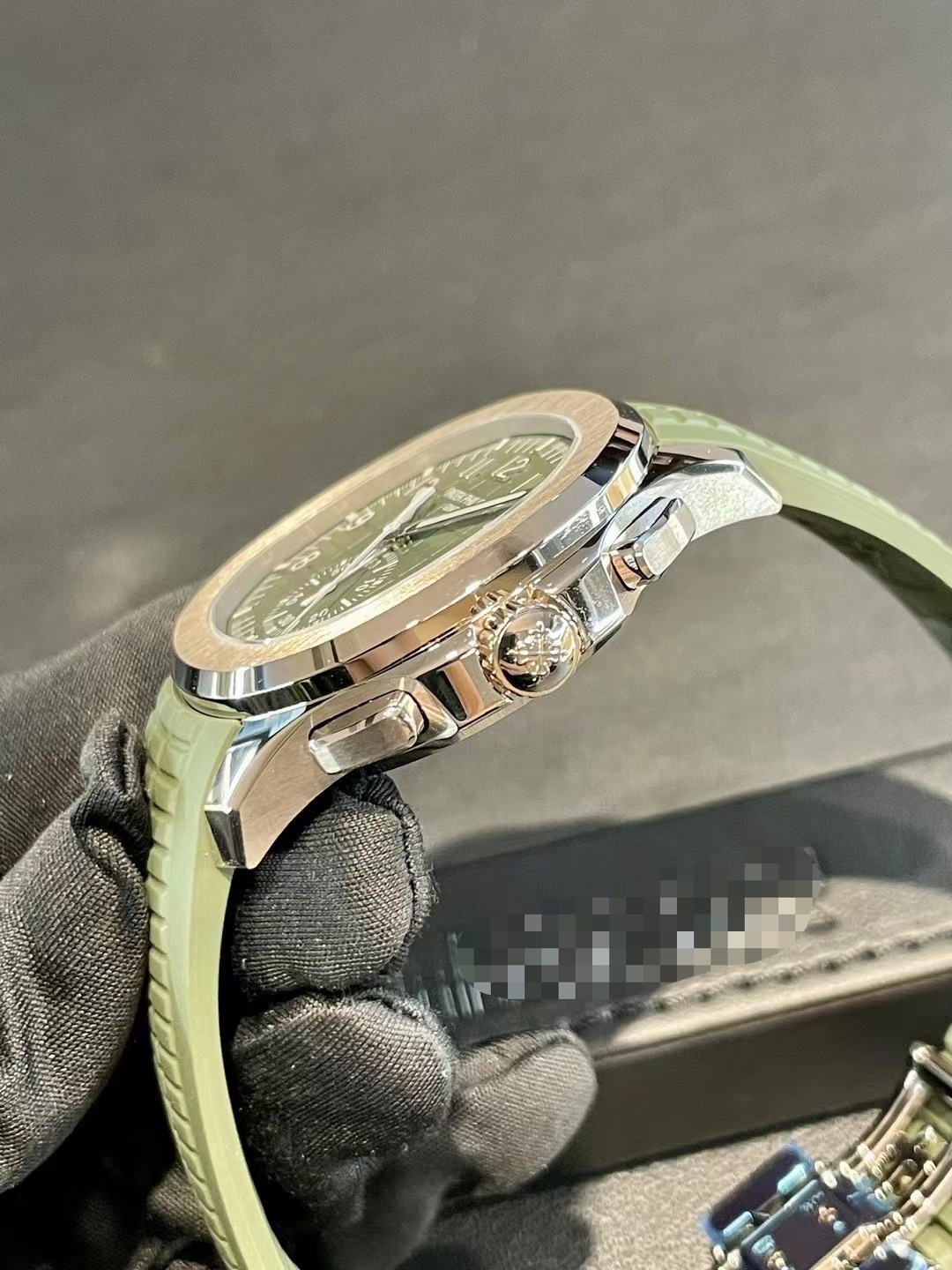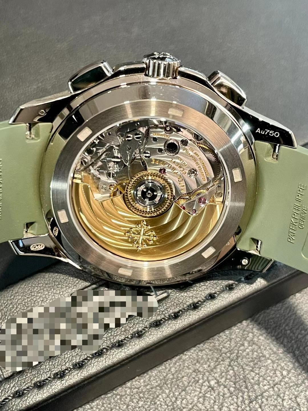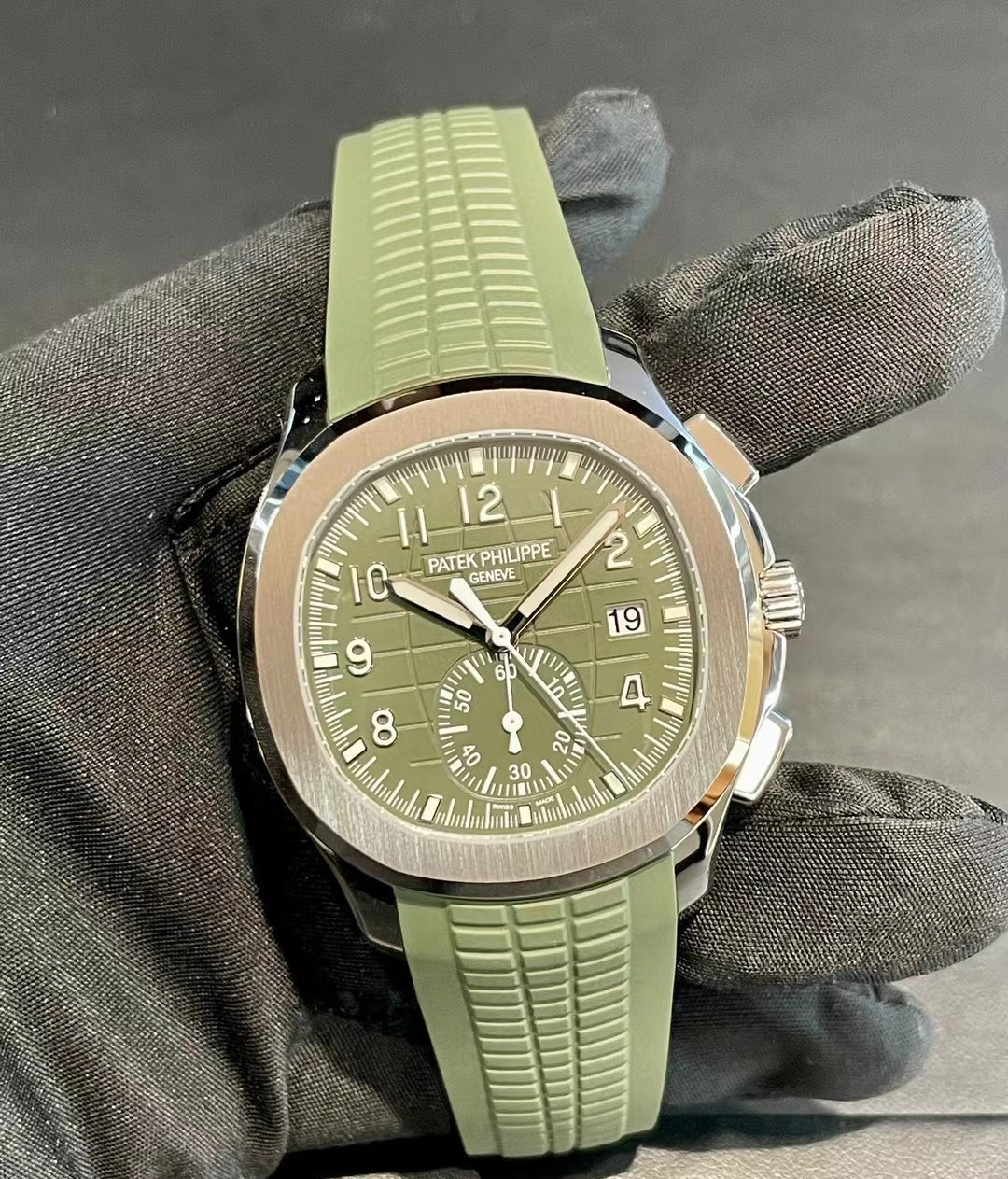 未使用百达翡丽Aquanaut系列5968G-010手雷胶带自动机械计时腕表,42.2mm表径卡其绿色大网格盘面18K白金表壳橡胶表,稀缺表款市面极少看到男女通佩戴,全套附件,公价590100