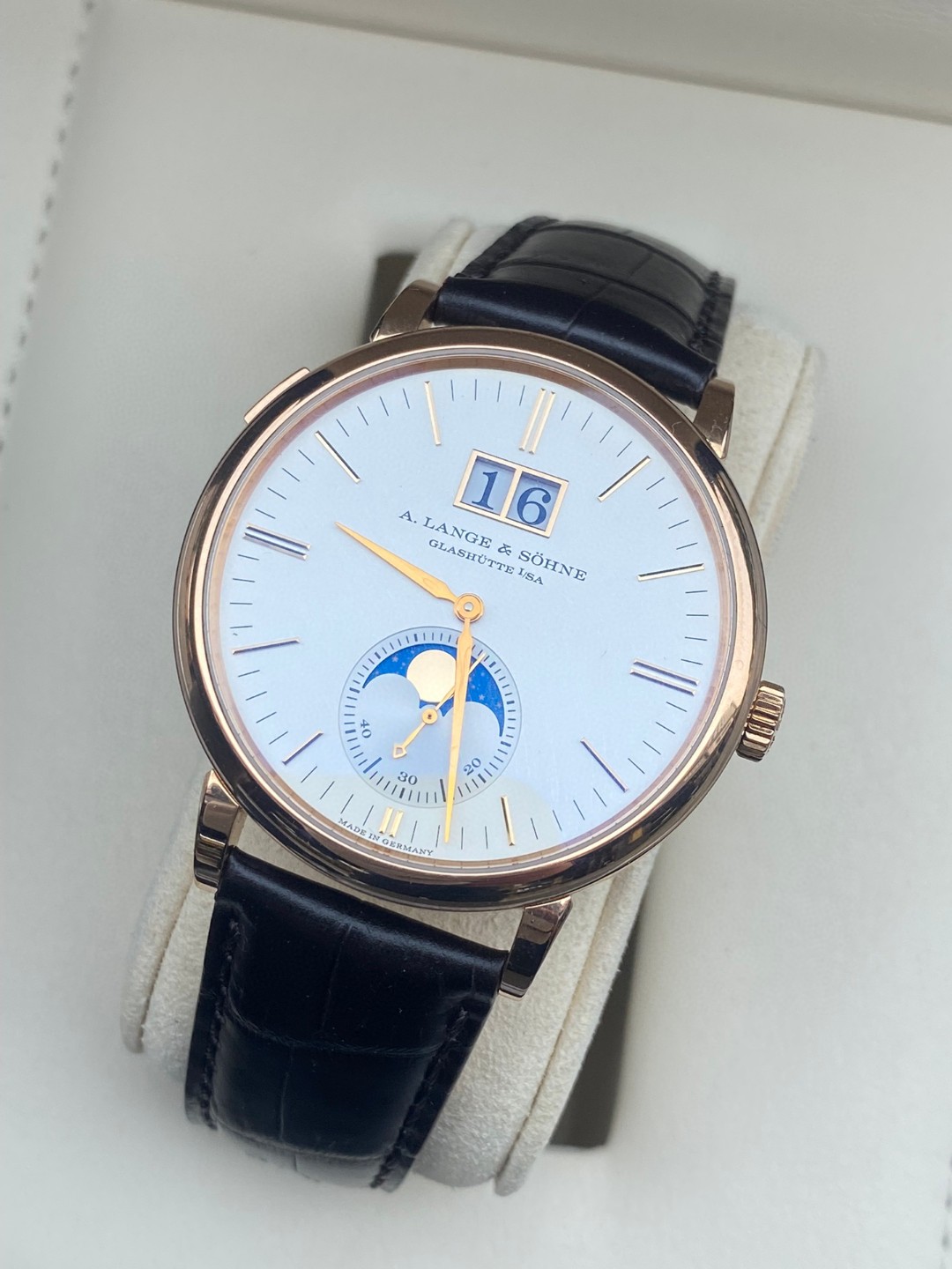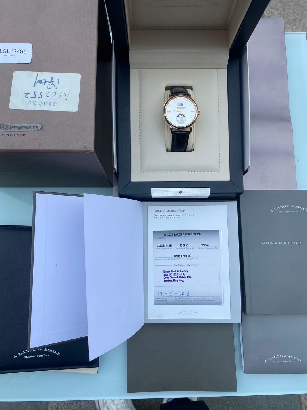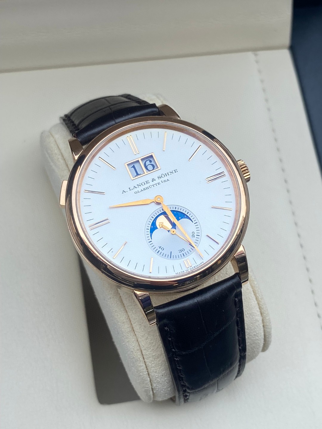 朗格萨克森系列、384.032、男士自动机械腕表、表径:40mm、材质:18k玫瑰金、皮带款、银白色盘面、条形刻度、大日历框、月相功能、黄金自动陀、2018年大全套、附件盒子一大堆、原价:257000元