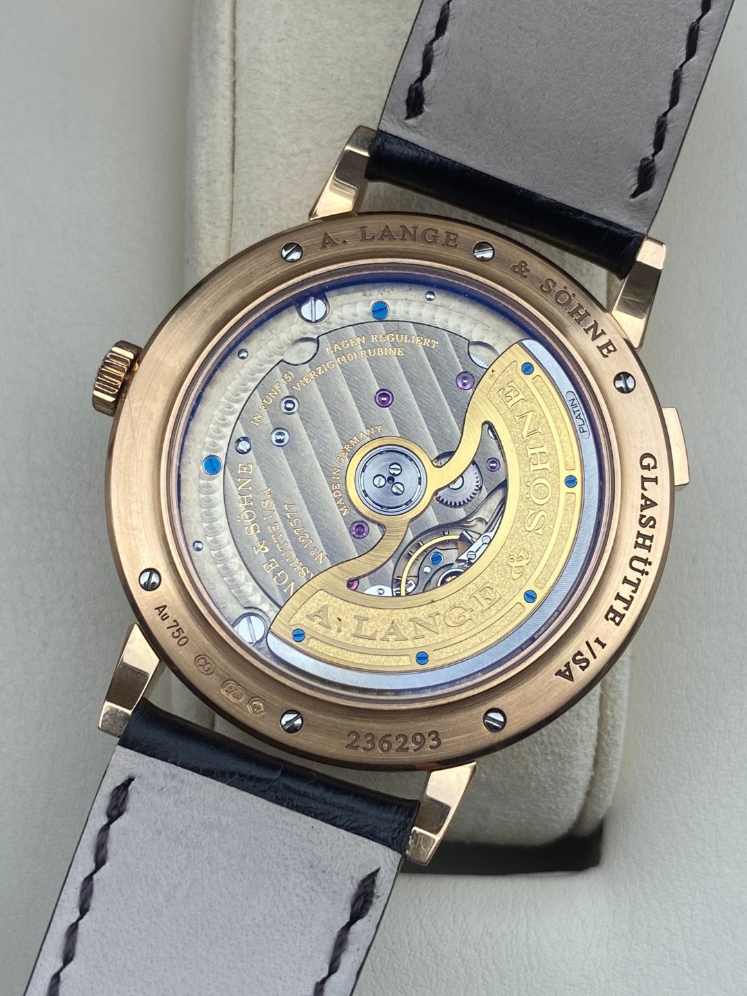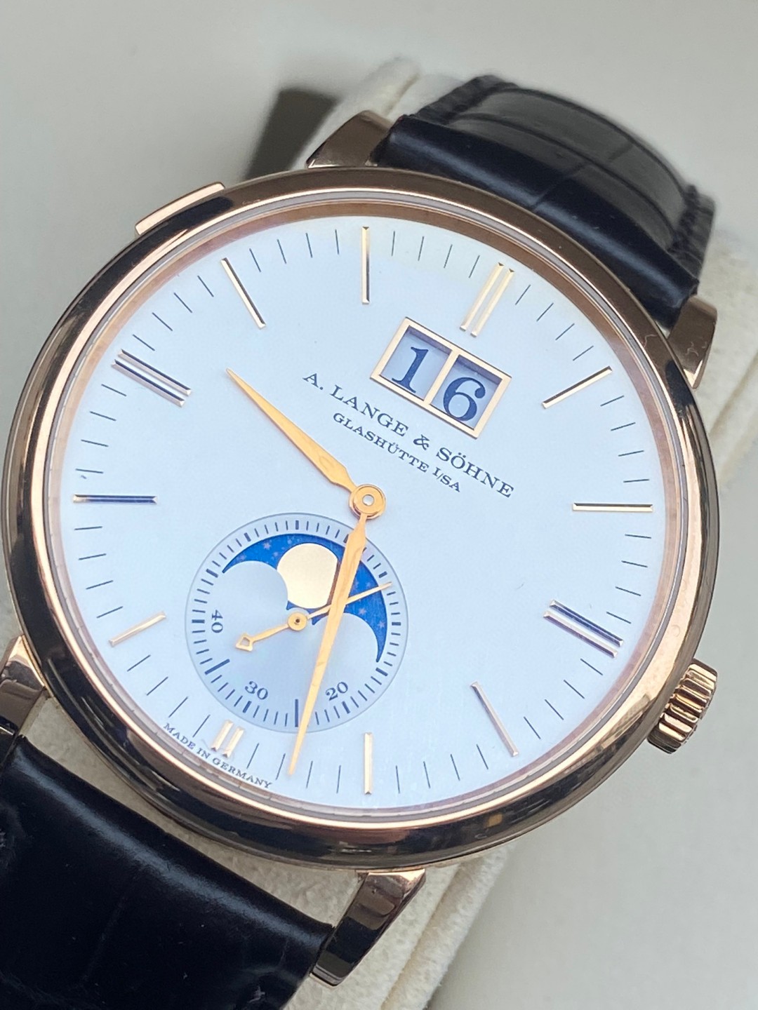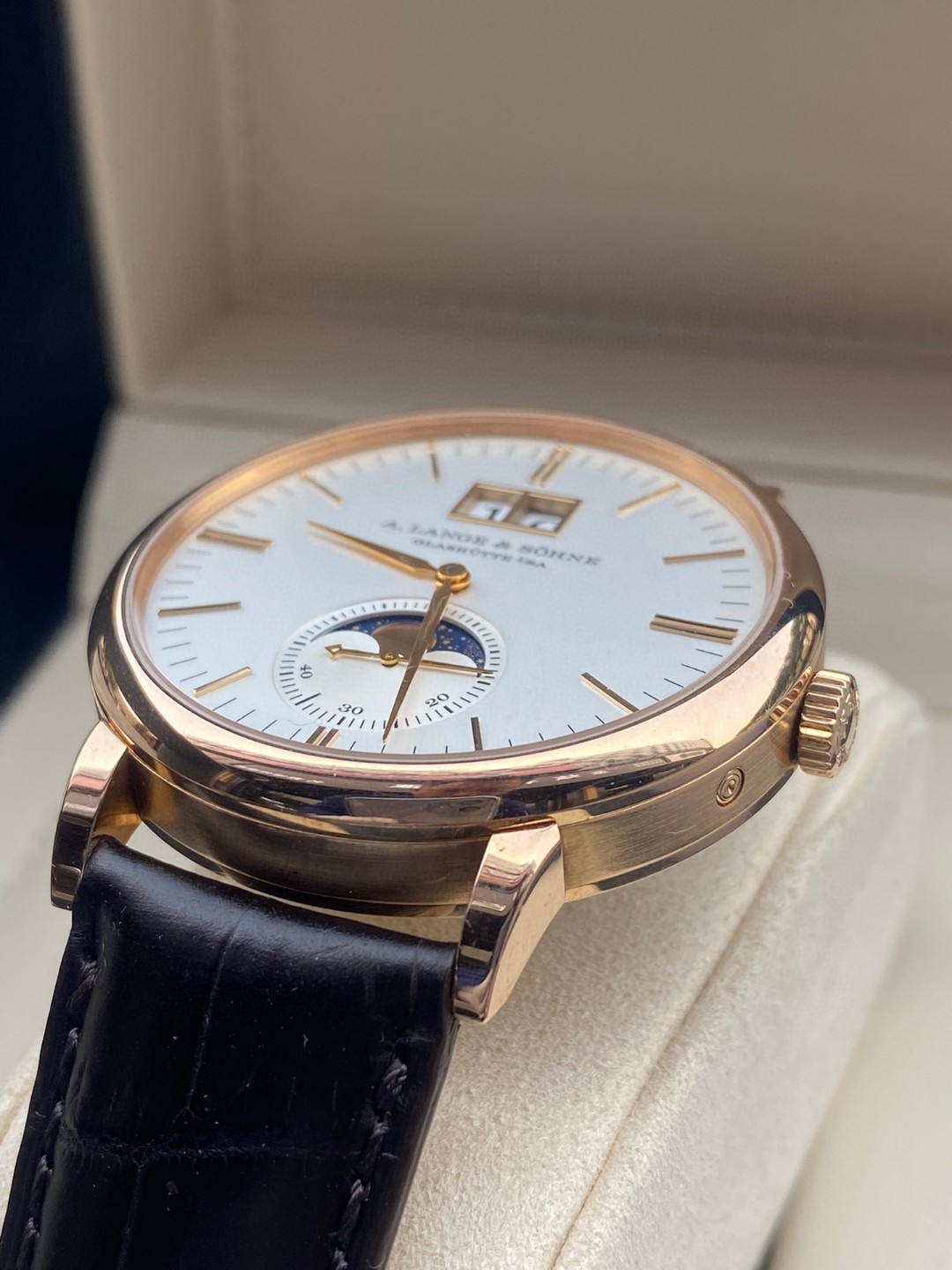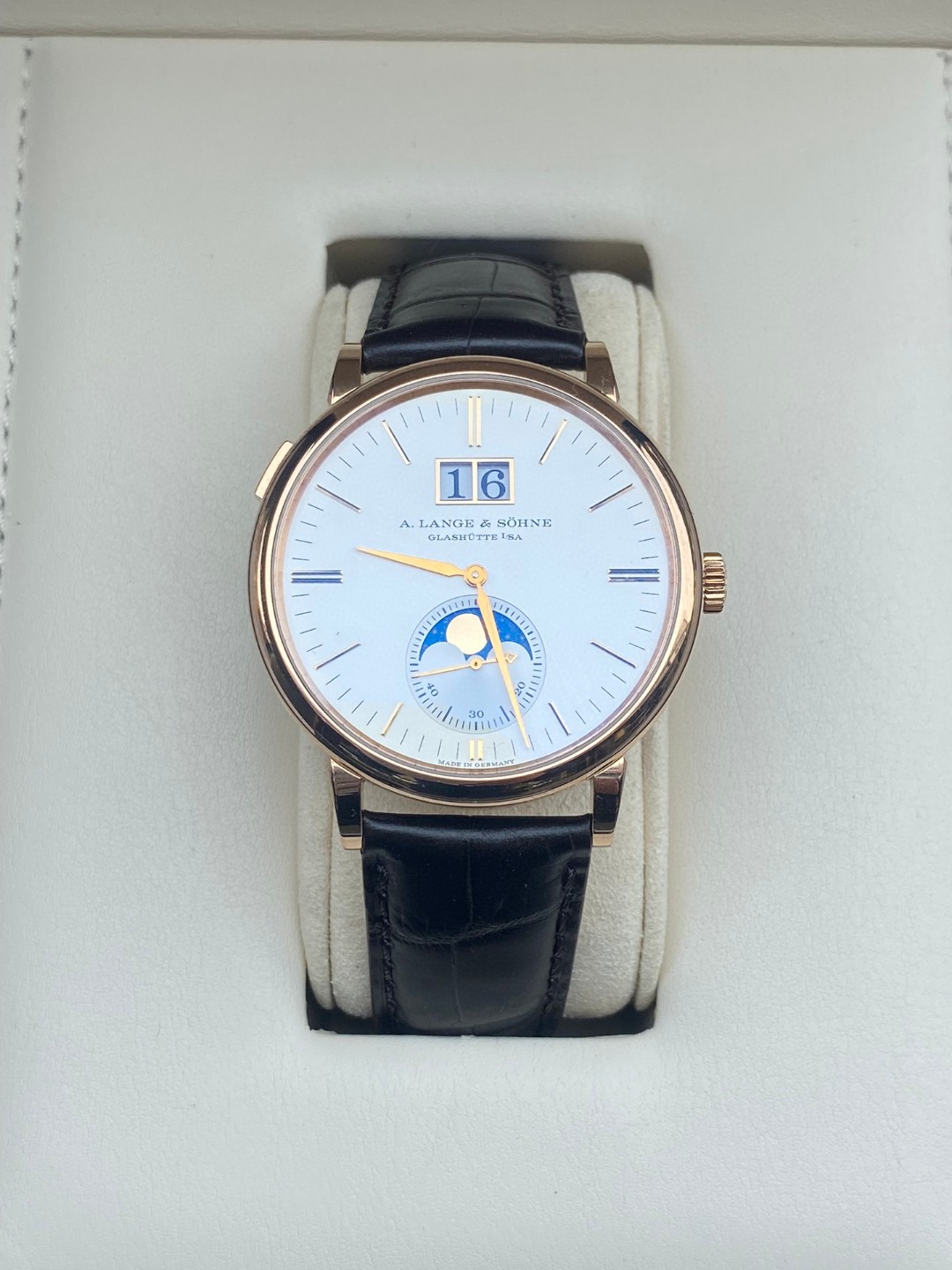 朗格萨克森系列、384.032、男士自动机械腕表、表径:40mm、材质:18k玫瑰金、皮带款、银白色盘面、条形刻度、大日历框、月相功能、黄金自动陀、2018年大全套、附件盒子一大堆、原价:257000元