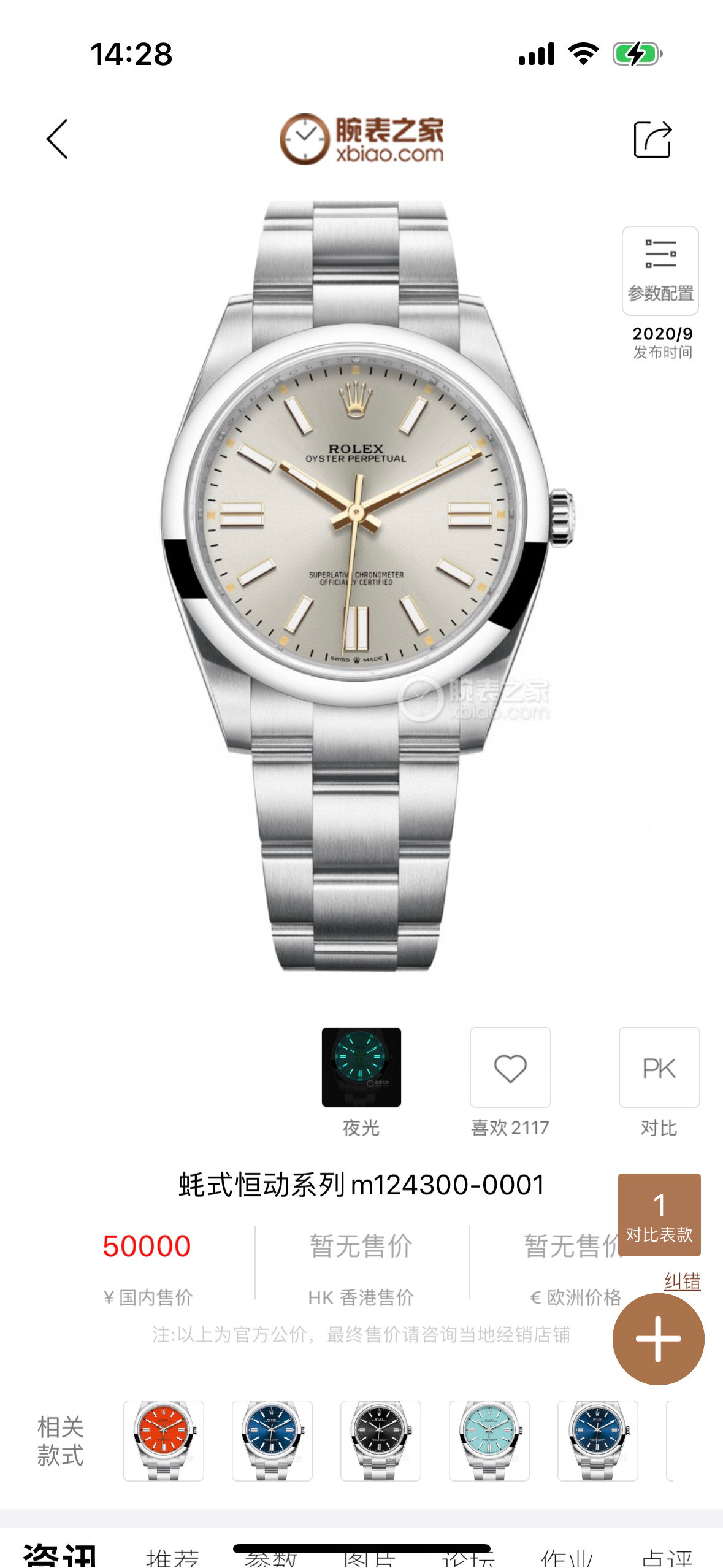 劳力士蚝式恒动系列124300 男士自动机械表 41毫米表径 蚝式钢材质 银色表盘 公价50000元