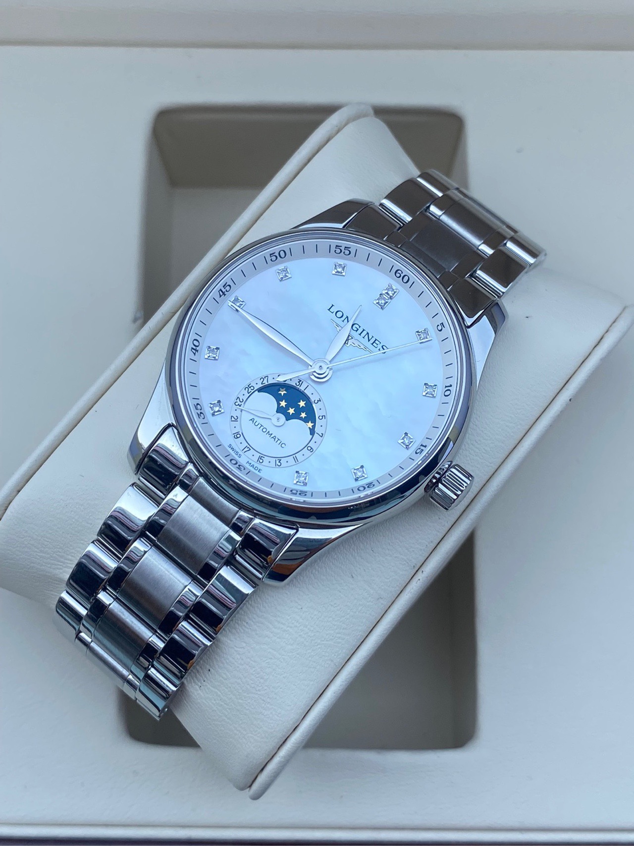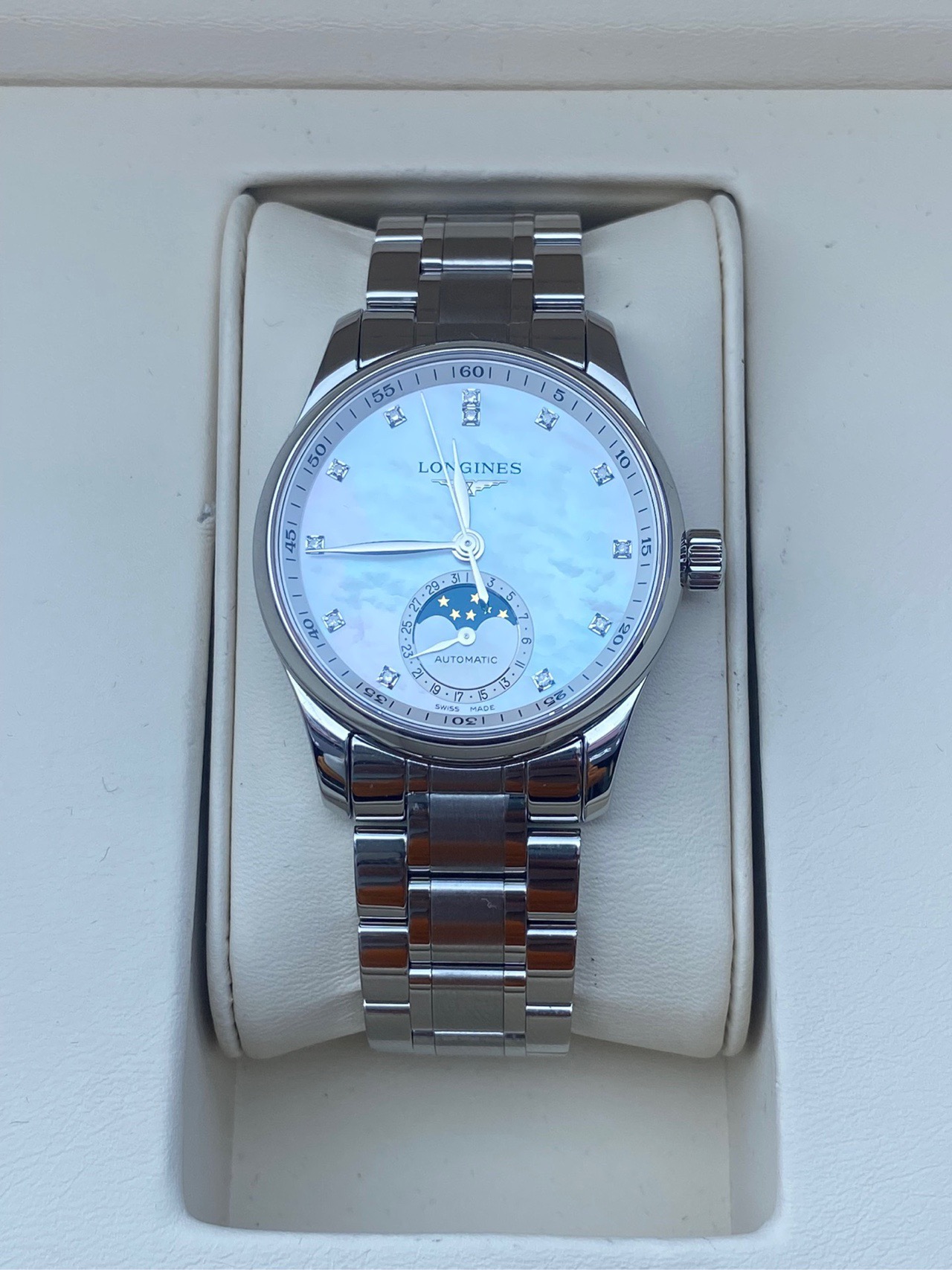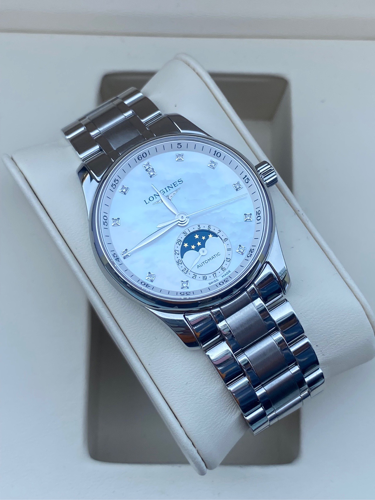浪琴名匠系列、L2.409.4.87.6、女士自动机械腕表、表径:34mm、材质:精钢/钢带、白色贝母盘面、钻石刻度、日期显示、三针月相、2022年全套附件、