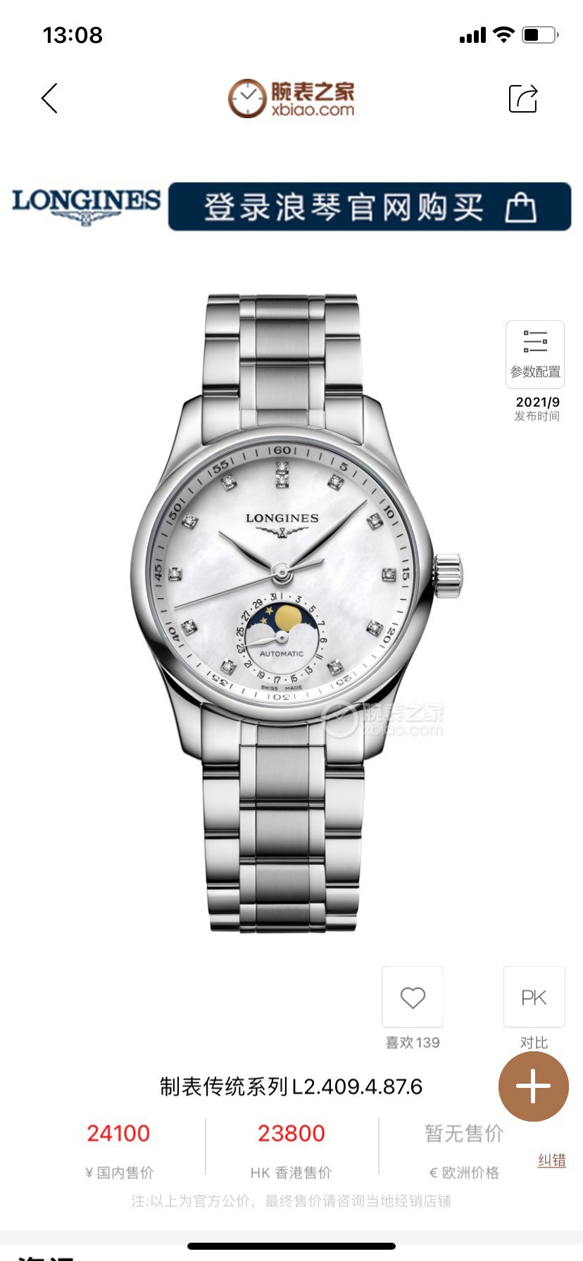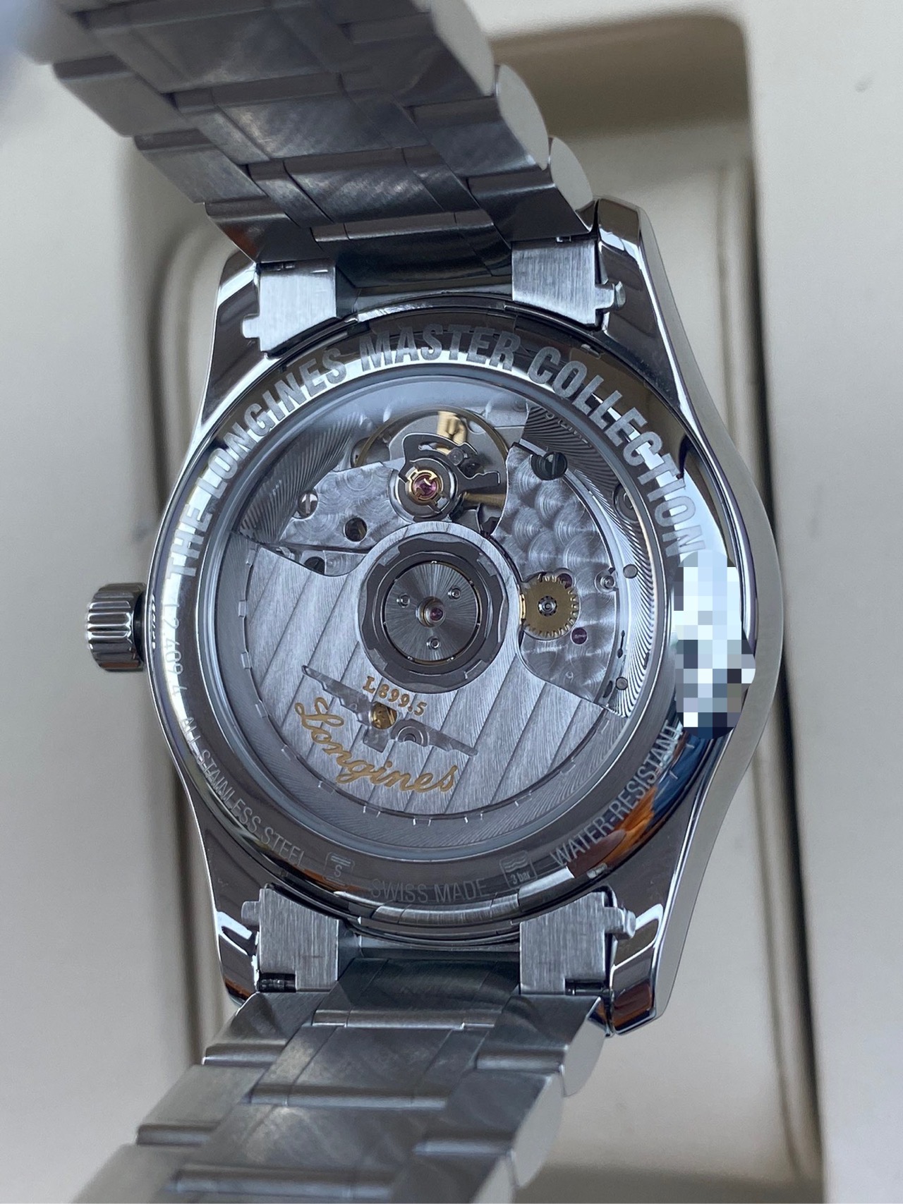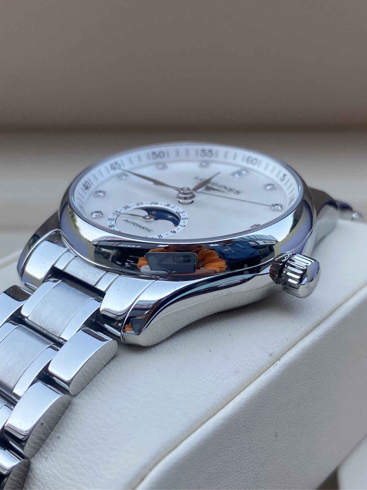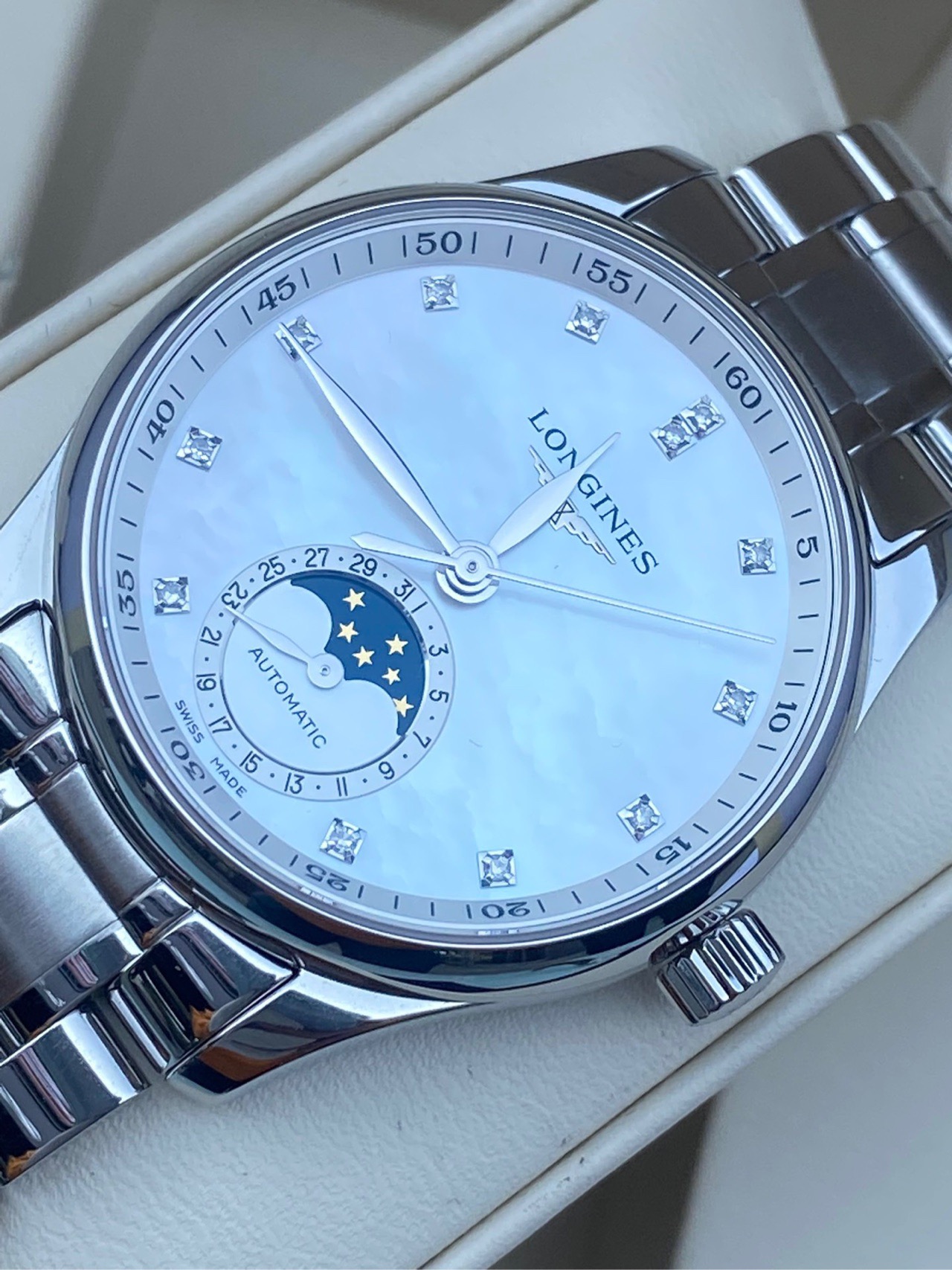 浪琴名匠系列、L2.409.4.87.6、女士自动机械腕表、表径:34mm、材质:精钢/钢带、白色贝母盘面、钻石刻度、日期显示、三针月相、2022年全套附件、
