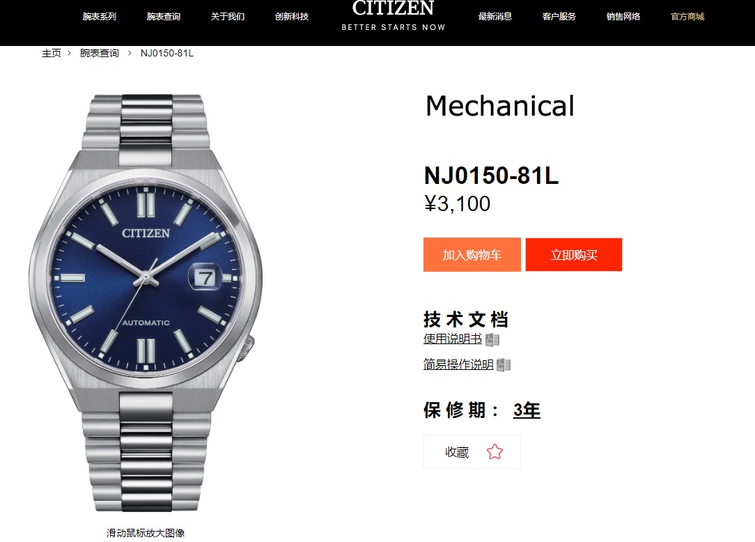 西铁城/Citizen 40MM 不锈钢 机械 男表 NJ0150-81L