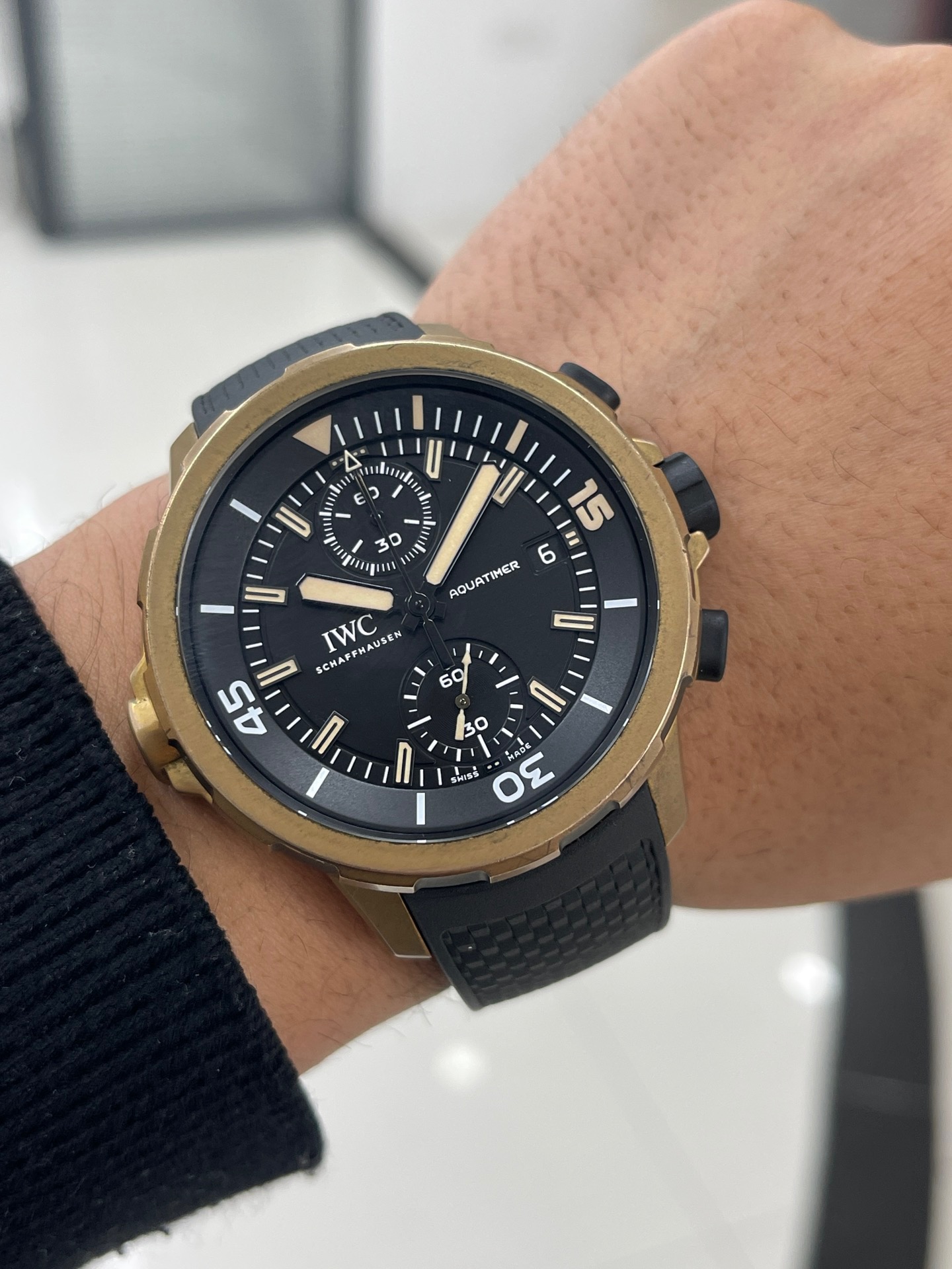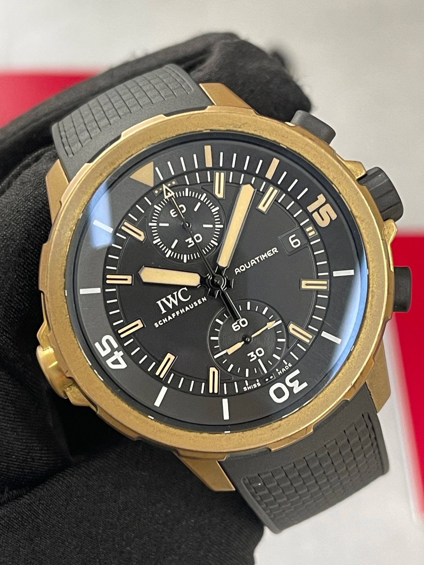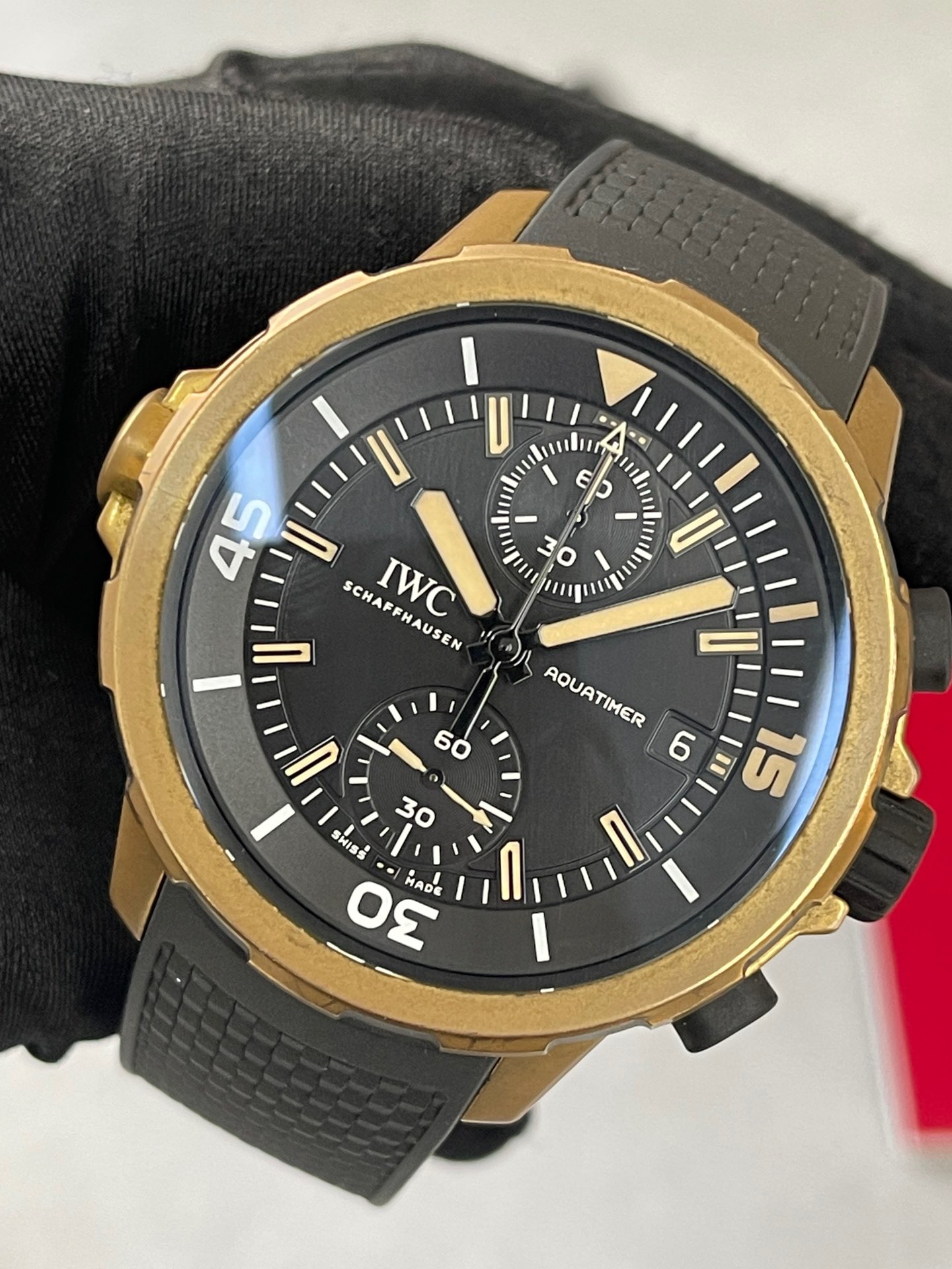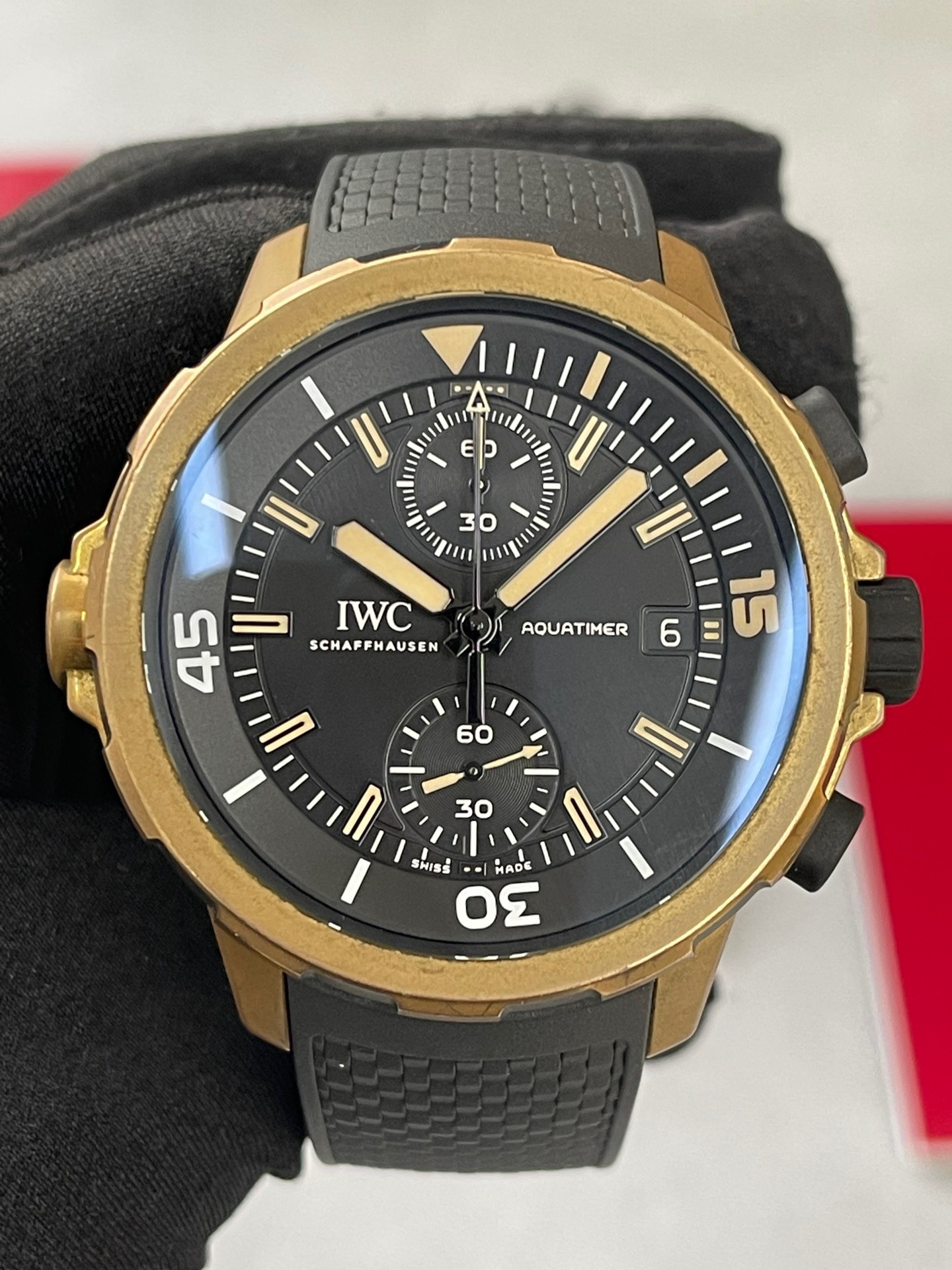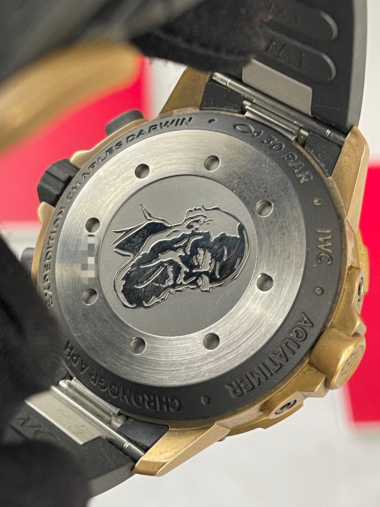 全套万国海洋计时系列型号IW379503,IWC首款青铜自动机械腕表“达尔文探险之旅”特别版,青铜表壳,产量稀少,表径44毫米,黑色盘面,可旋转外圈,快拆表带,表背上雕刻达尔文的头像,防水300米,动力储备60小时 原价83000,好价