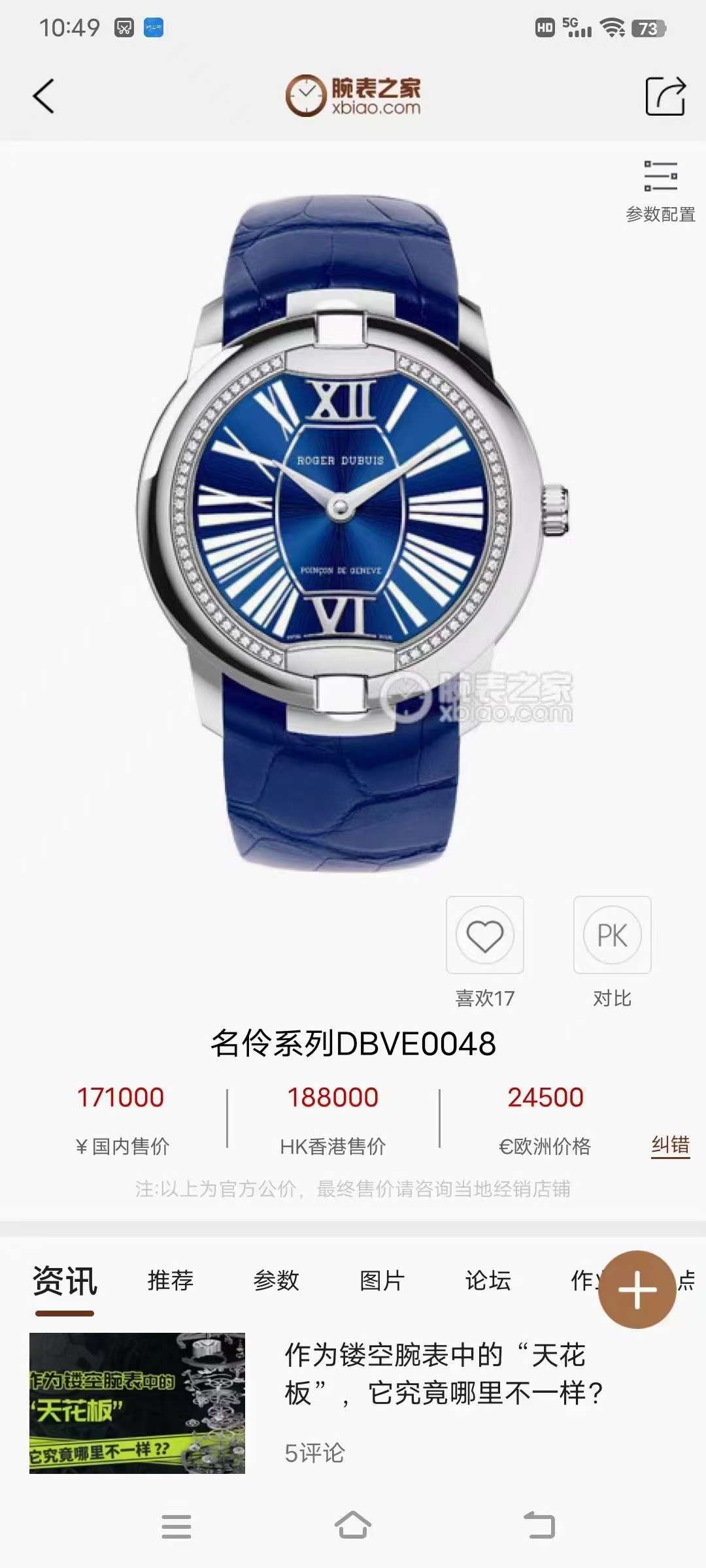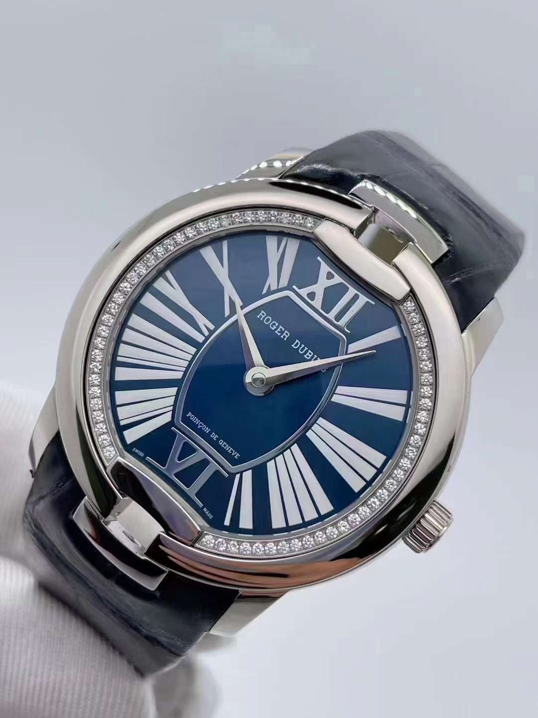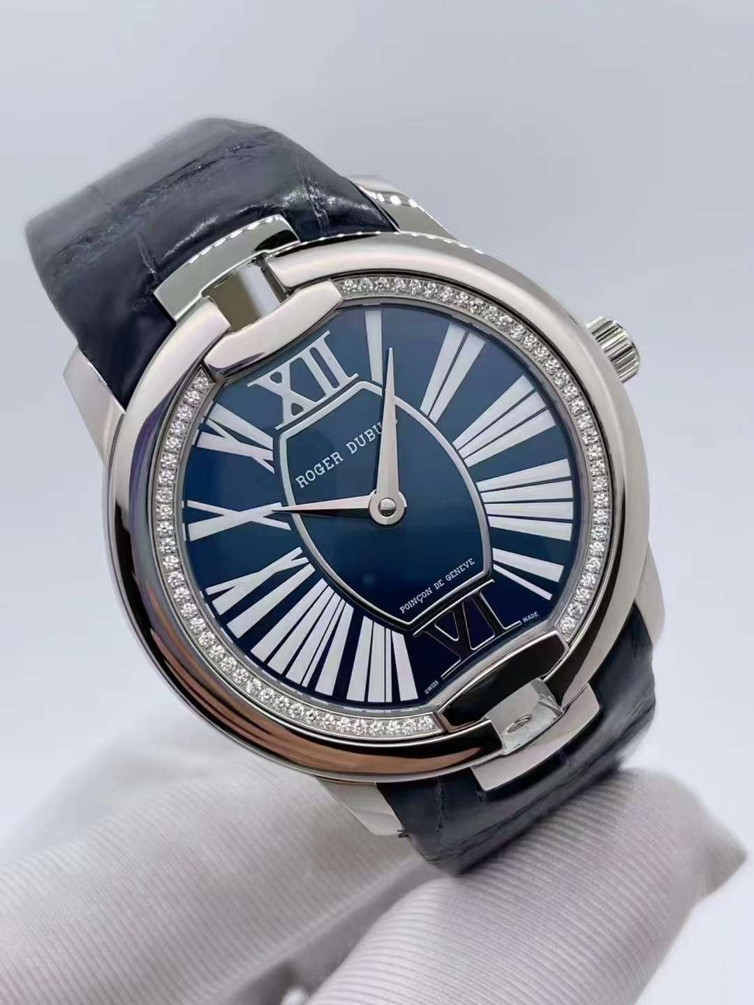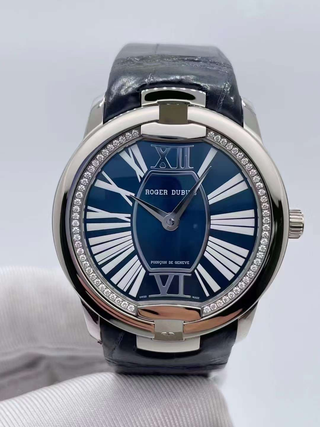 罗杰杜彼名伶系列DBVE0048自动机械女士腕表,表径36,蓝色表盘18k金镶嵌一圈钻石,单表超好品相