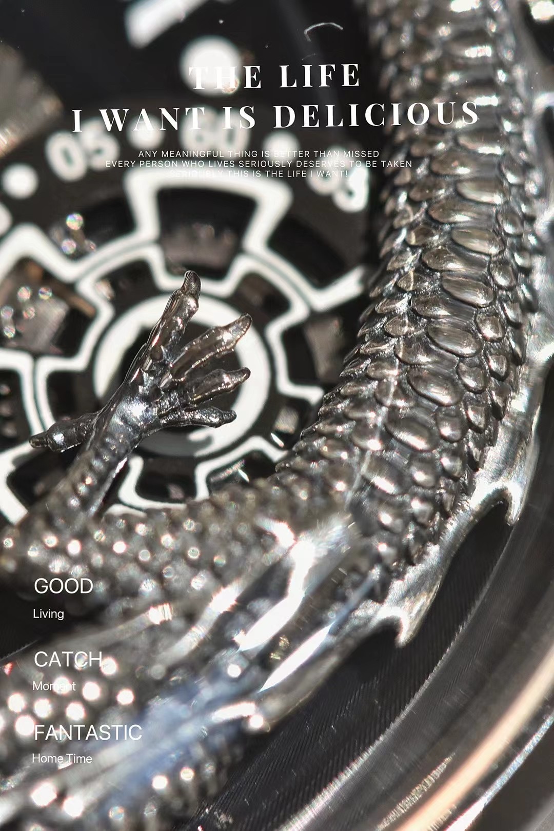 盘面特点:盘旋一条925纯银立体雕刻的龙,龙口则是24纯金龙珠在每个整点瞬间吐出,经过一小时缓慢收回,如此循环。