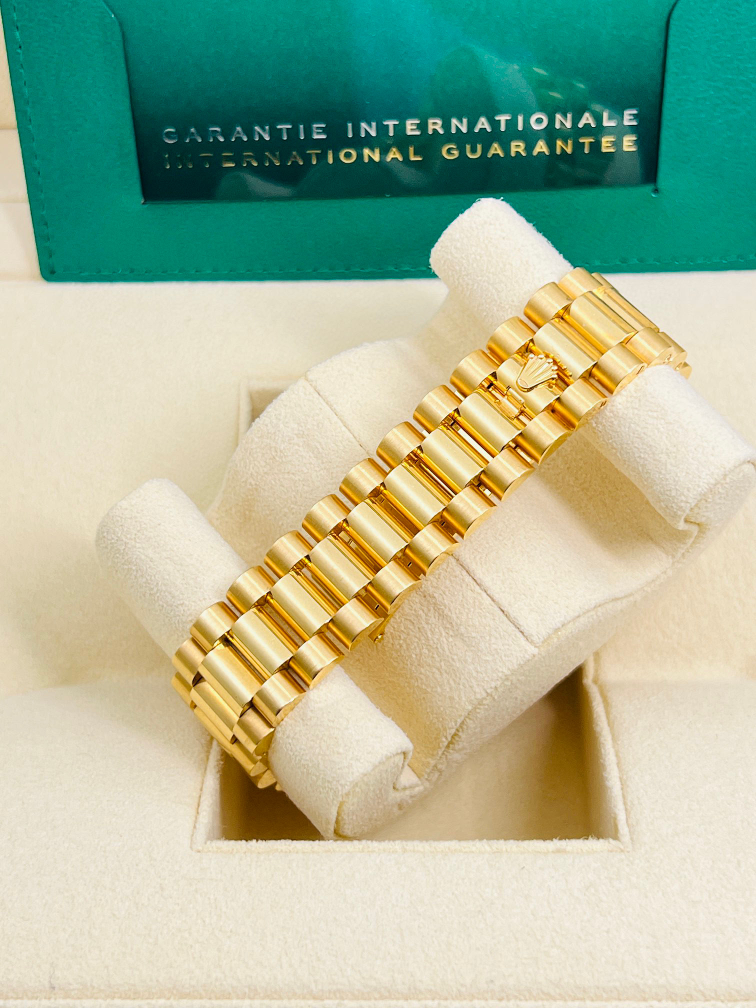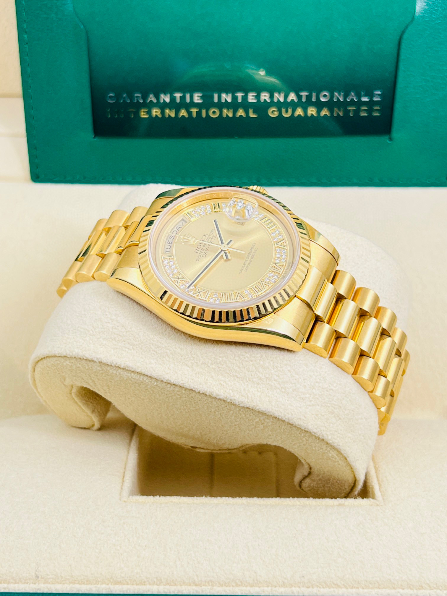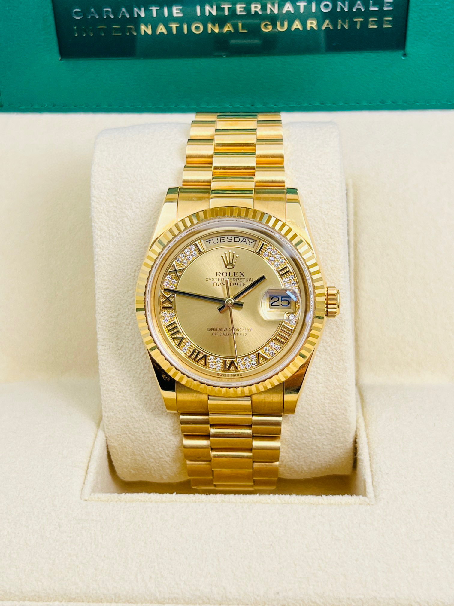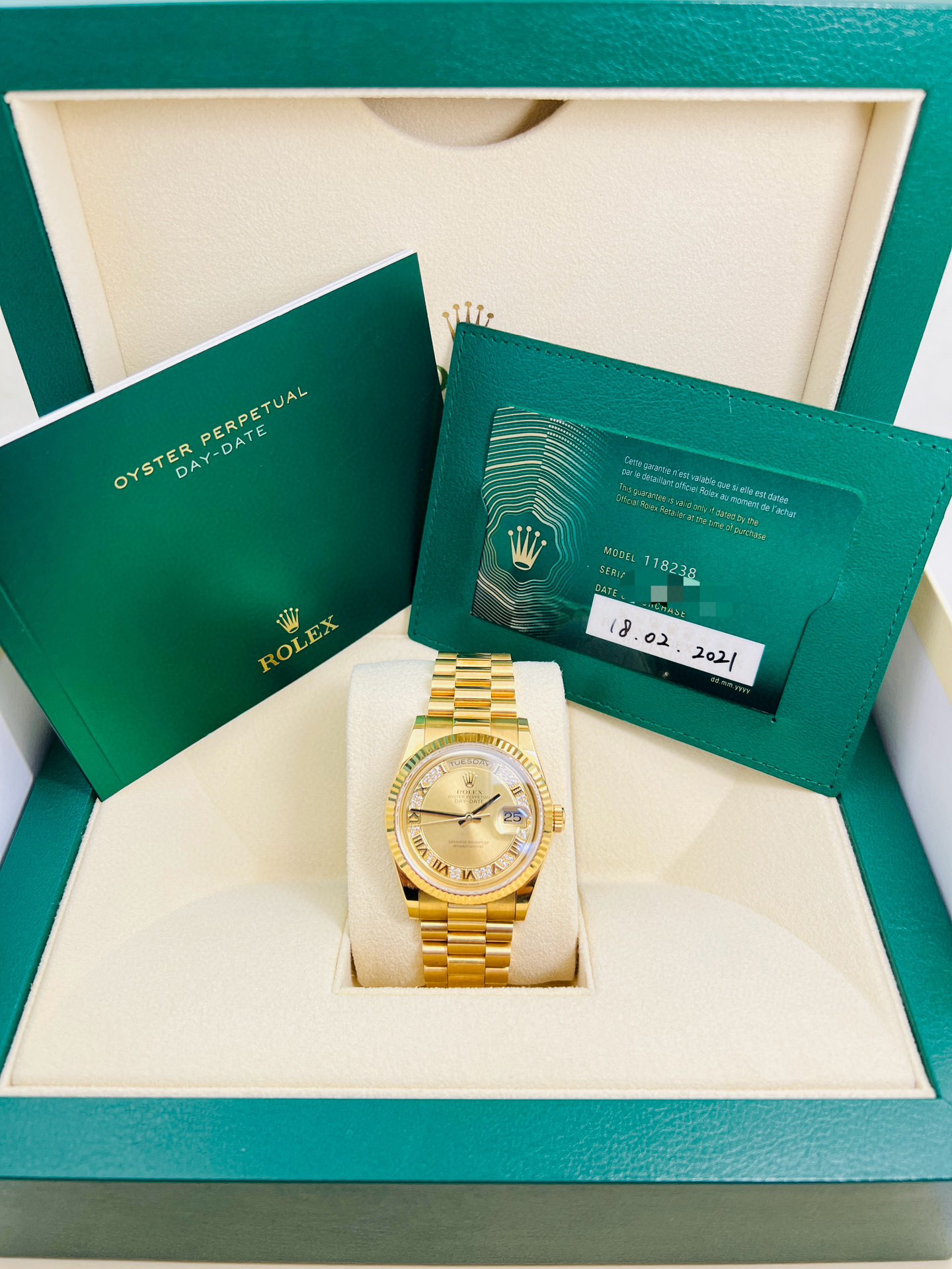 劳力士星期日历型M118238-0126腕表 自动机械 36毫米表径 18K黄金表壳 镶钻黄金表盘 有“进”有“赚” 难得21年新款保卡全套 公价275100 现货好价