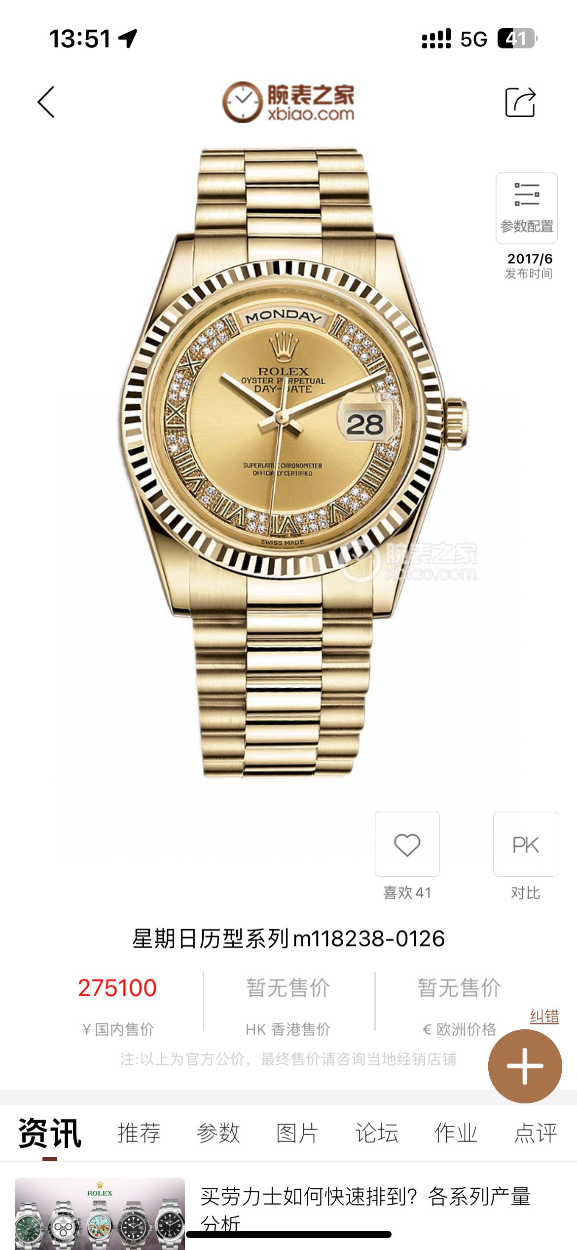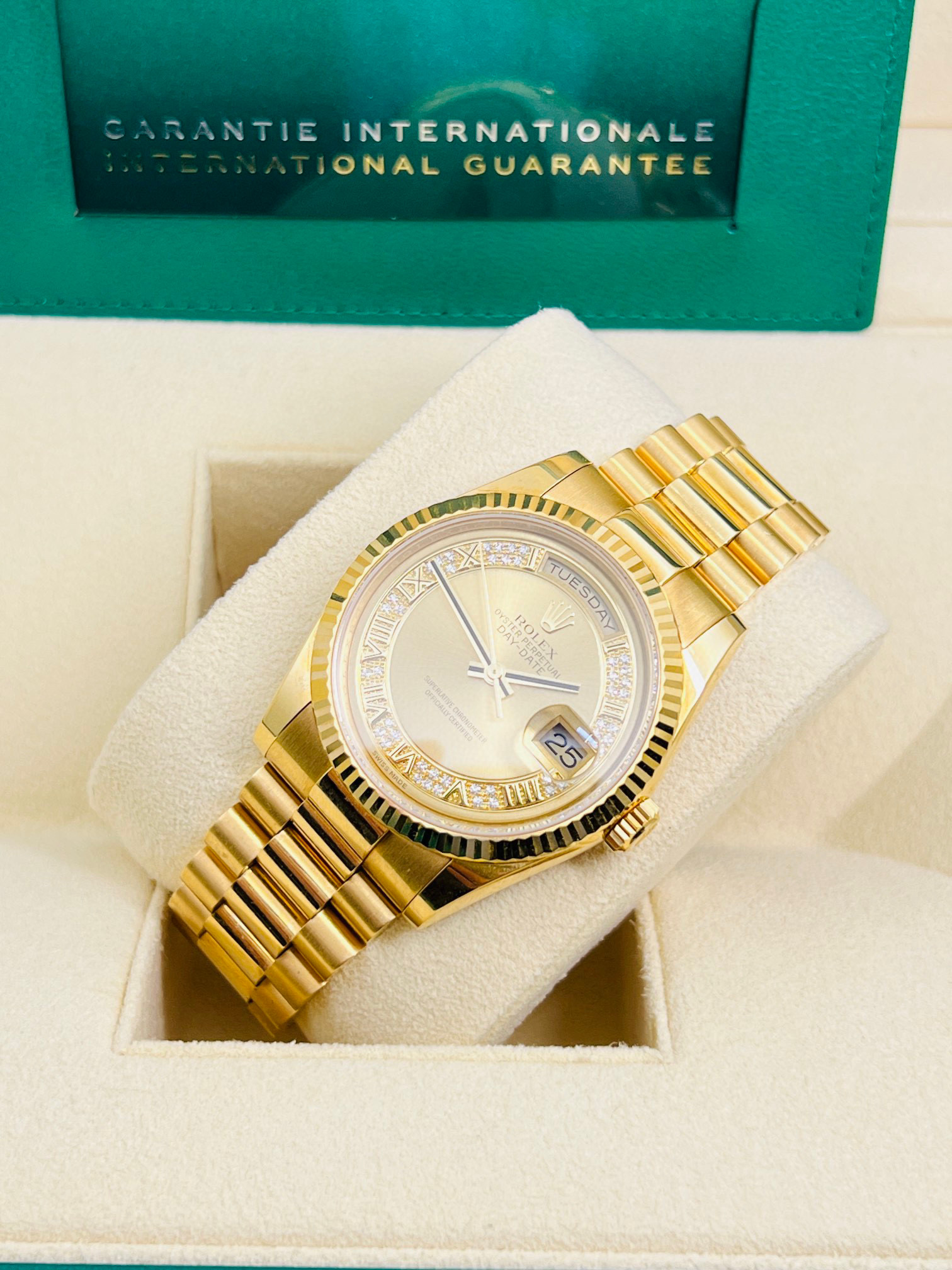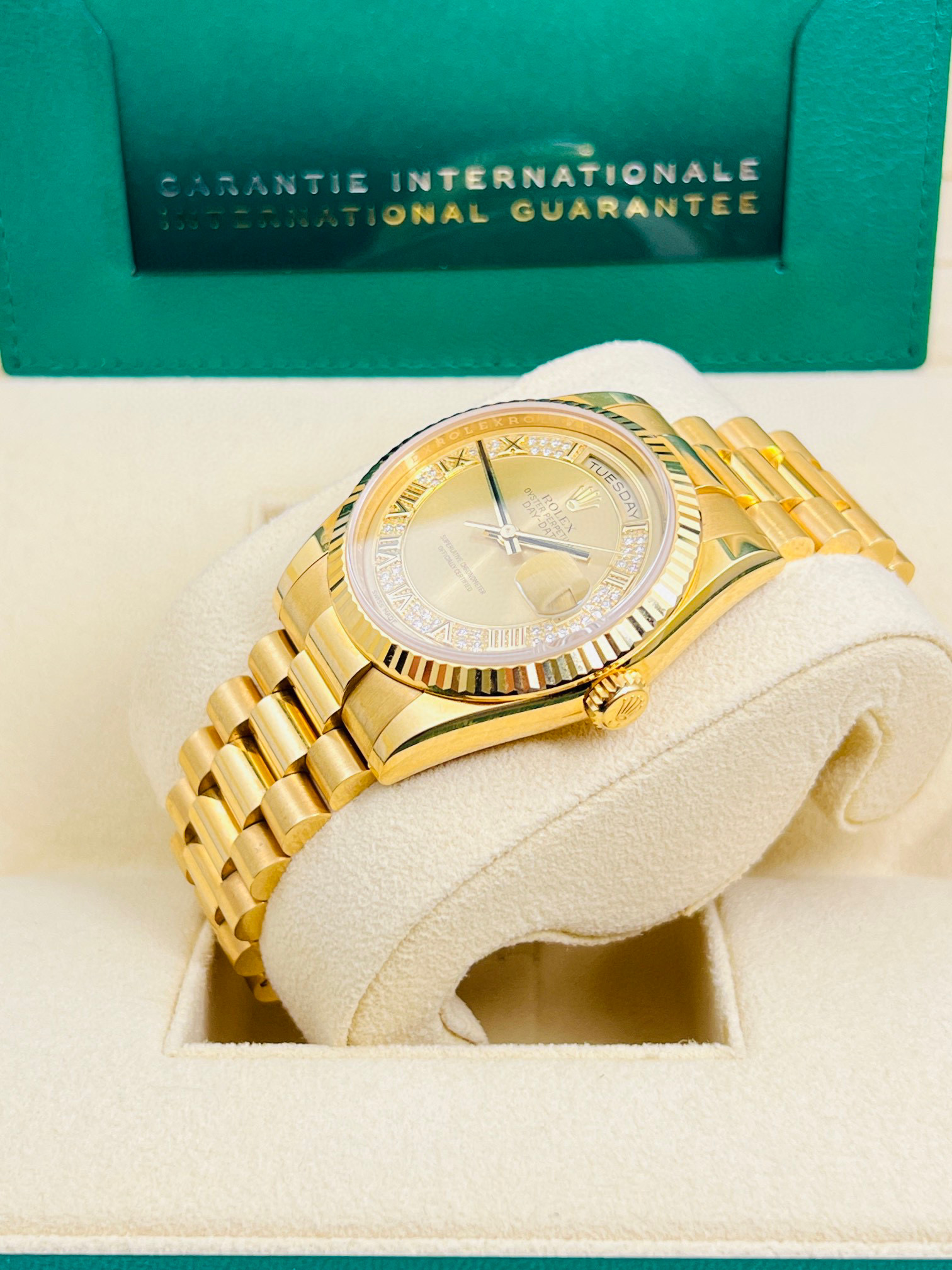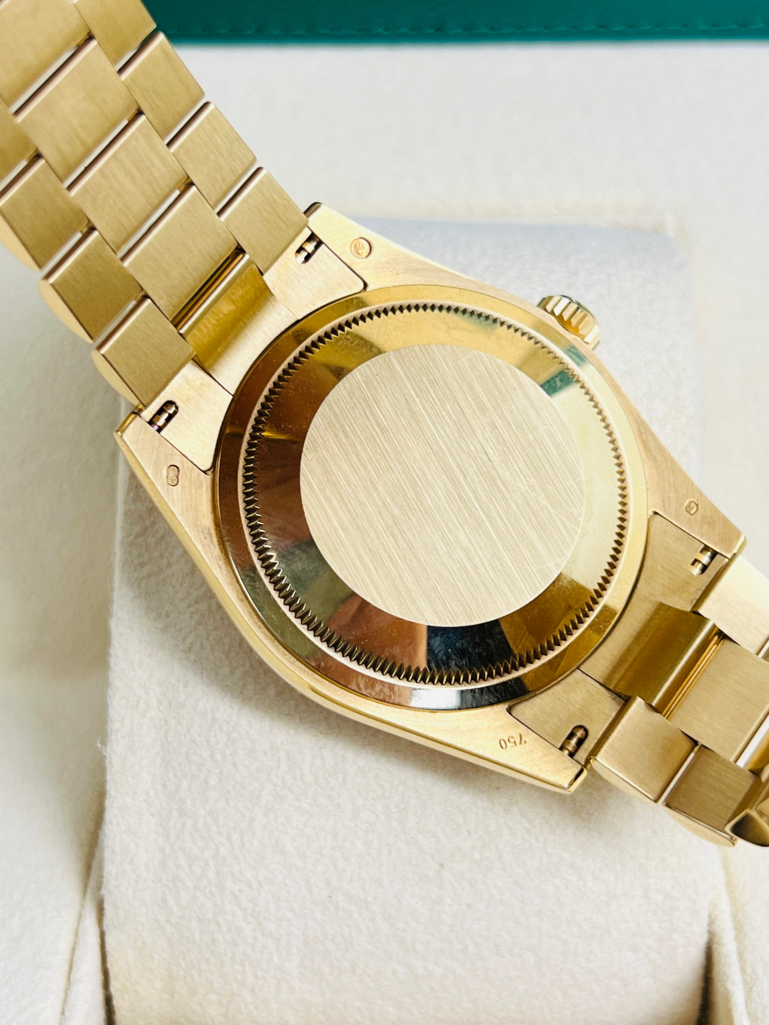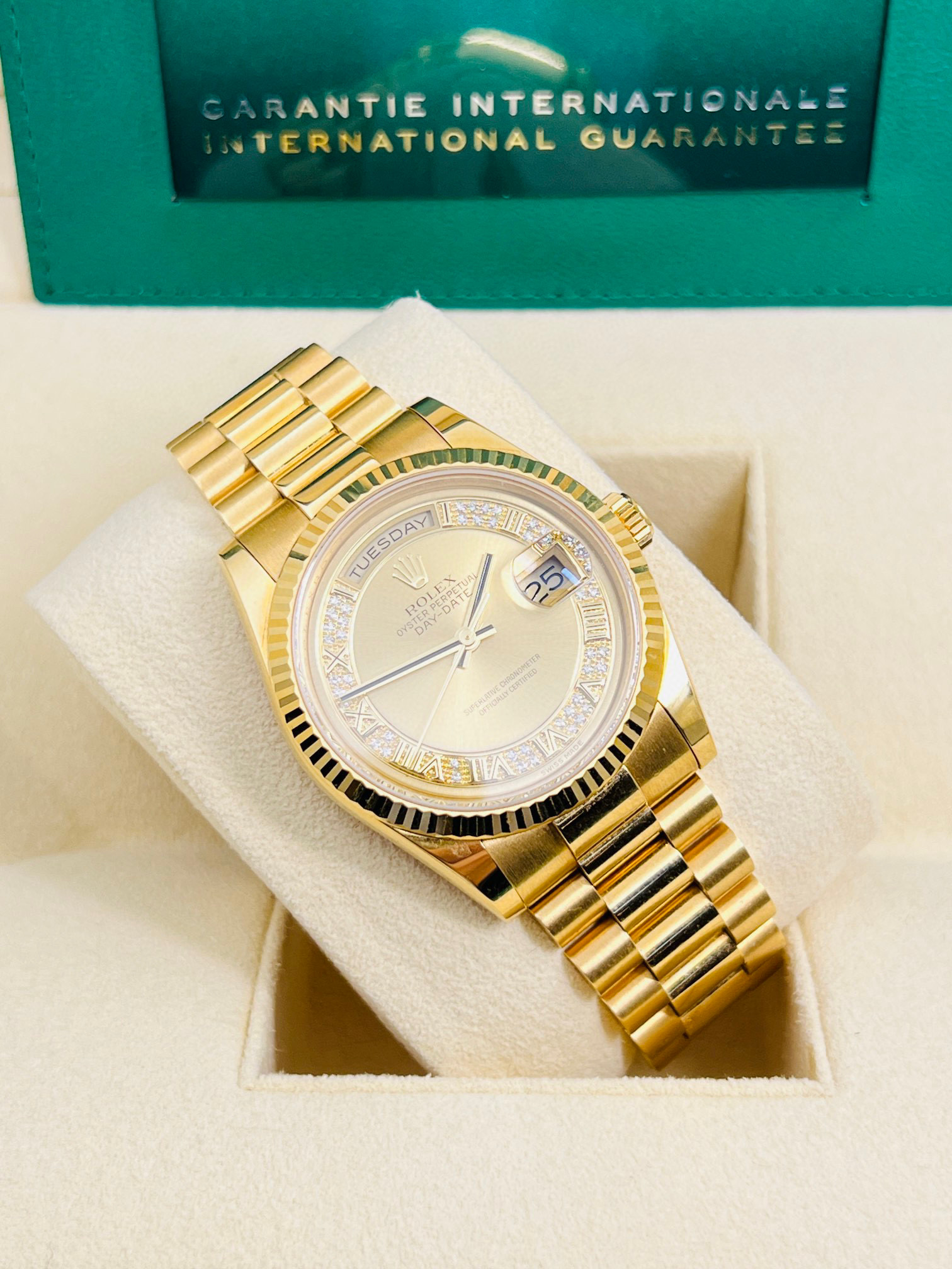 劳力士星期日历型M118238-0126腕表 自动机械 36毫米表径 18K黄金表壳 镶钻黄金表盘 有“进”有“赚” 难得21年新款保卡全套 公价275100 现货好价