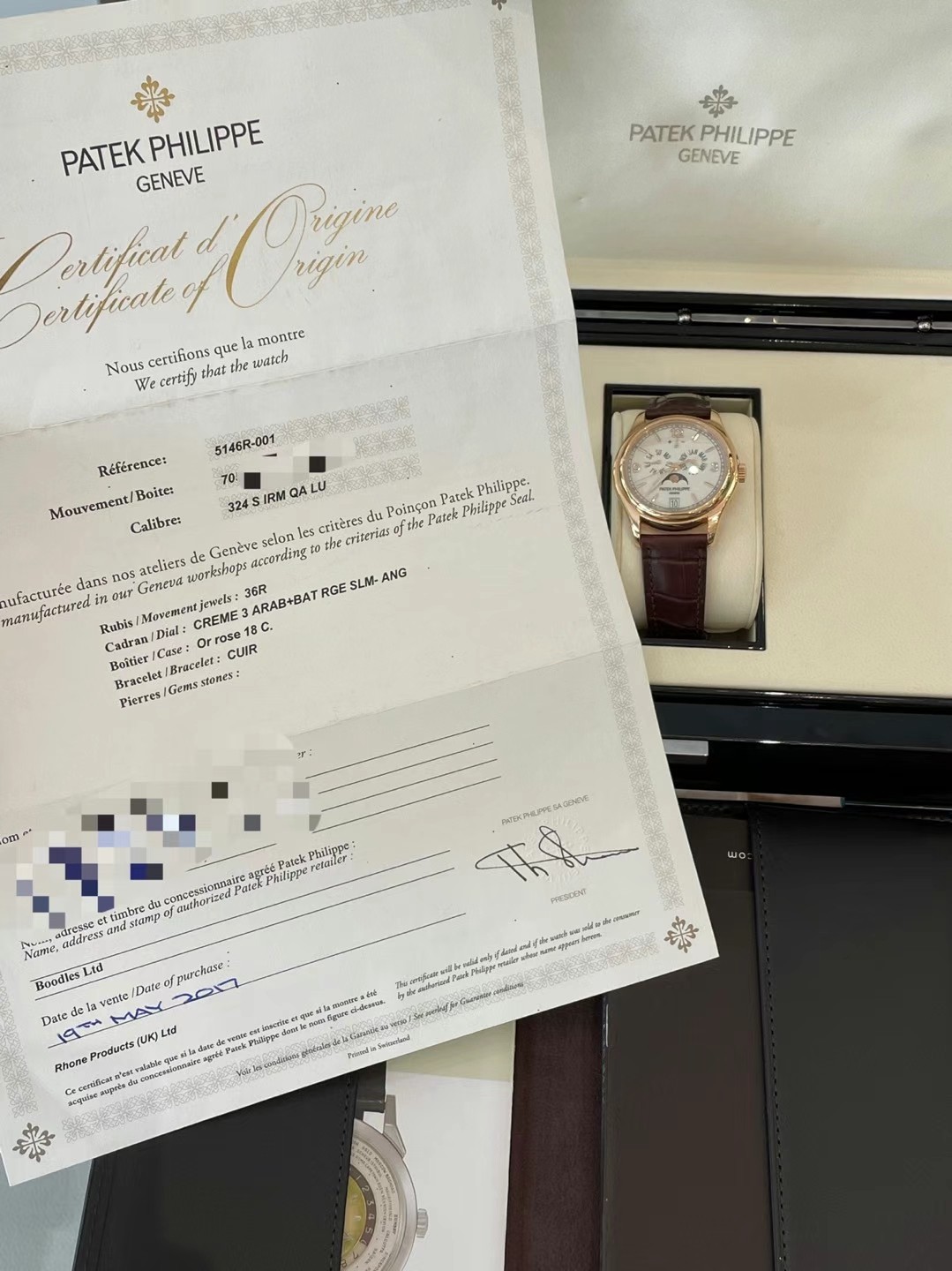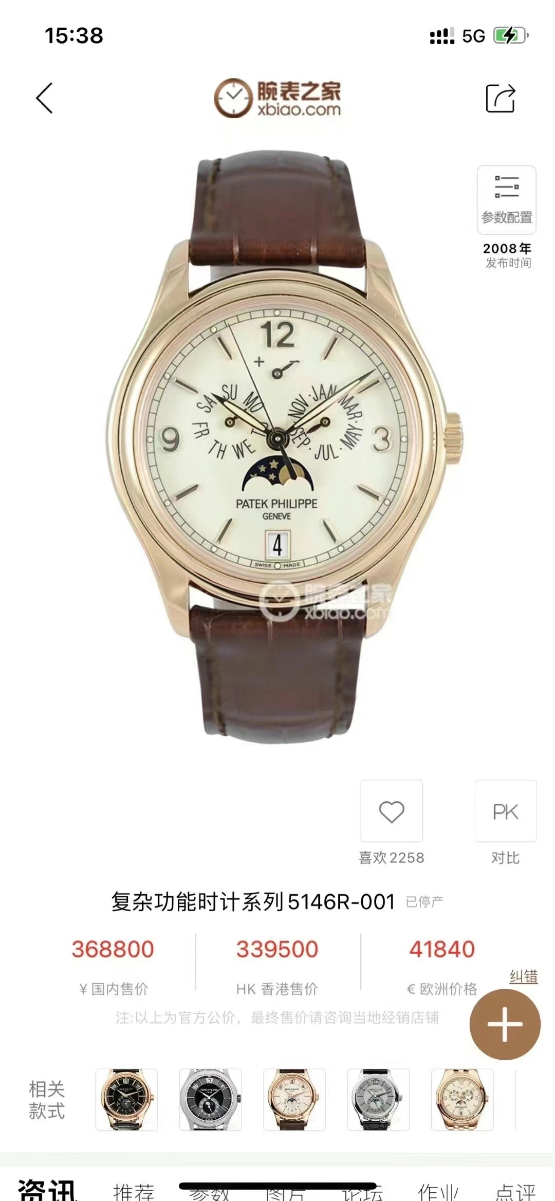 百达翡丽 5146R 18k玫瑰金材质 表盘直径39mm,公价368800,17年全套