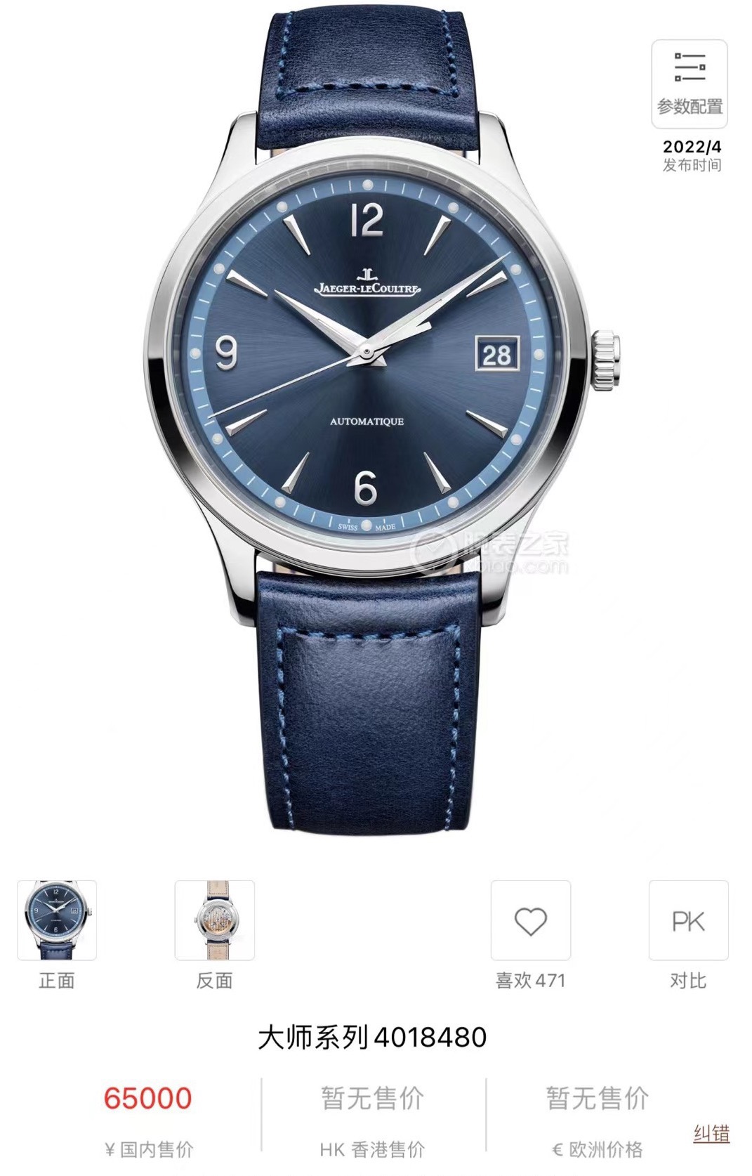 家新款大师限量新款蓝盘 型号:Q4018480,蓝色表盘,40表盘,限量发行800枚 工8年联保 公价65000现在好价