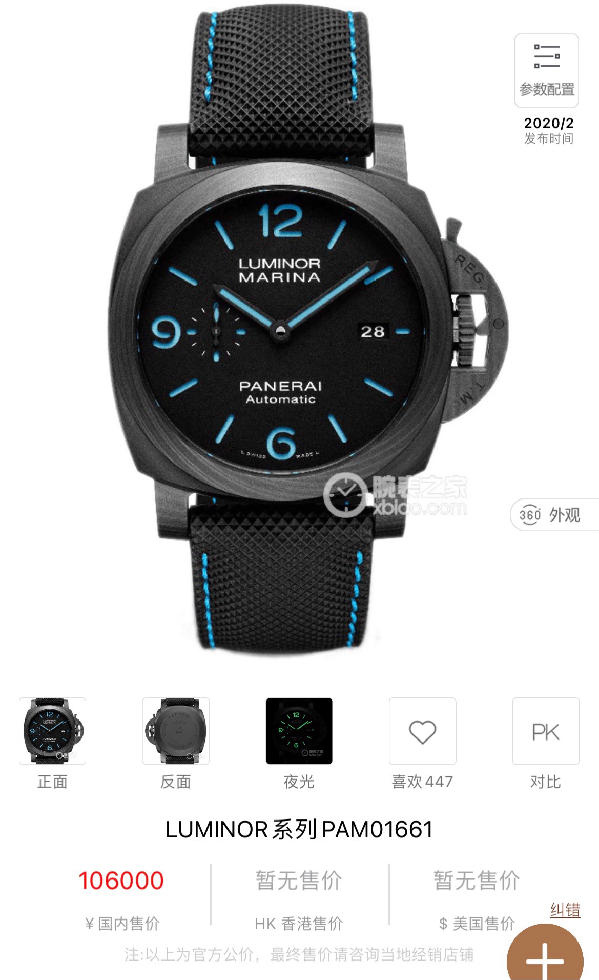 沛纳海,LUMINOR系列 PAM01661新款复合碳纤维,44毫米自动机械男士腕表。全套未使用