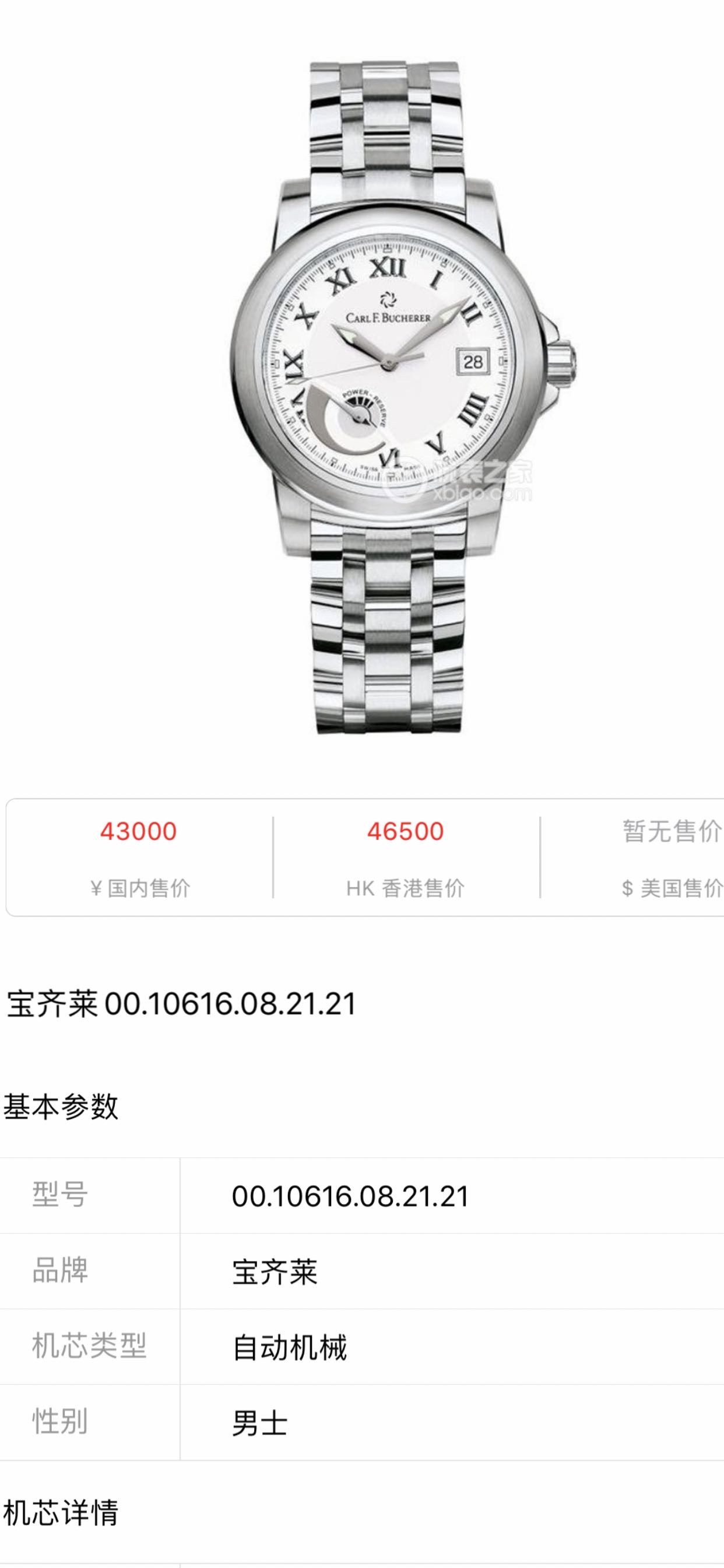 宝齐莱 型号00.10616.08.21.21,精钢材质,机械自动,口径38mm,
