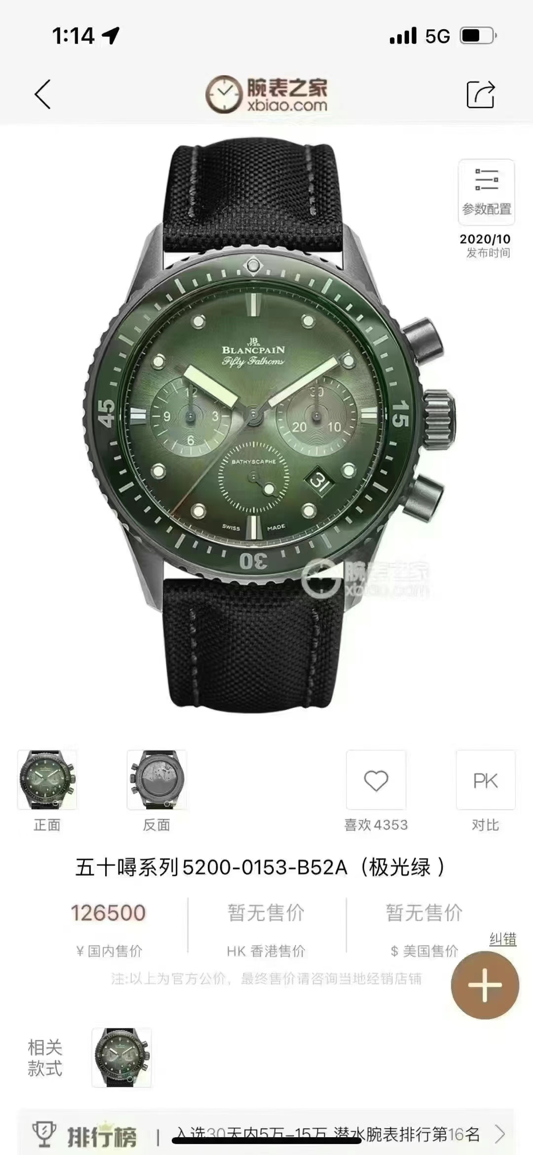 宝珀五十噚Fifty Fathoms5200-0153-B52A极光绿机械男性