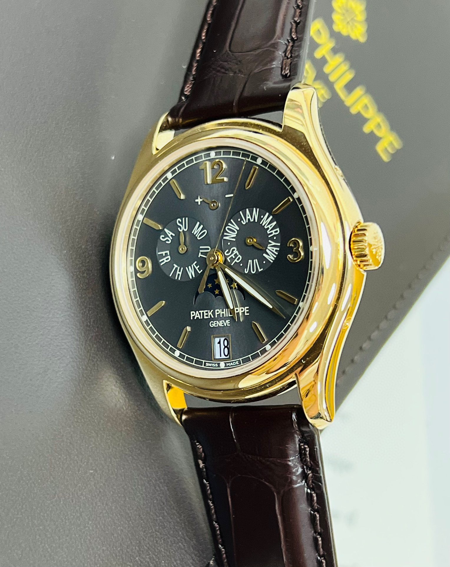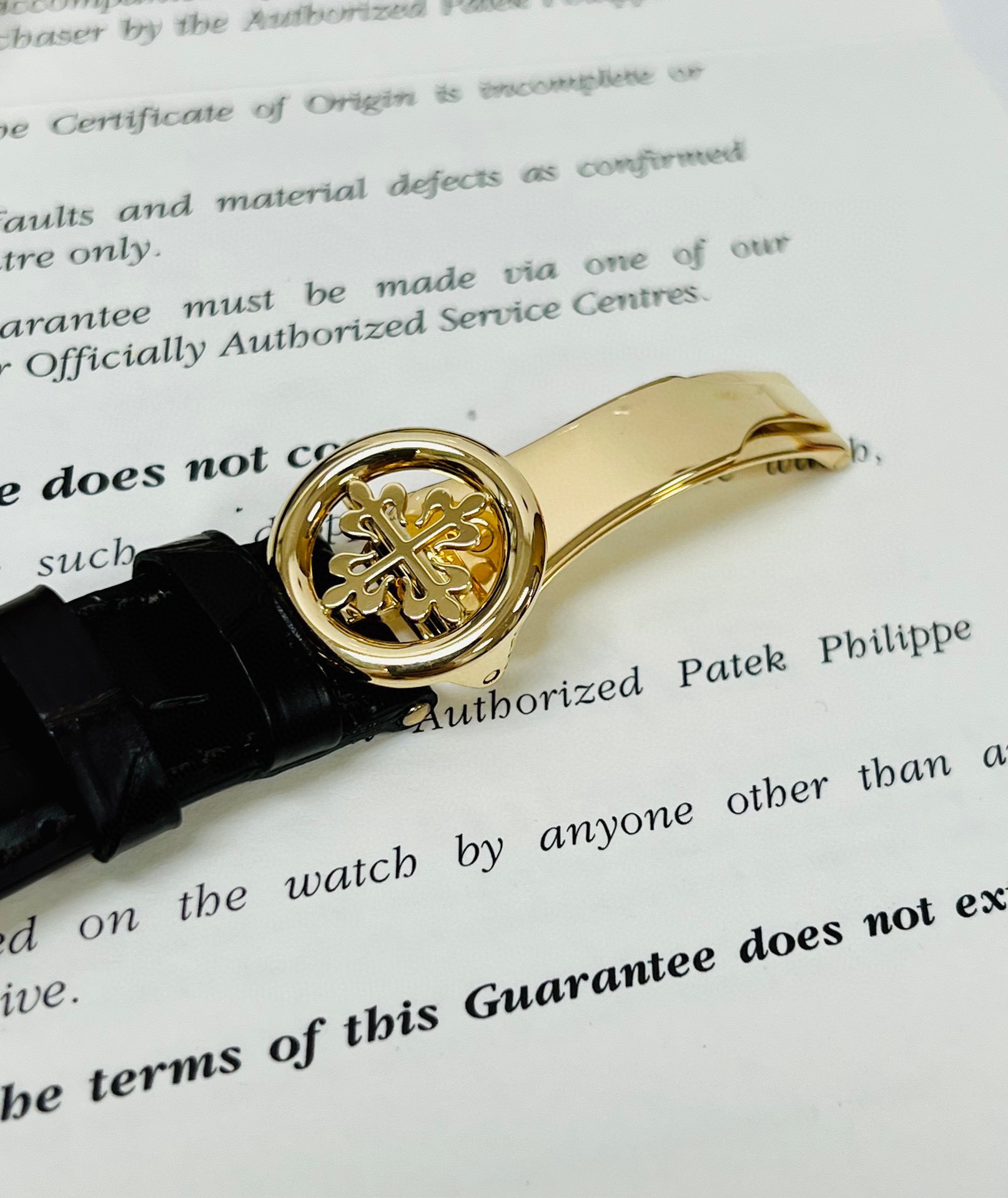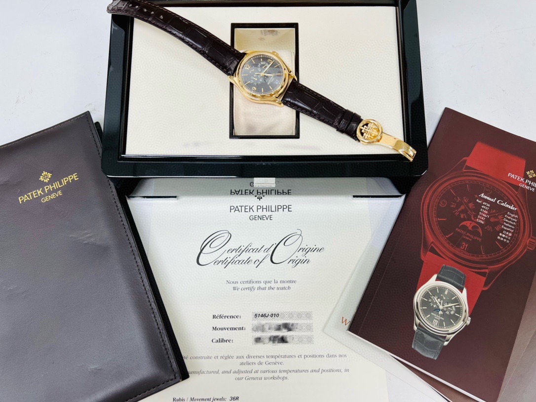 2019年6月全套百达翡丽5146J-010,复杂功能计时 18k黄金 自动机械男士腕表 表径39mm 动力储备显示、月相、年历显示、星期显示、日期显示 背透 折叠扣 参考公价368800