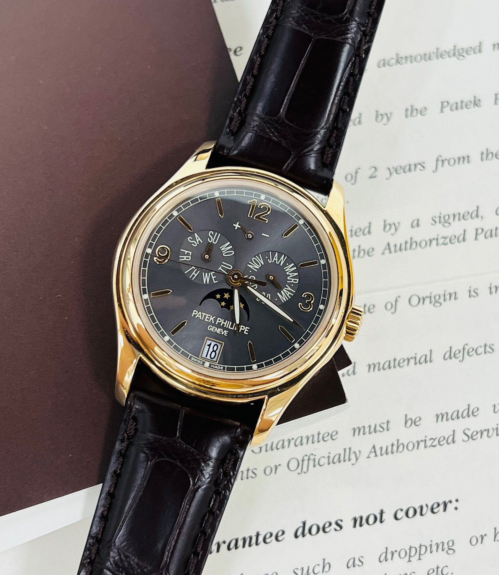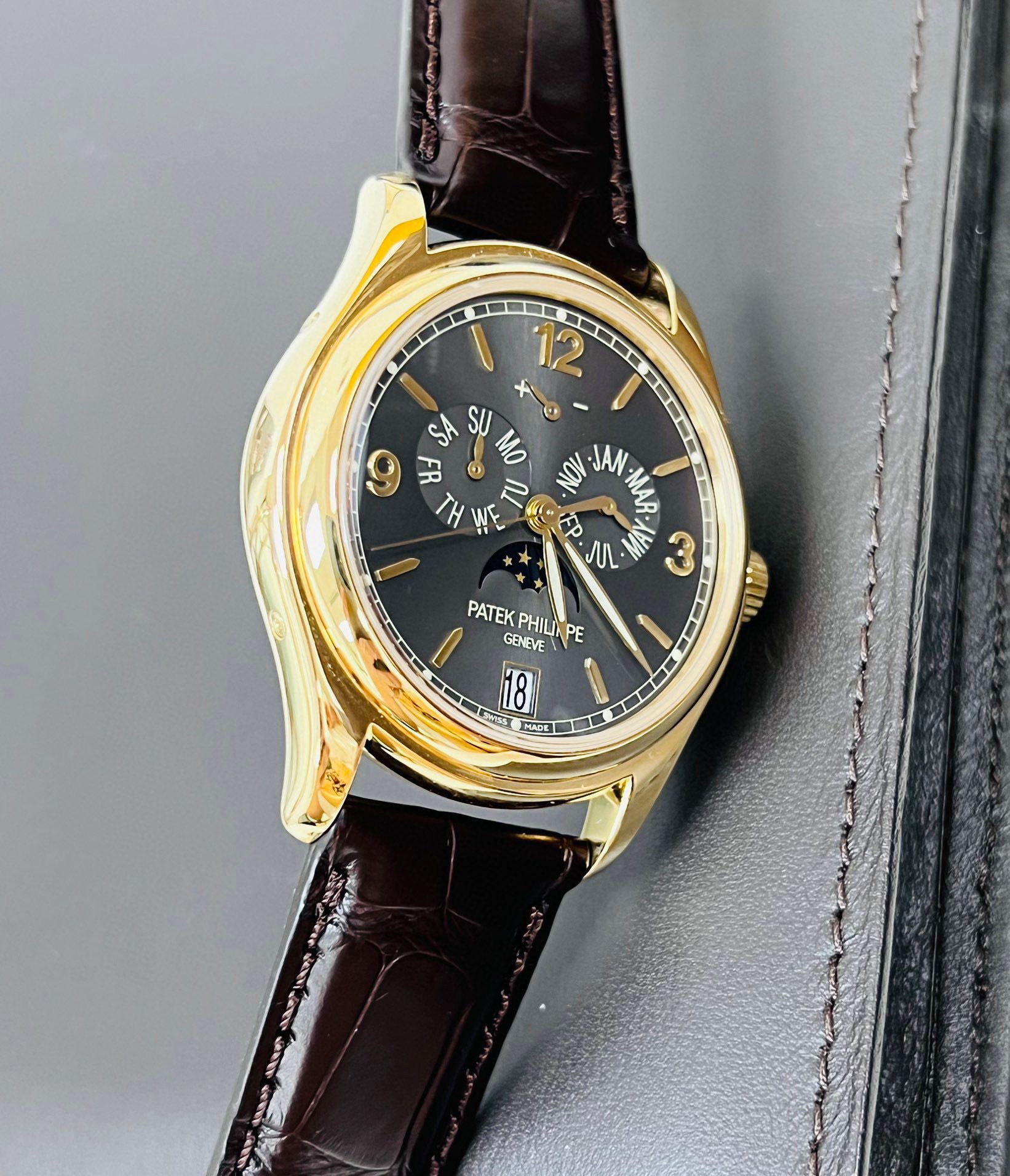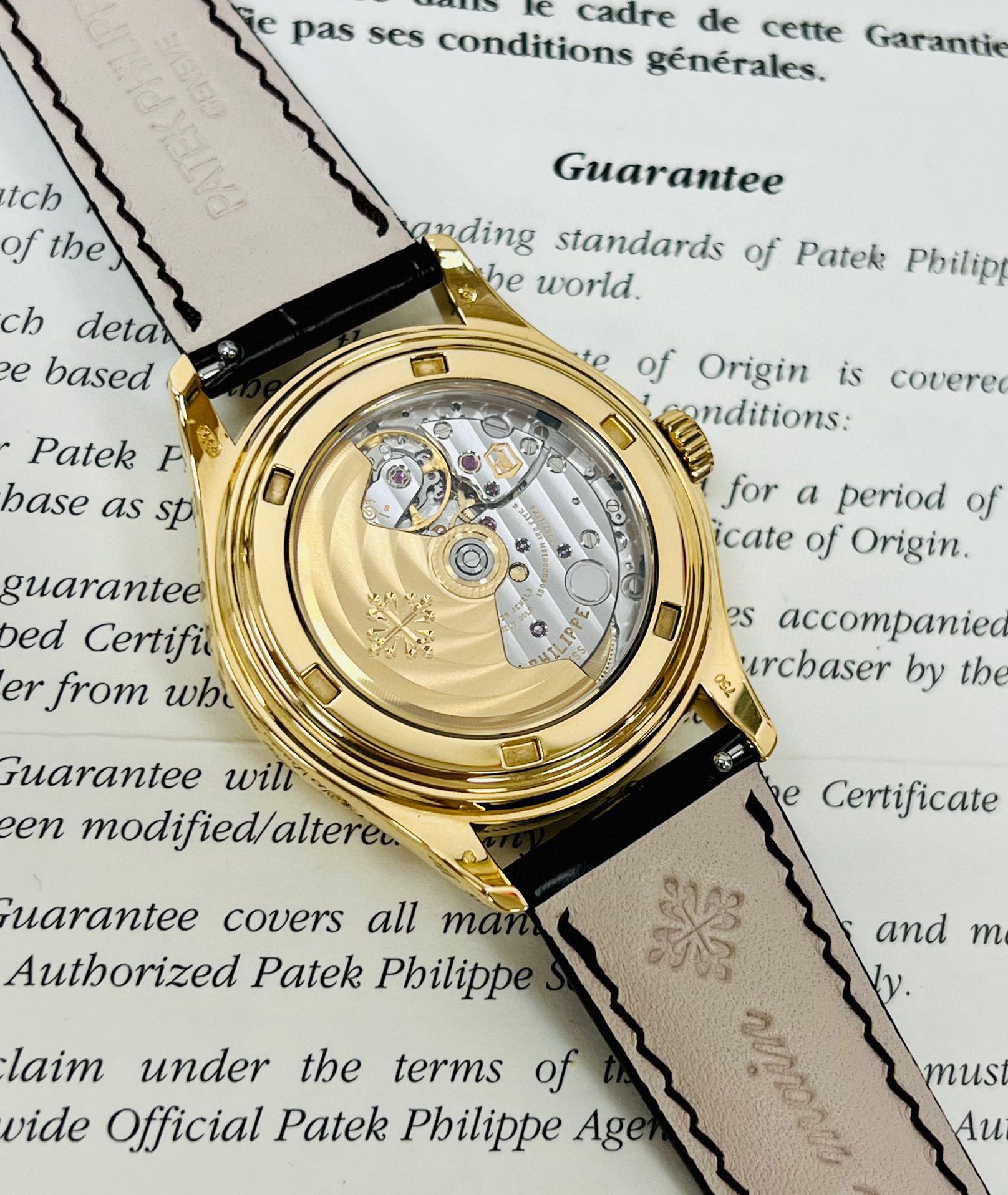 2019年6月全套百达翡丽5146J-010,复杂功能计时 18k黄金 自动机械男士腕表 表径39mm 动力储备显示、月相、年历显示、星期显示、日期显示 背透 折叠扣 参考公价368800
