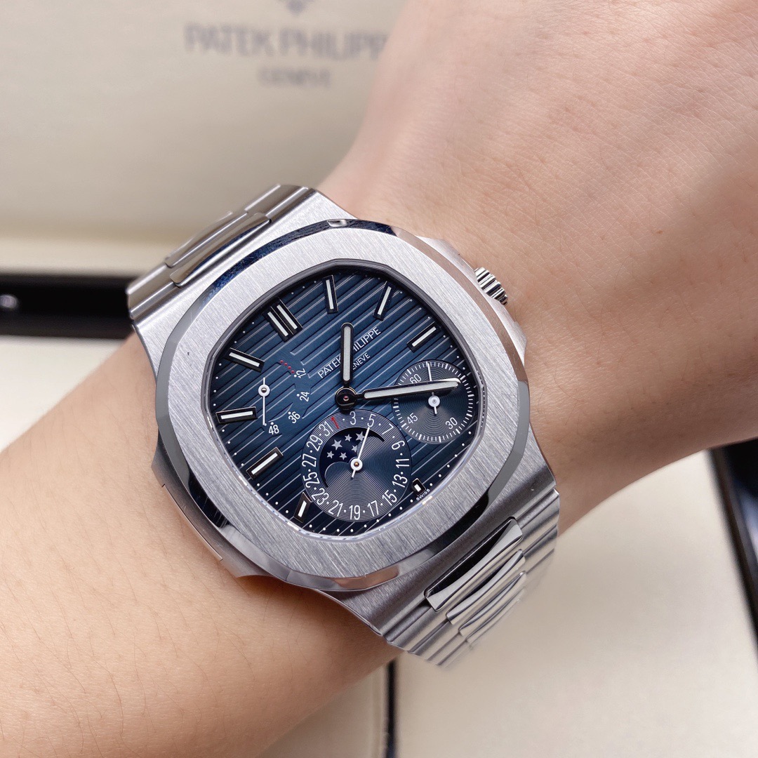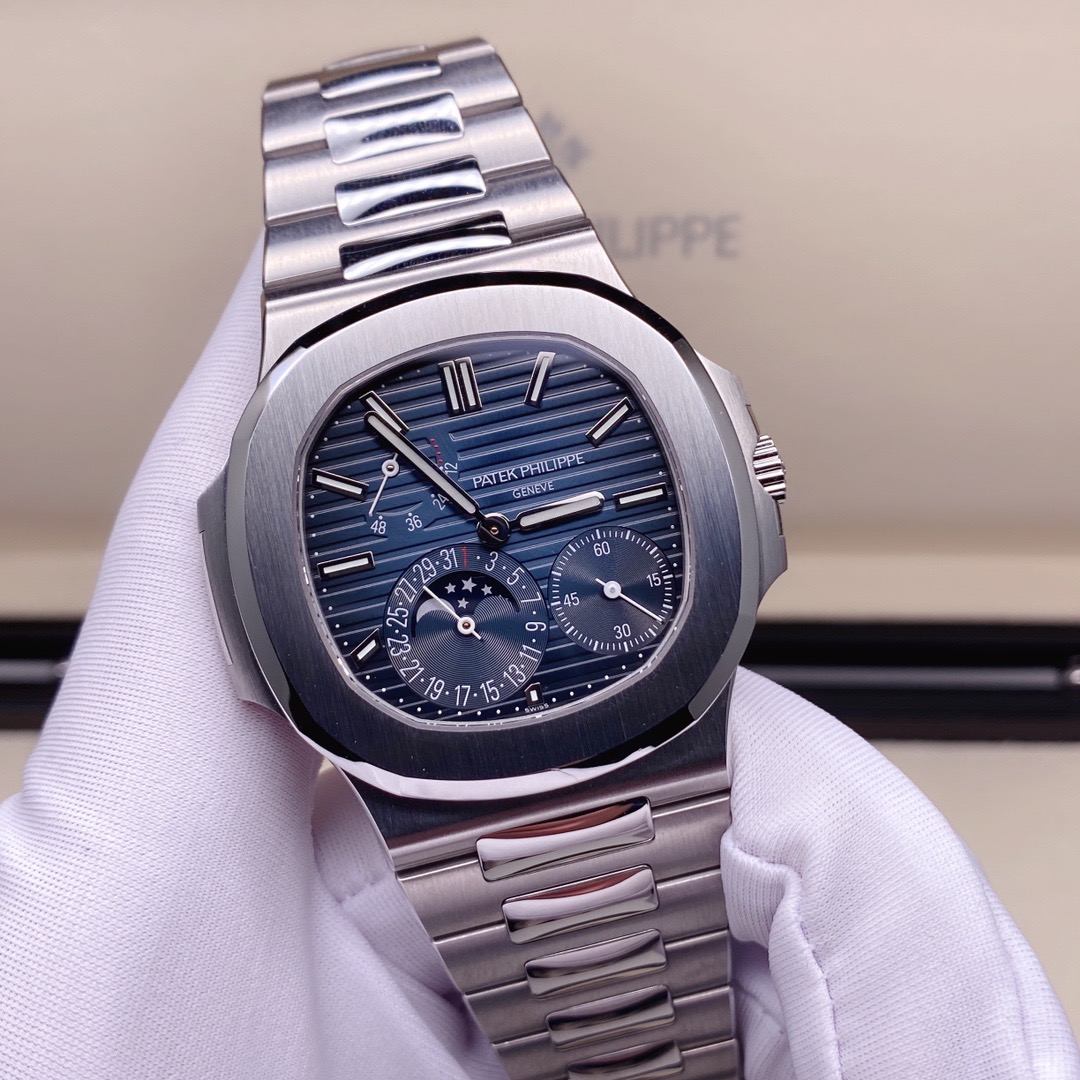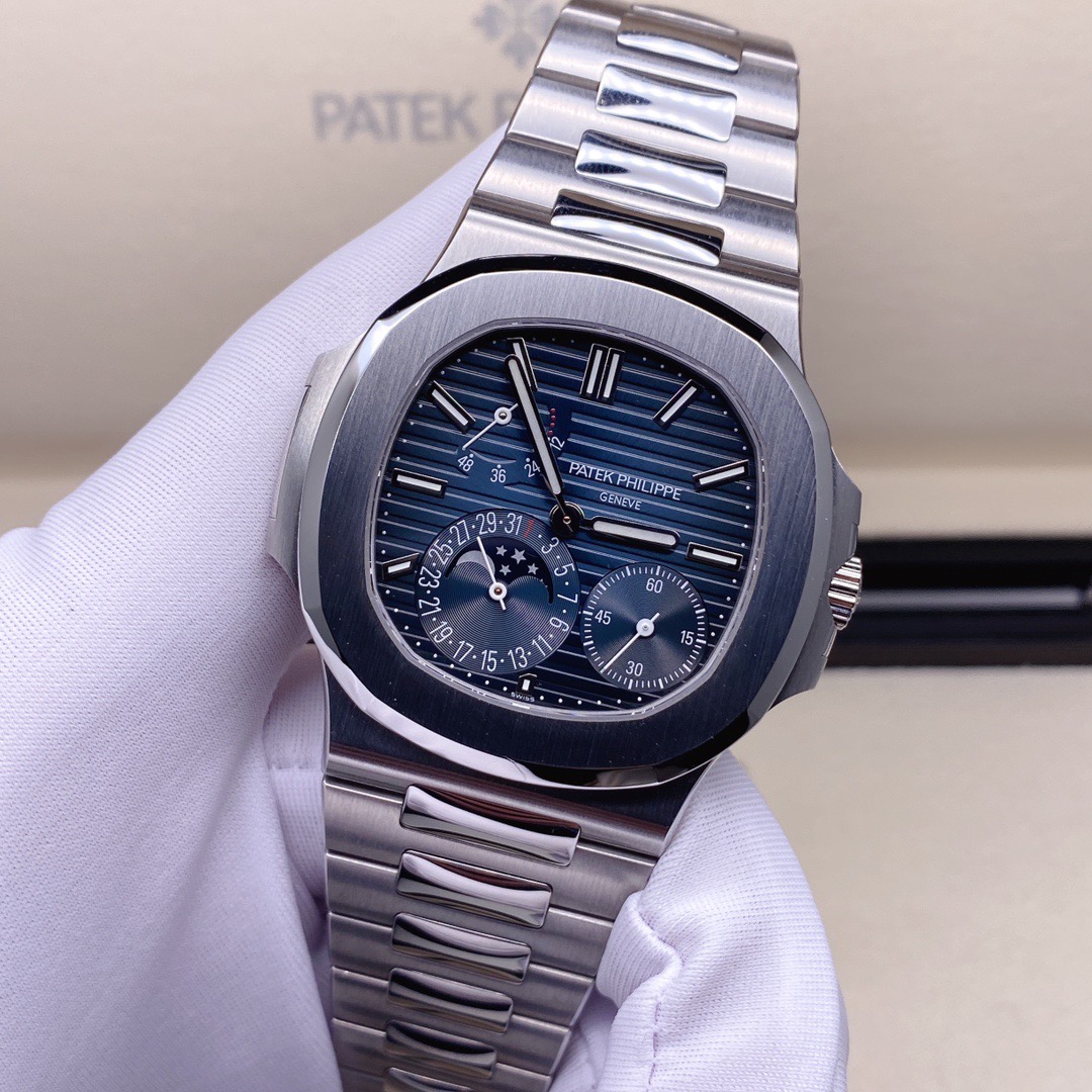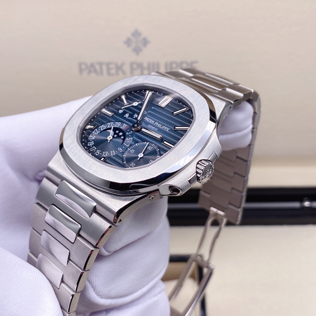 百达翡丽运动优雅系列5712/1A-001蓝面鹦鹉螺 男士自动机械 40mm表径 搭载百达翡丽Cal.240IRM升级版珍珠陀机芯 采用渐变式灰蓝色表盘、水平压纹图案、白金夜光刻度 48小时动力储备显示、日期、月相功能 只对百达翡丽VIP客户少量预定 20年极品全套 现货好价