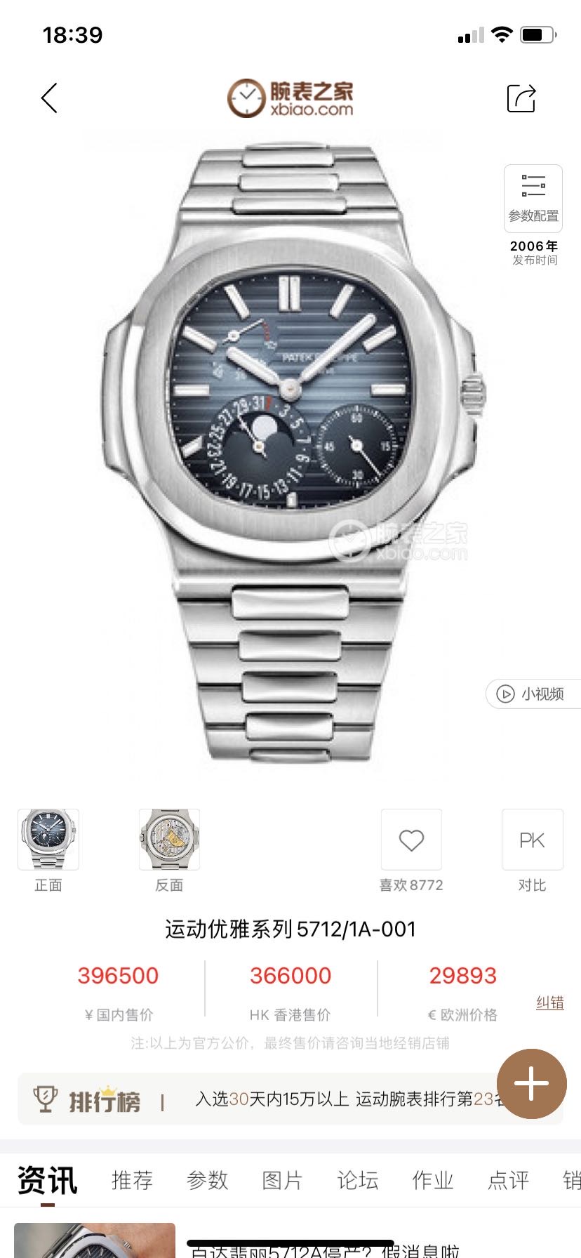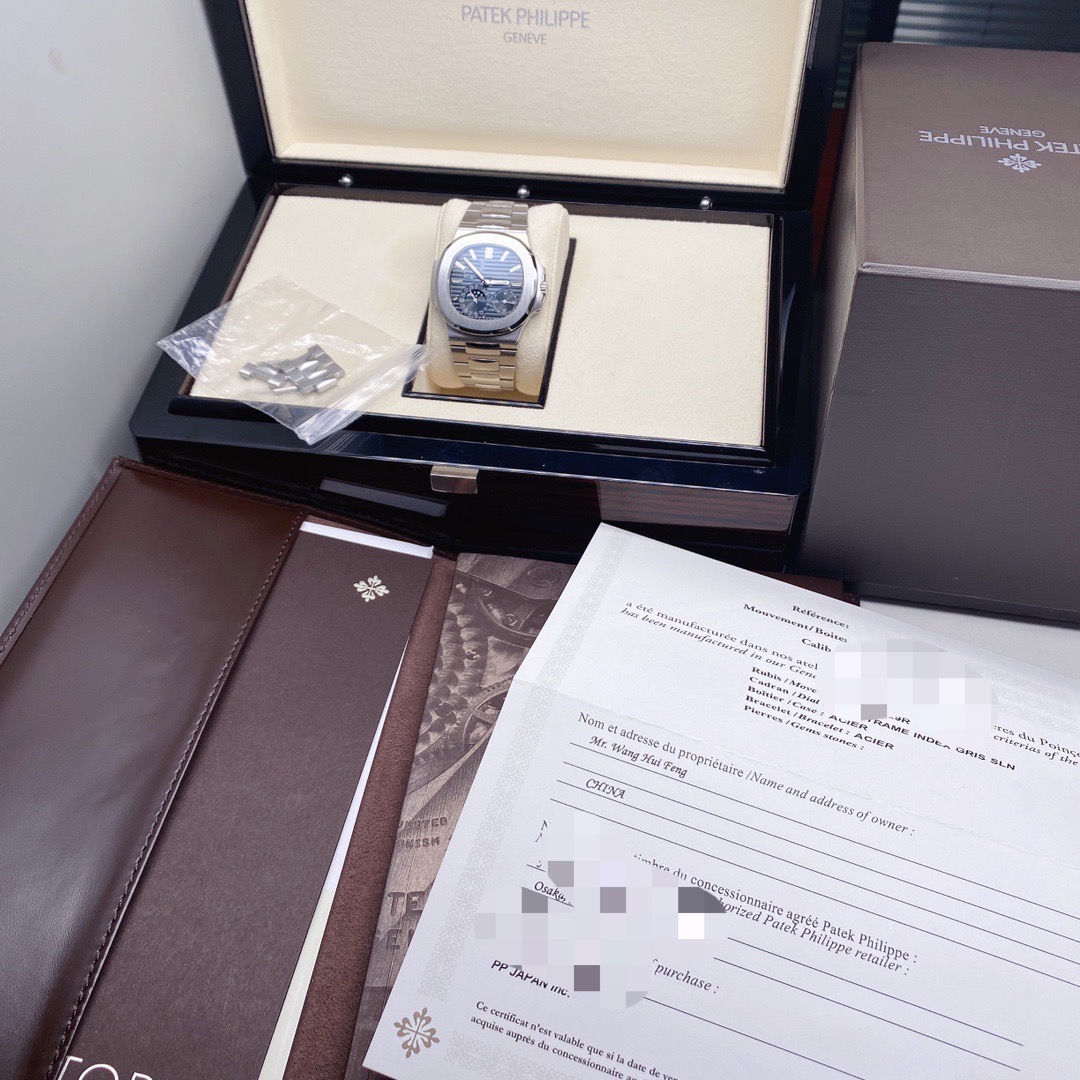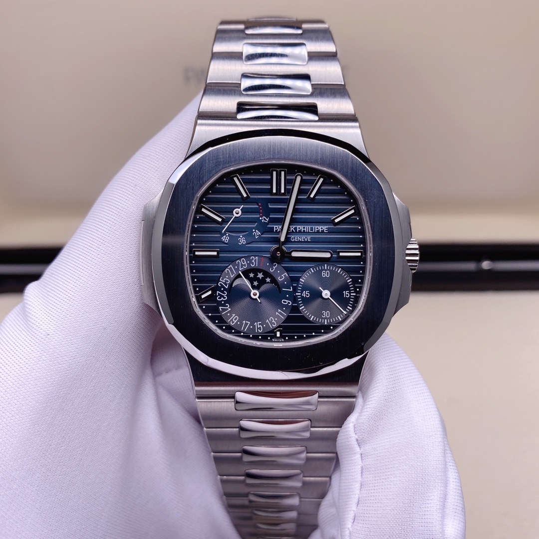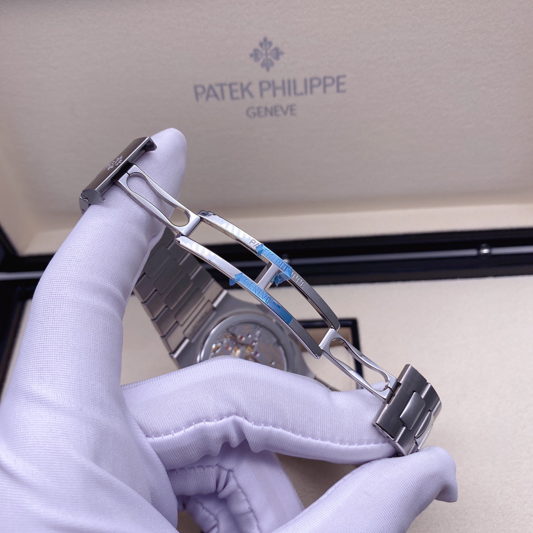 百达翡丽运动优雅系列5712/1A-001蓝面鹦鹉螺 男士自动机械 40mm表径 搭载百达翡丽Cal.240IRM升级版珍珠陀机芯 采用渐变式灰蓝色表盘、水平压纹图案、白金夜光刻度 48小时动力储备显示、日期、月相功能 只对百达翡丽VIP客户少量预定 20年极品全套 现货好价