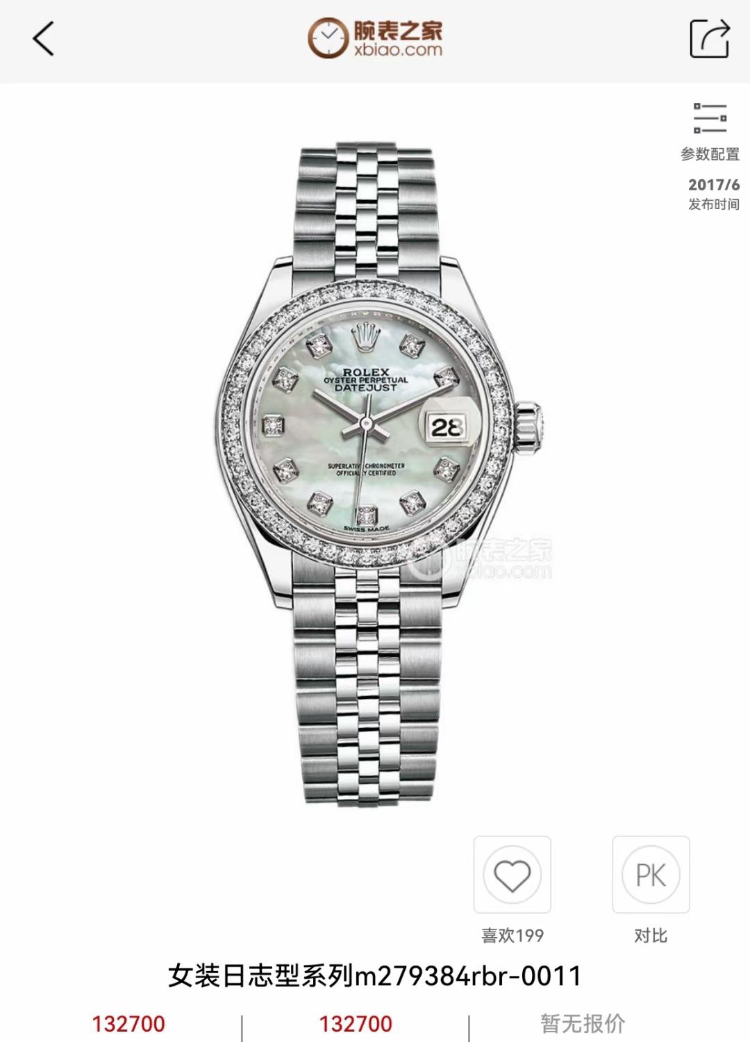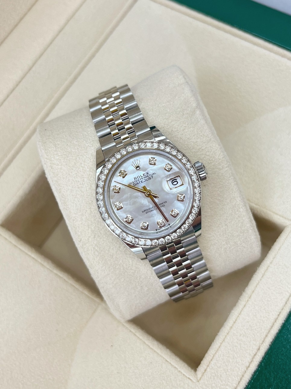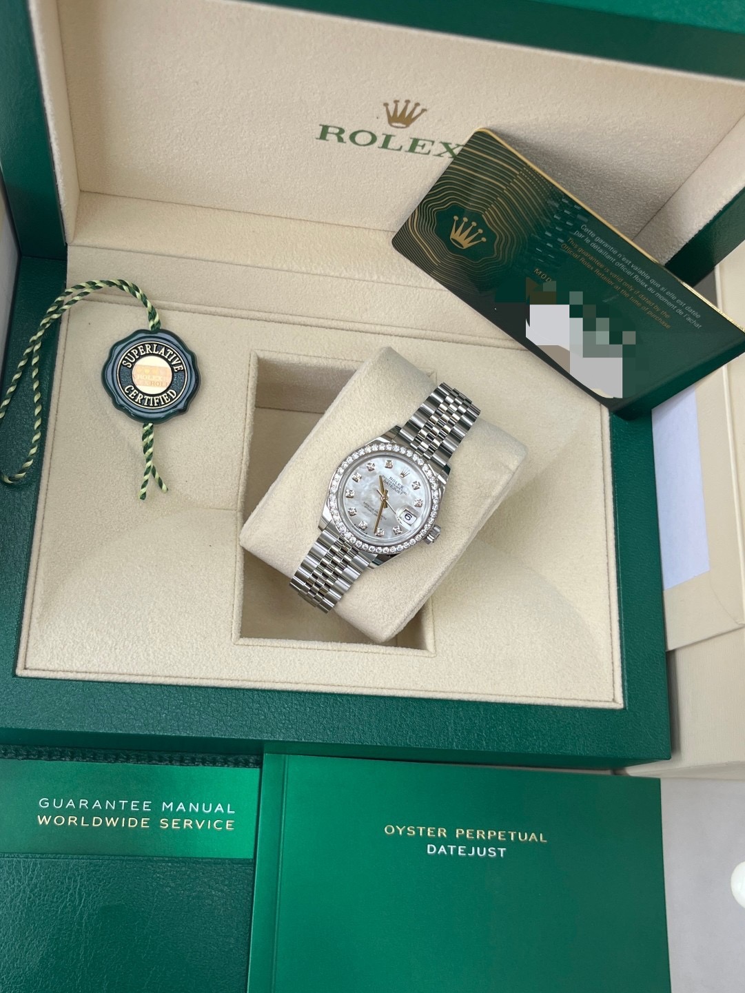 劳力士279384-0011女装日志型,白贝母盘面,钻刻五珠链,28mm表径,23年未使用 有货。