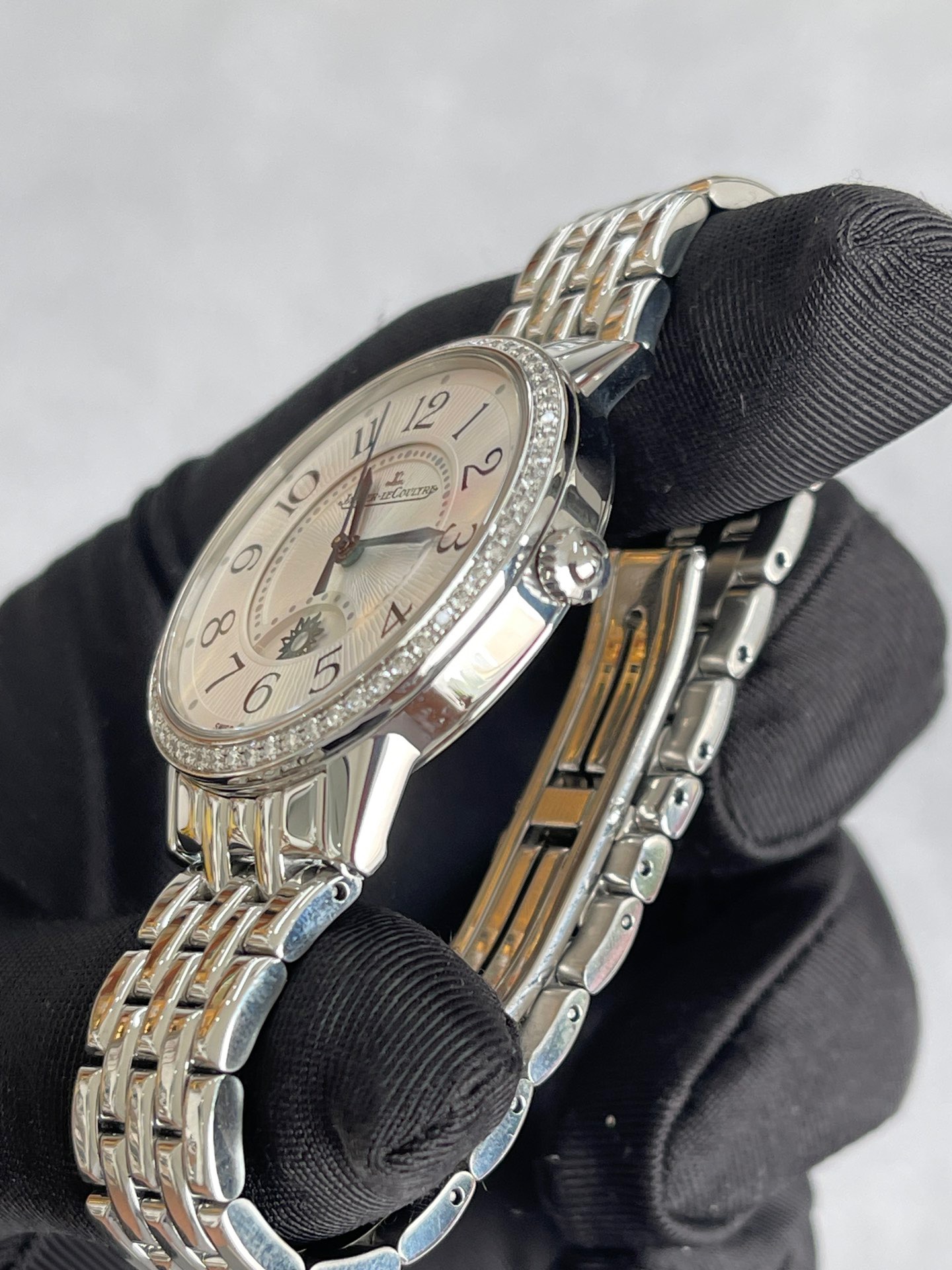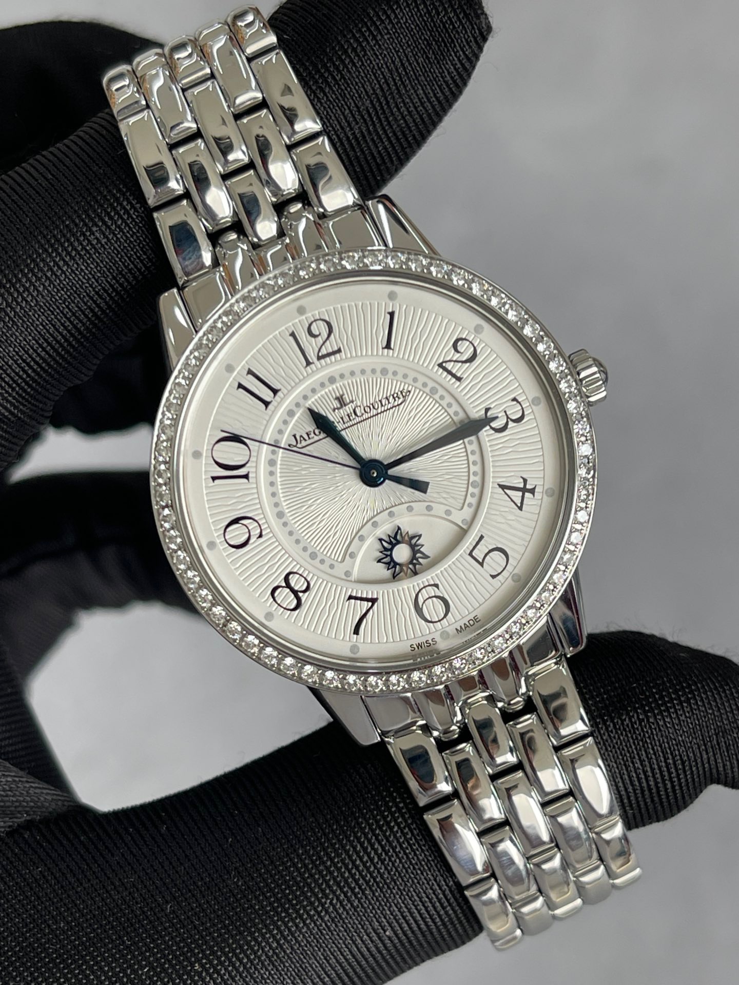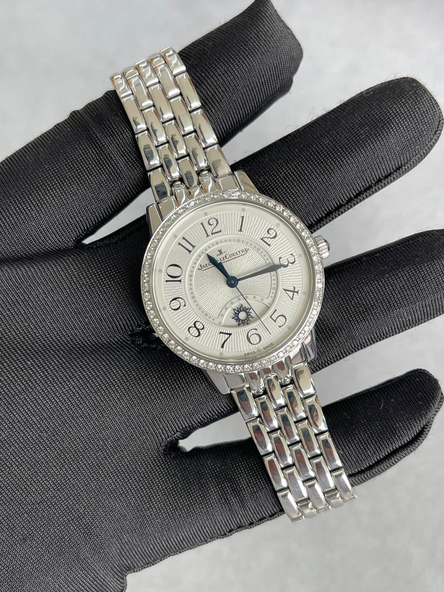 全套积家约会系列3448130女士机械腕表 动力储备38个小时 背透机芯 新款金托 防水30米 表径34精钢材质 外圈镶嵌60颗钻石 折叠扣表扣 大热门款式 公价138000现在好价