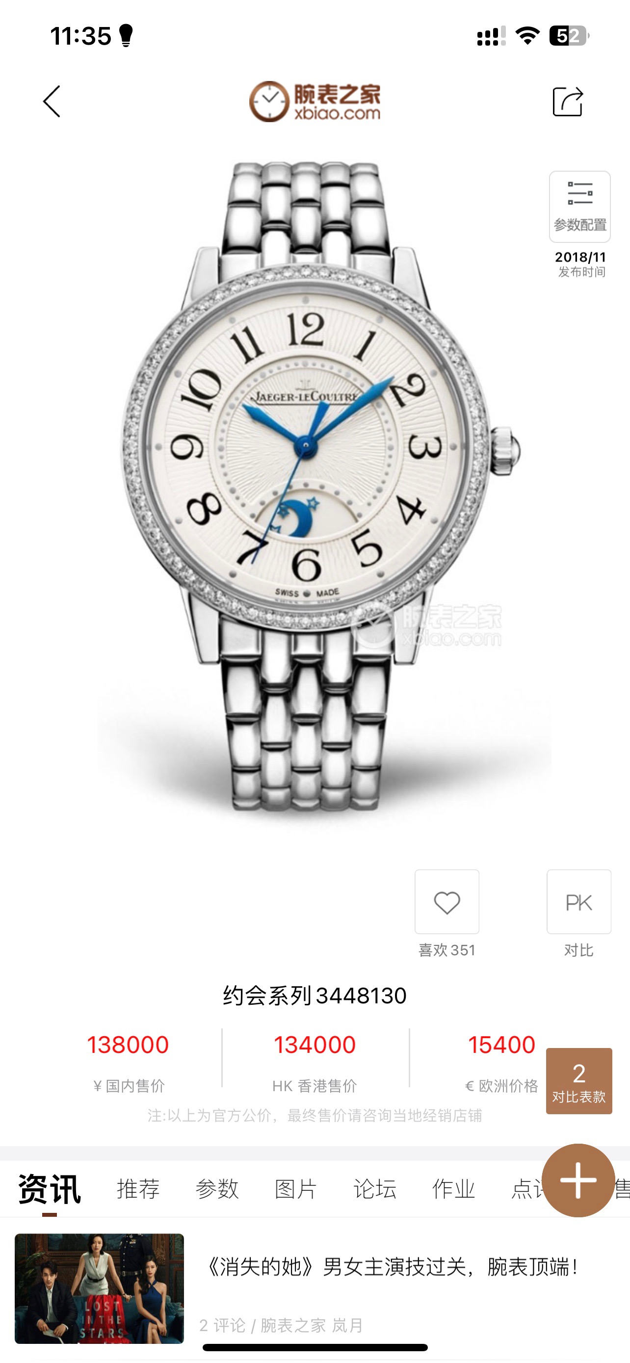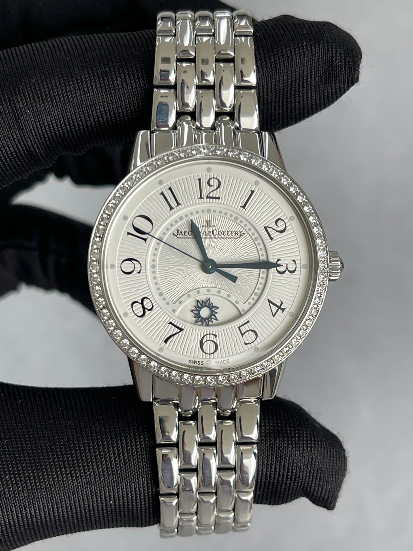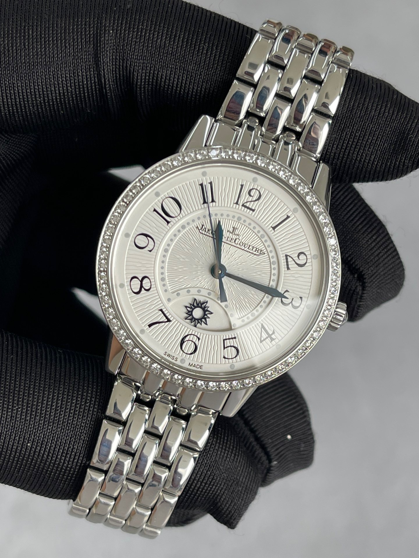全套积家约会系列3448130女士机械腕表 动力储备38个小时 背透机芯 新款金托 防水30米 表径34精钢材质 外圈镶嵌60颗钻石 折叠扣表扣 大热门款式 公价138000现在好价