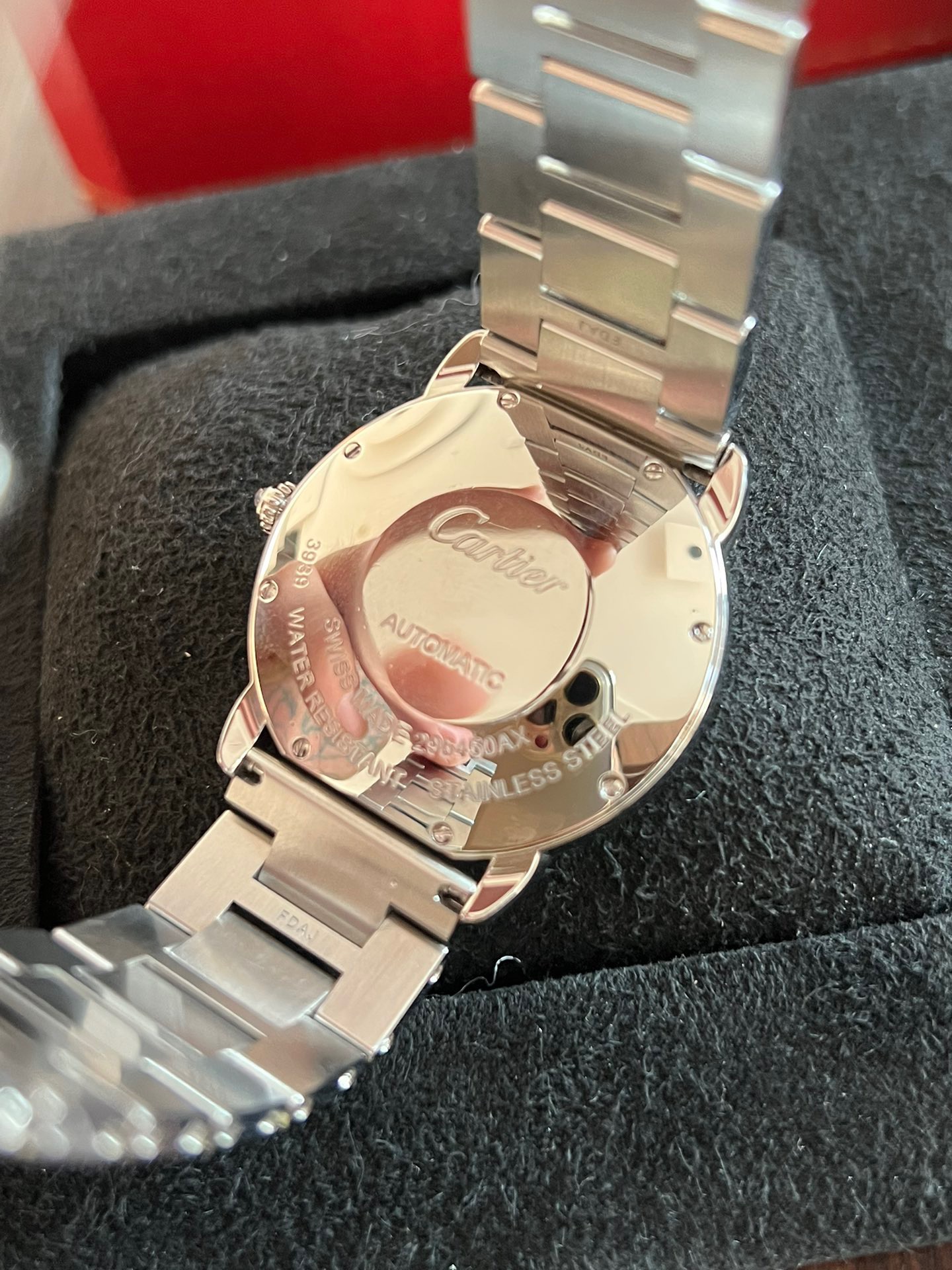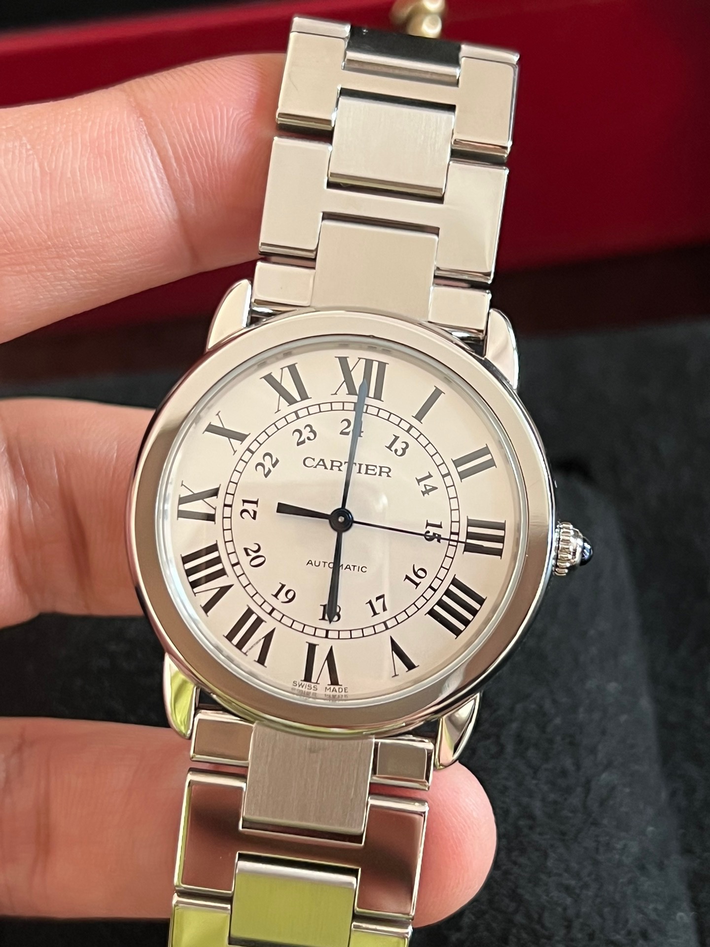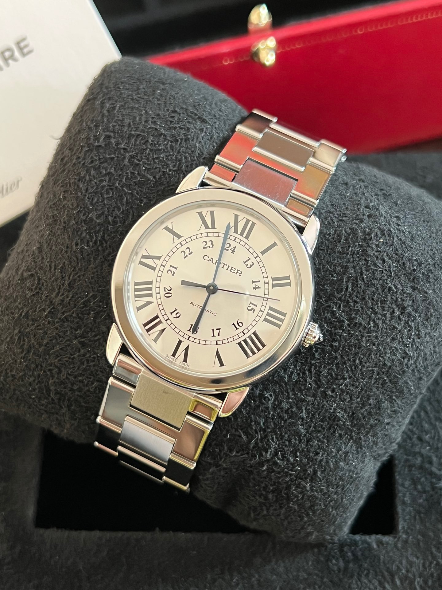 卡地亚伦敦RONDE DE CARTIER系列型号:WSRN0012女士钢带自动机械腕表,36毫米表径,镀银珠光表盘,剑形蓝钢指针,罗马刻度,蓝宝石水晶玻璃,折叠扣,2021年全套专柜8年联保至2029年专柜公价27800元