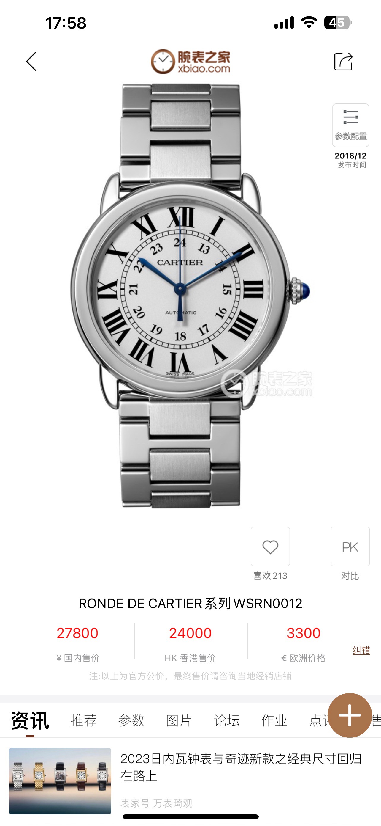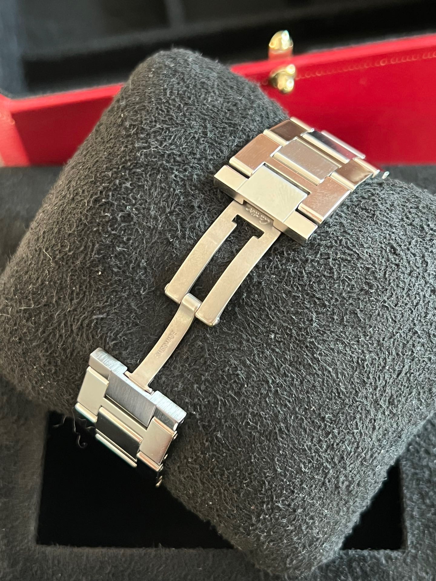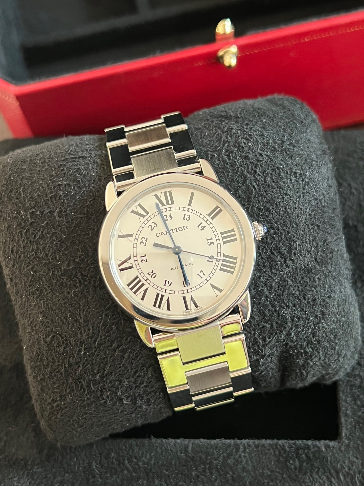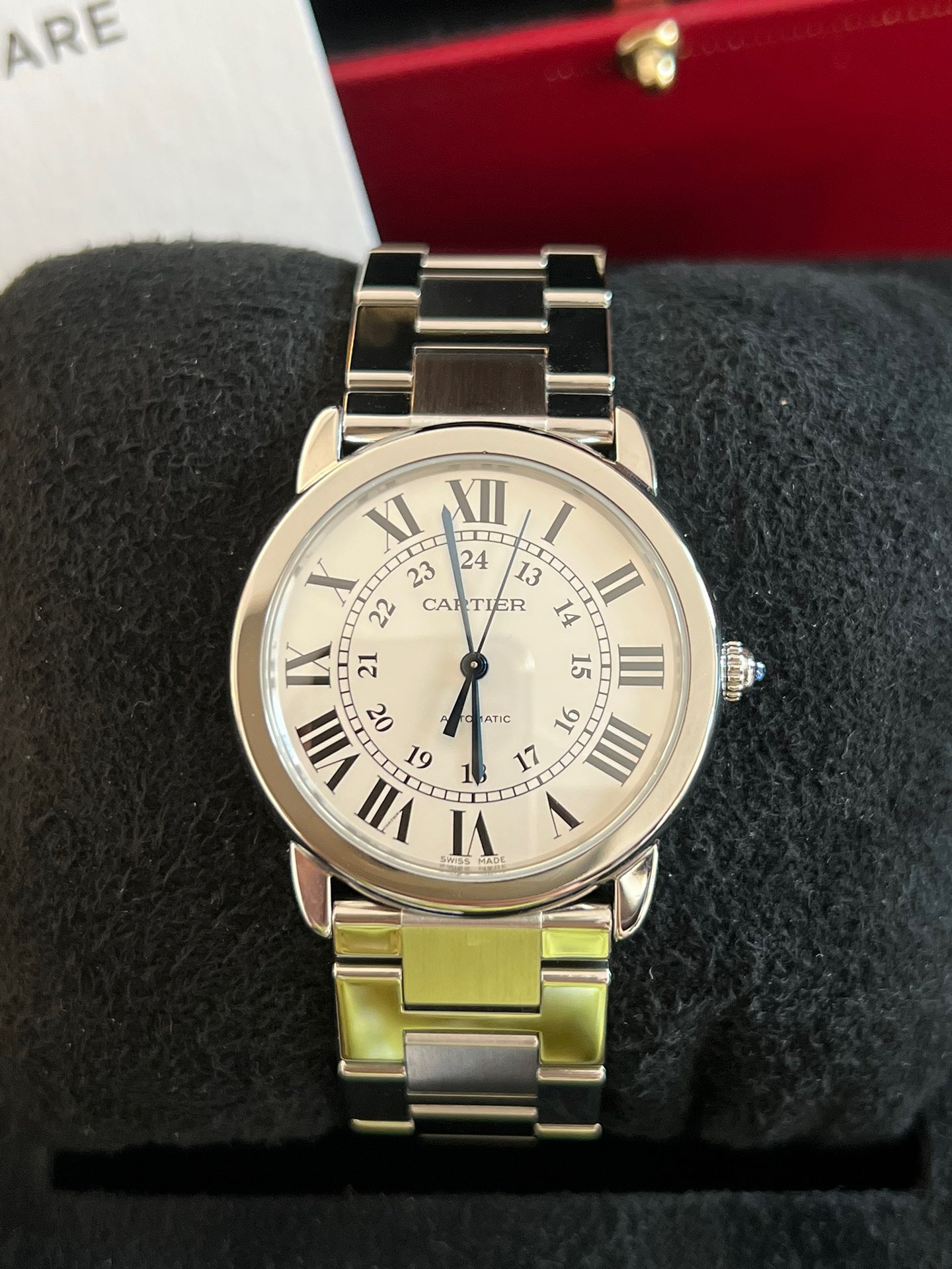 卡地亚伦敦RONDE DE CARTIER系列型号:WSRN0012女士钢带自动机械腕表,36毫米表径,镀银珠光表盘,剑形蓝钢指针,罗马刻度,蓝宝石水晶玻璃,折叠扣,2021年全套专柜8年联保至2029年专柜公价27800元