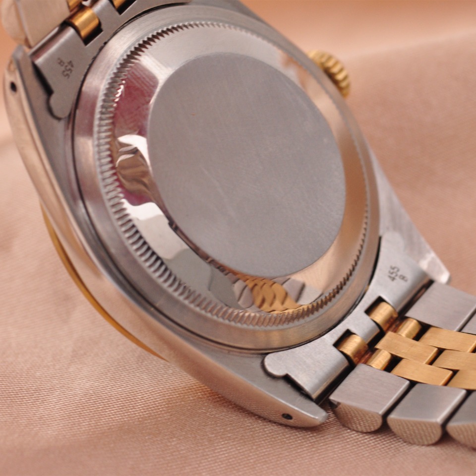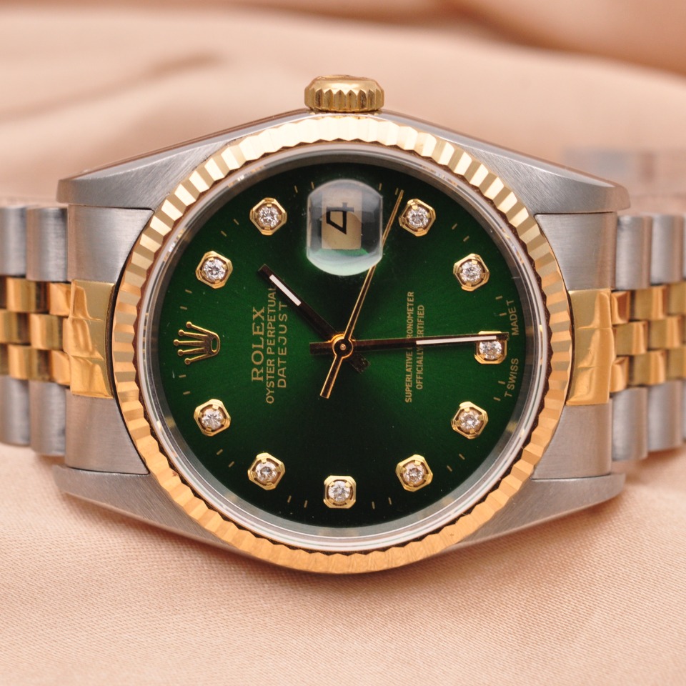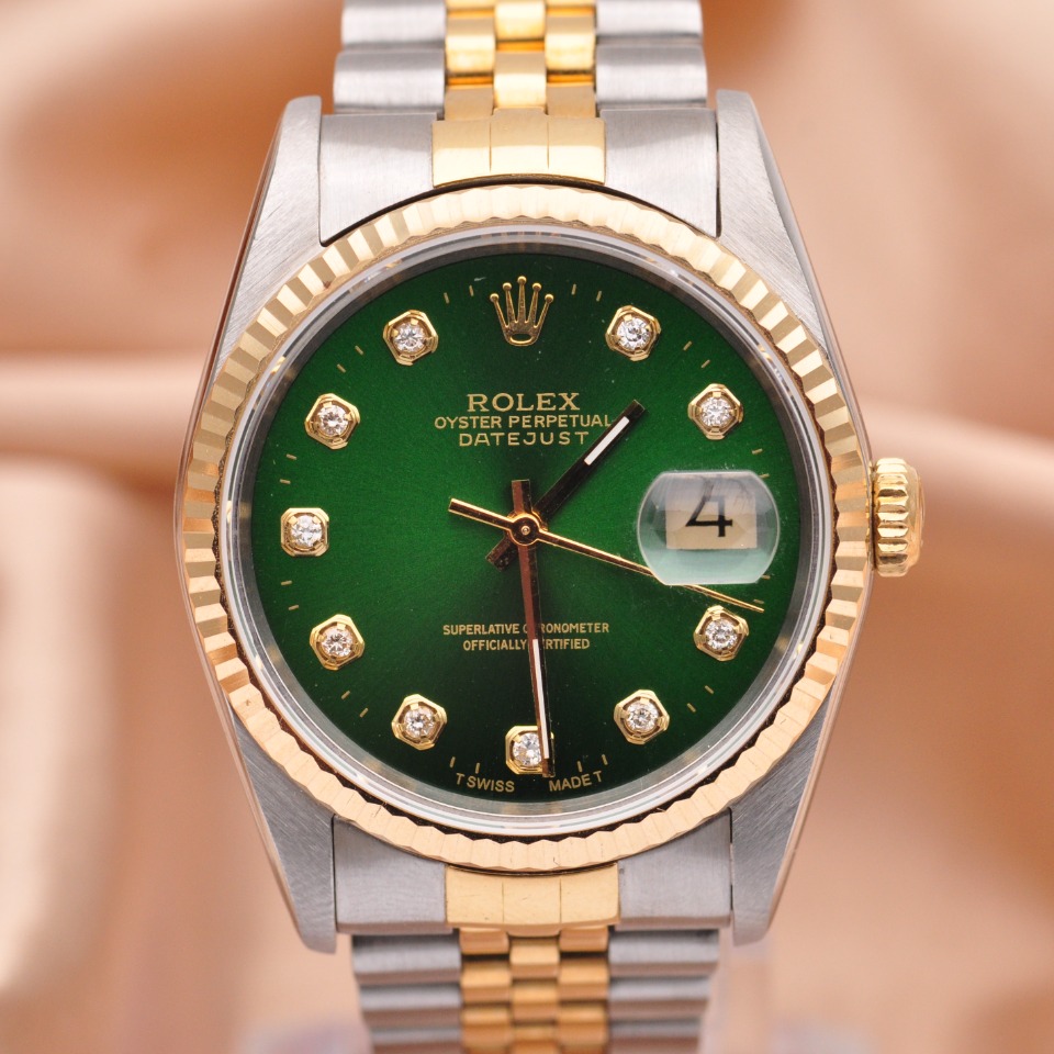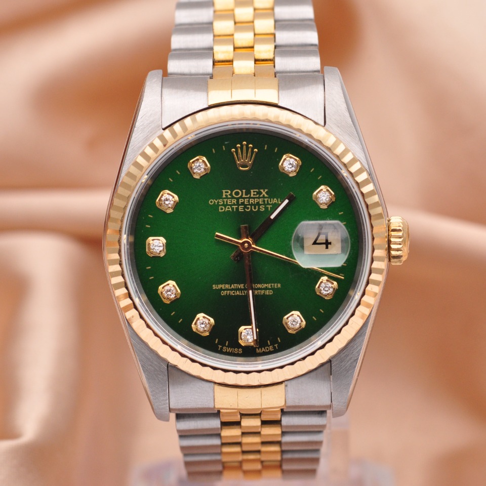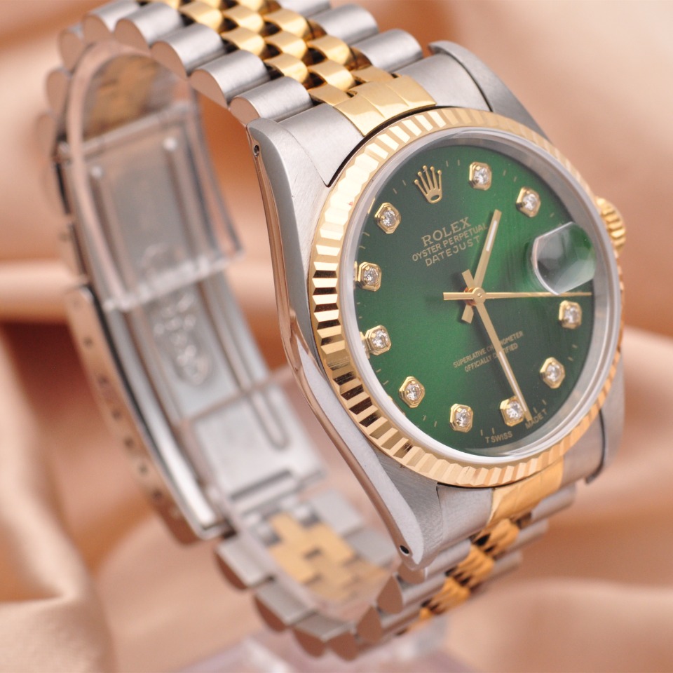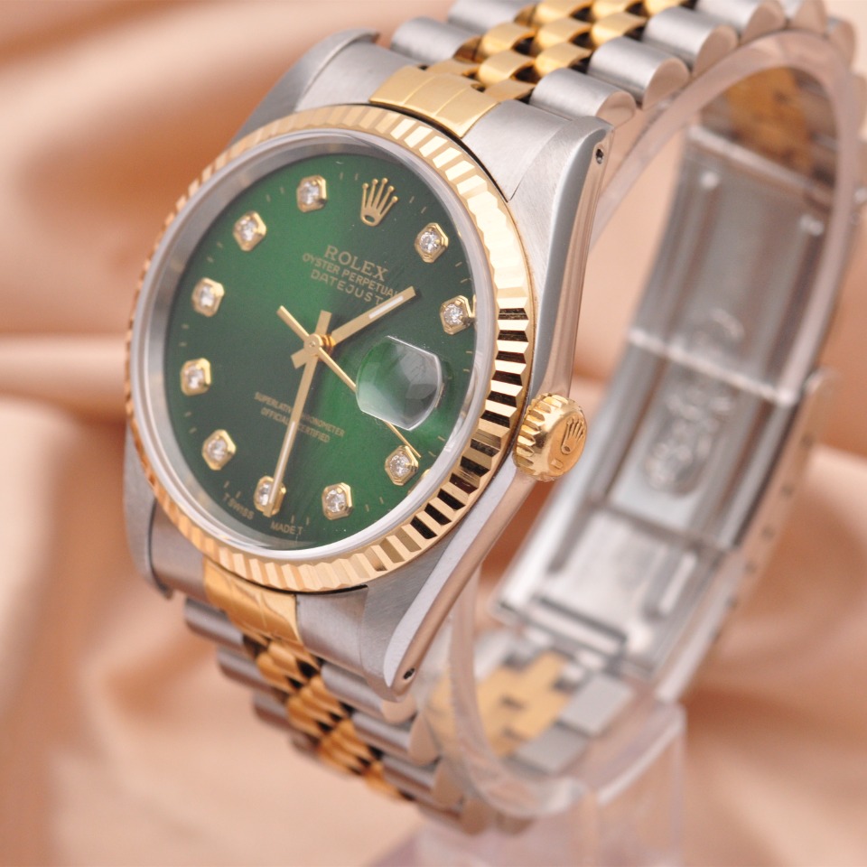 【劳力士Rolex】日志型系列后镶钻自动机械男表16233;精钢/18K黄金材质/后镶钻;36mm表盘直径;绿色面盘、钻石刻度(大包钻)、日期显示、密底、折叠扣。95新单表好品相,现货好价格~欢迎品鉴!