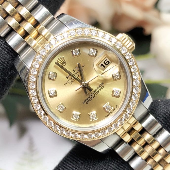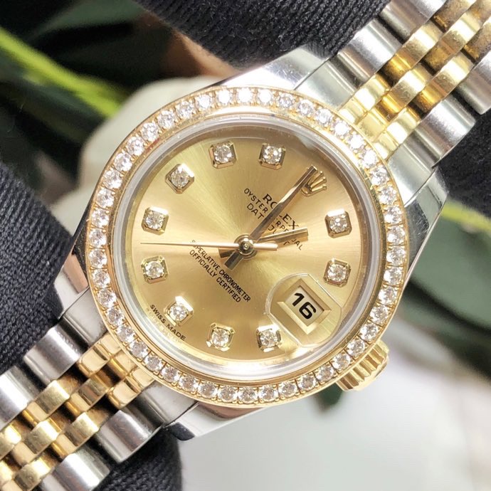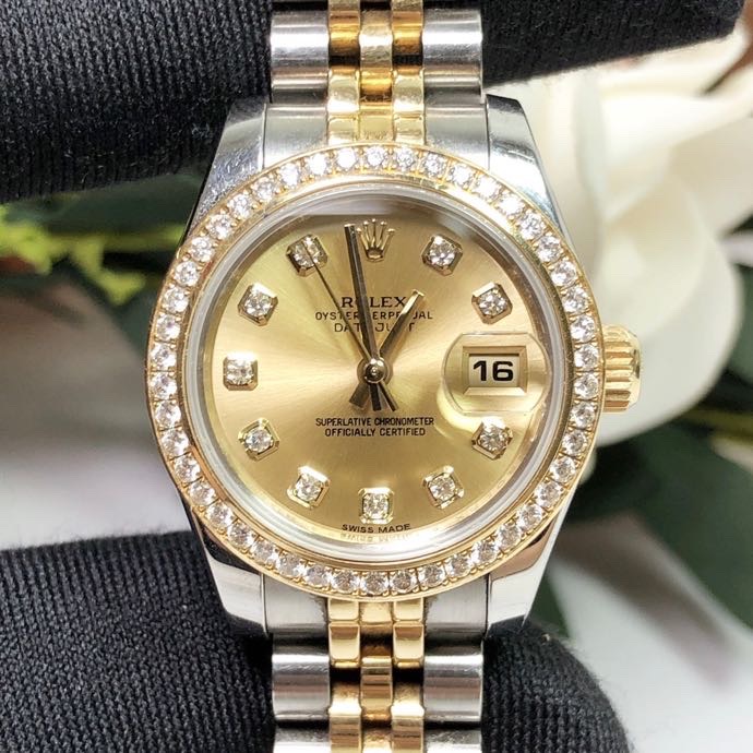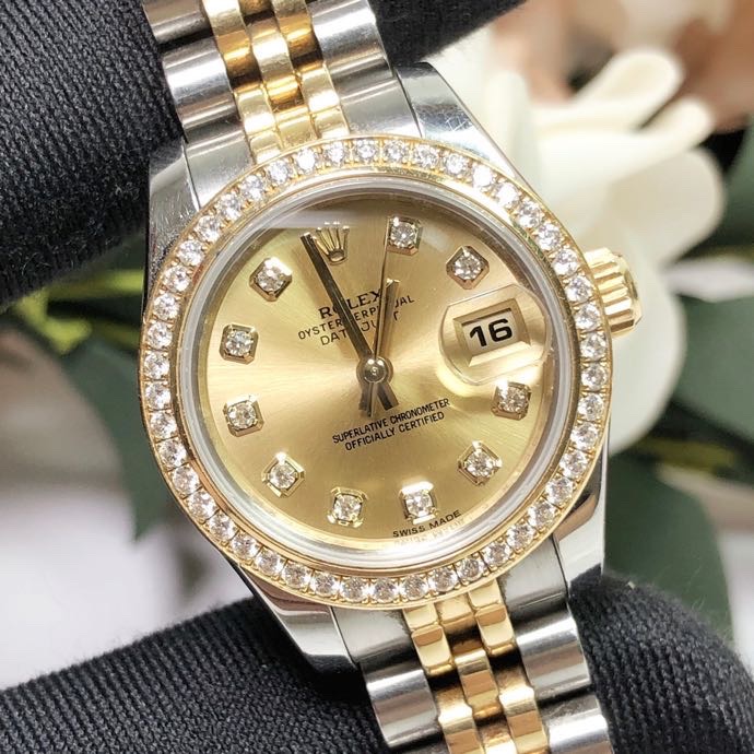 rolex/劳力士女装日志型系列179383香槟盘镶钻腕表,表径26MM,内外原镶钻石,自动机械机芯,日期显示,公价131800,15年保卡乱码