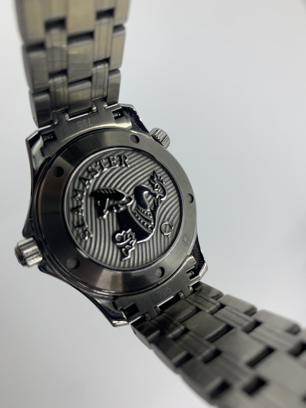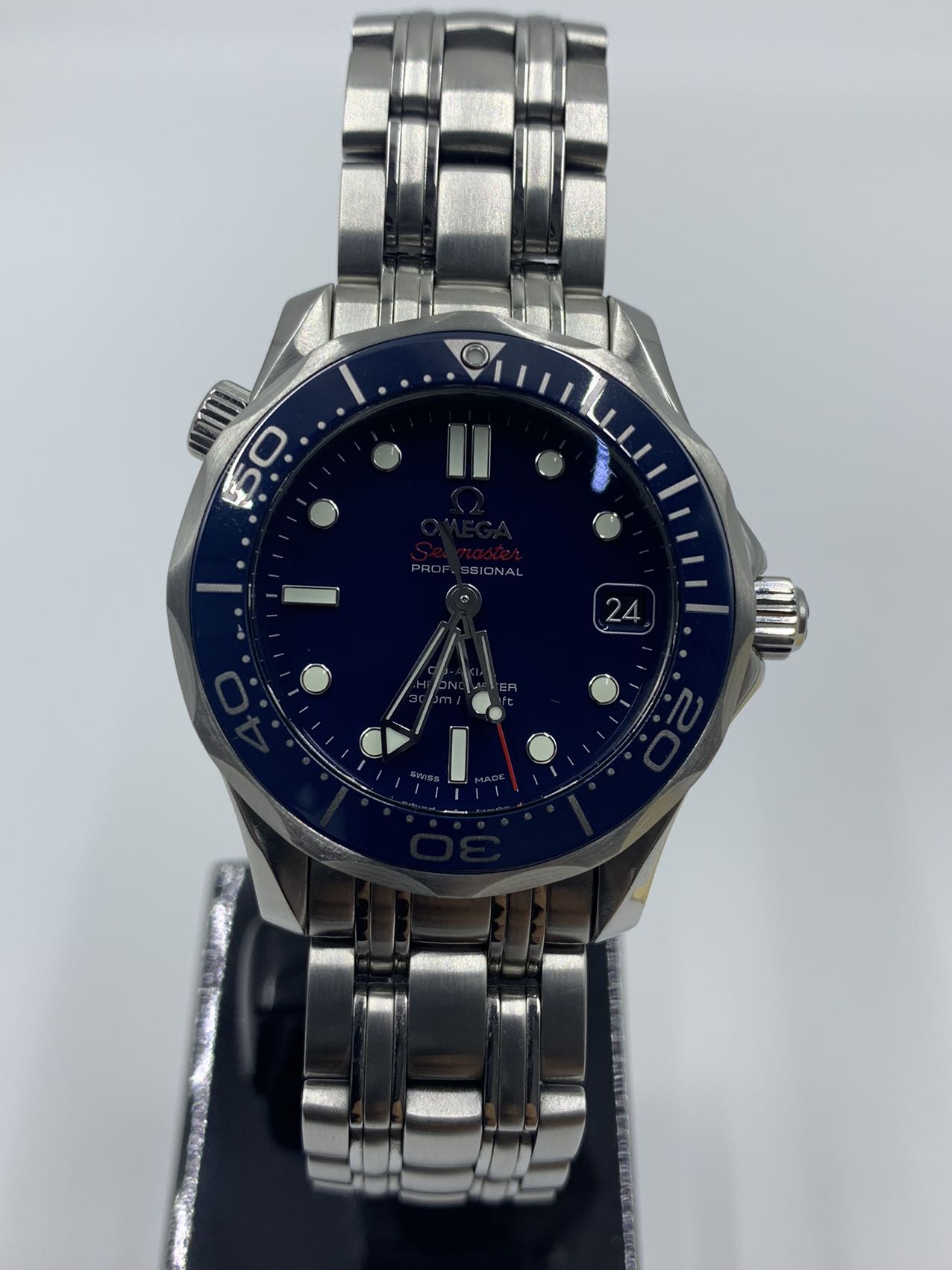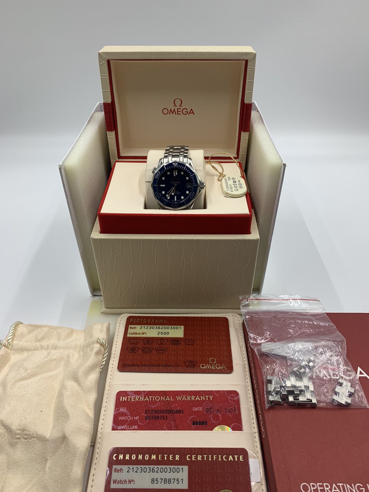欧米茄OMEGA海马系列300米防水陶瓷圈蓝面大三针日历自动机械钢带腕表,型号212.30.36.20.03.001,48小时动力储备,表壳精钢表壳,蓝色陶瓷表圈,表盘立体深蓝色表盘,夜光刻度及指针,表径:36.25mm