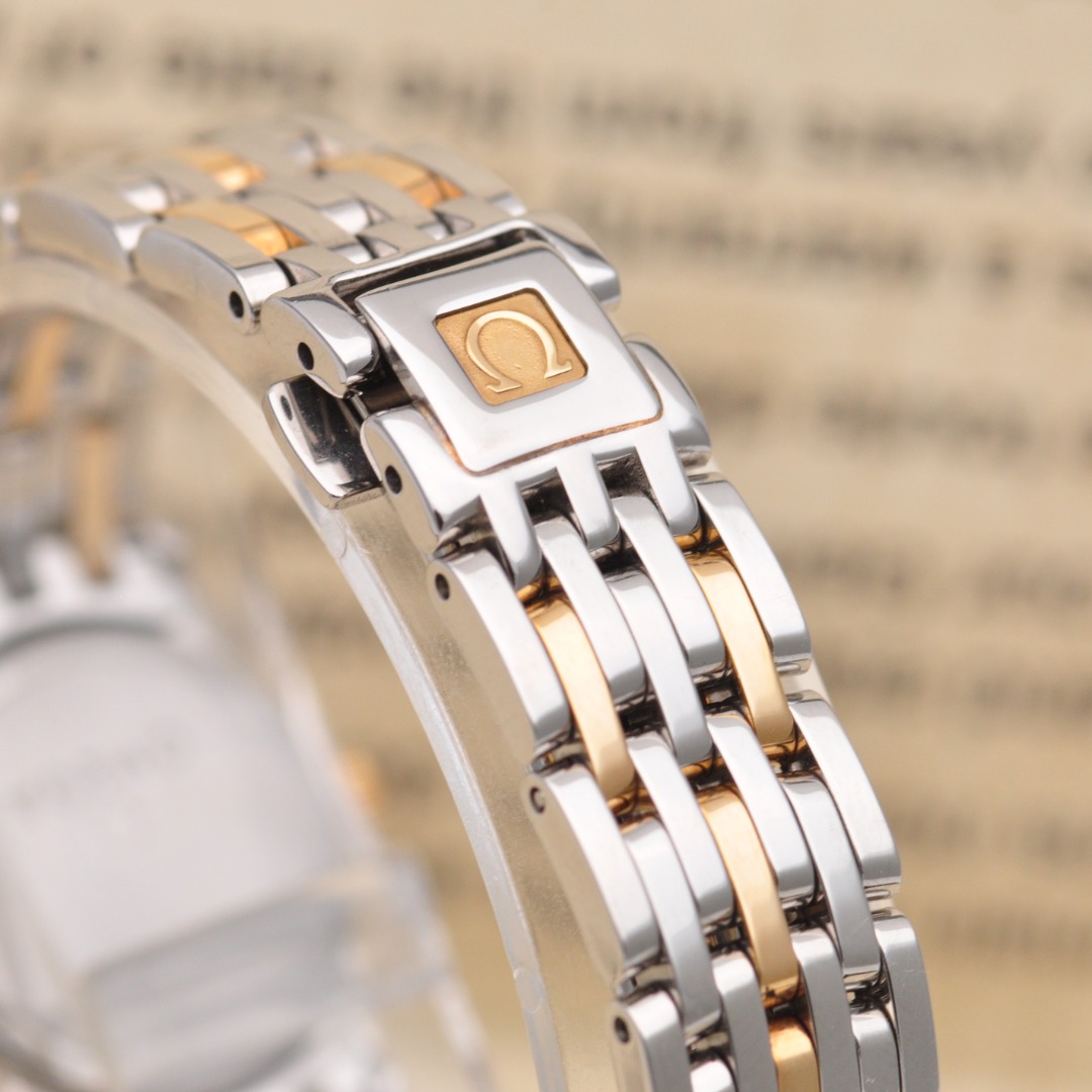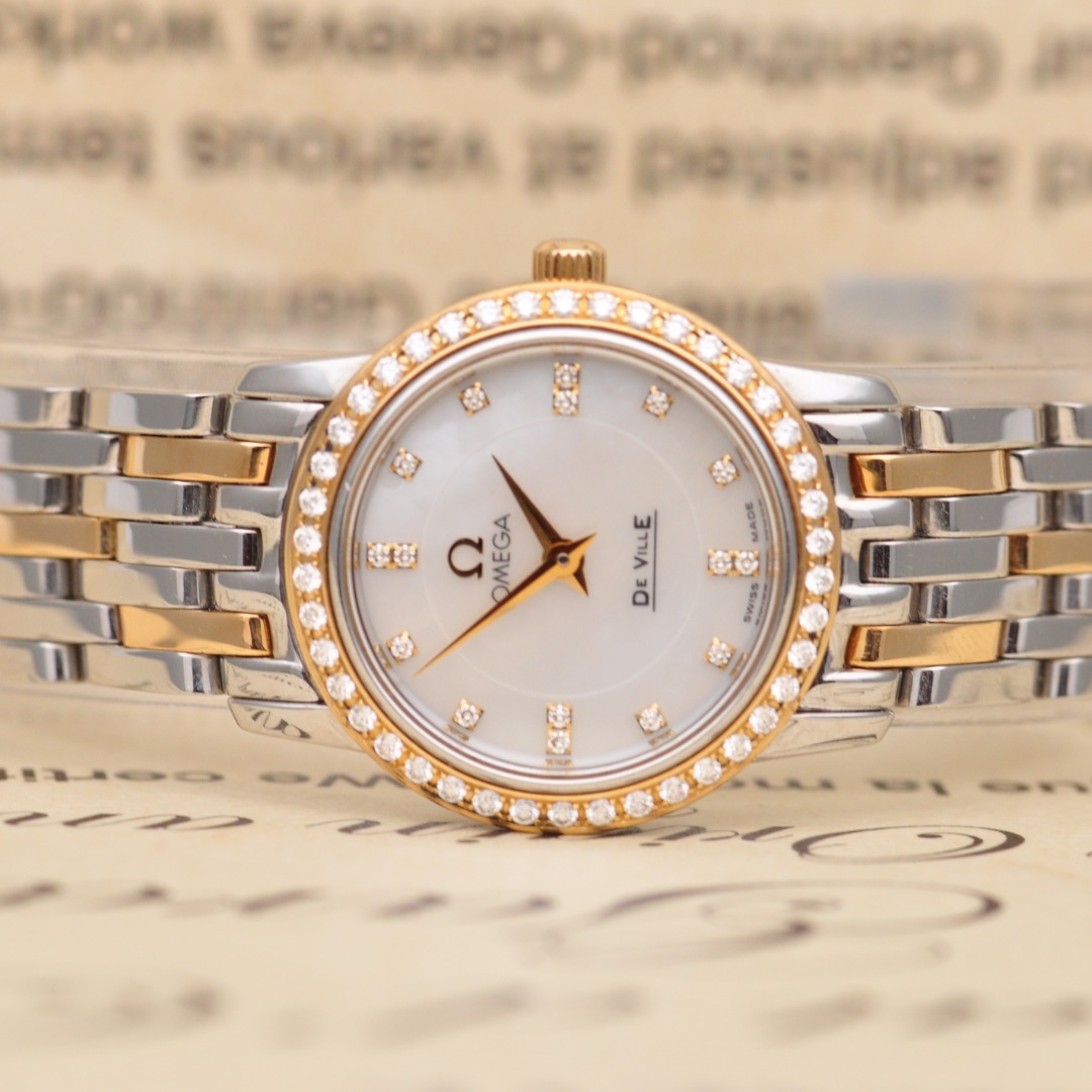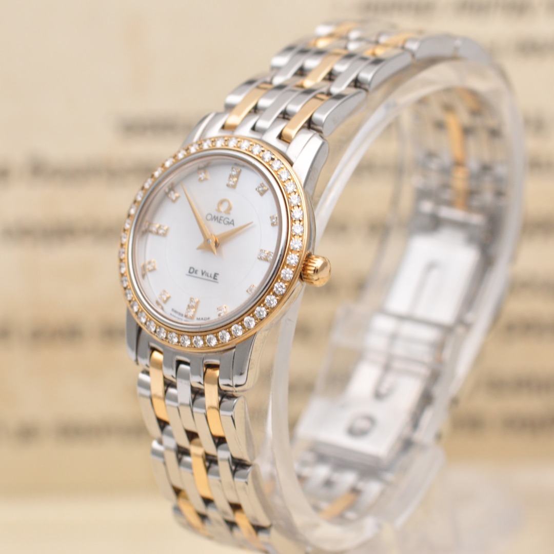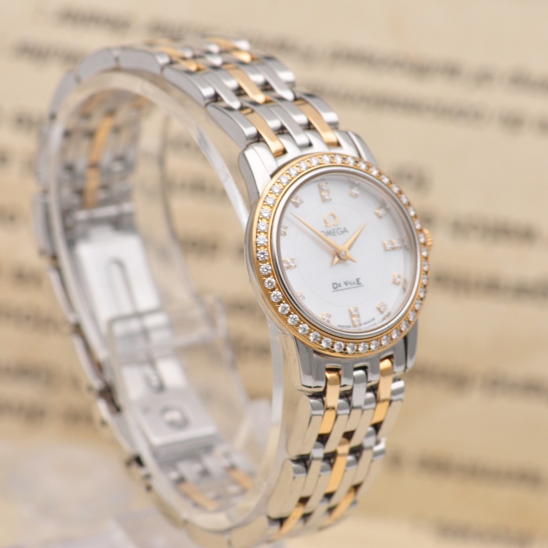 【欧米茄Omega】碟飞系列原镶钻石英女表,型号:4375.75.00腕表,精钢/18K黄金材质/原镶钻、22mm表盘直径;白珍珠贝母面盘、钻石刻度、密底、折叠扣,95新单表好品相,参考公价49200元,现货好价格,欢迎品鉴!