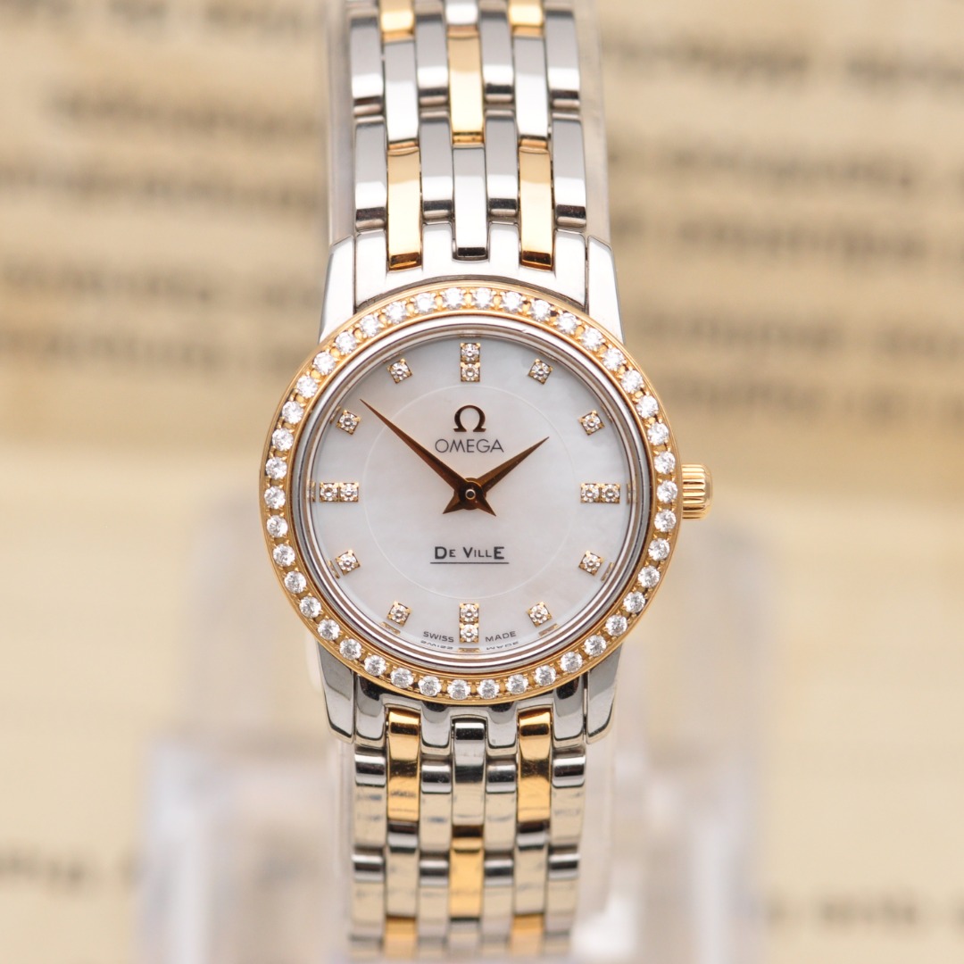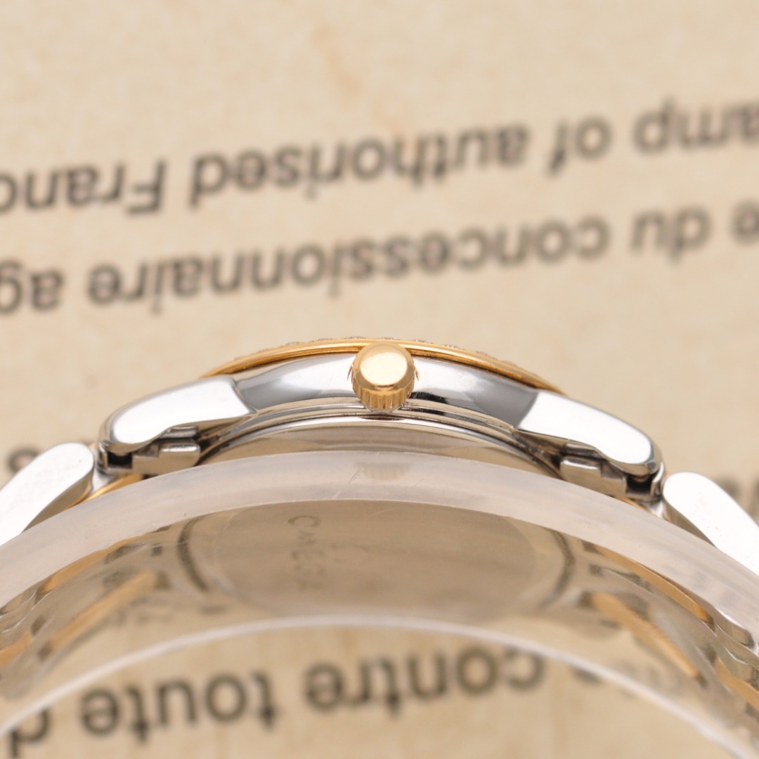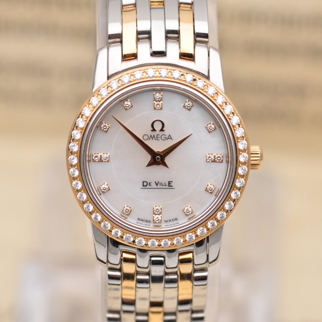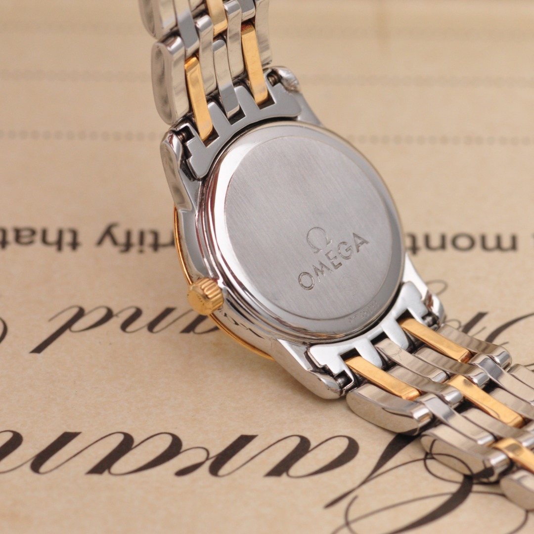 【欧米茄Omega】碟飞系列原镶钻石英女表,型号:4375.75.00腕表,精钢/18K黄金材质/原镶钻、22mm表盘直径;白珍珠贝母面盘、钻石刻度、密底、折叠扣,95新单表好品相,参考公价49200元,现货好价格,欢迎品鉴!