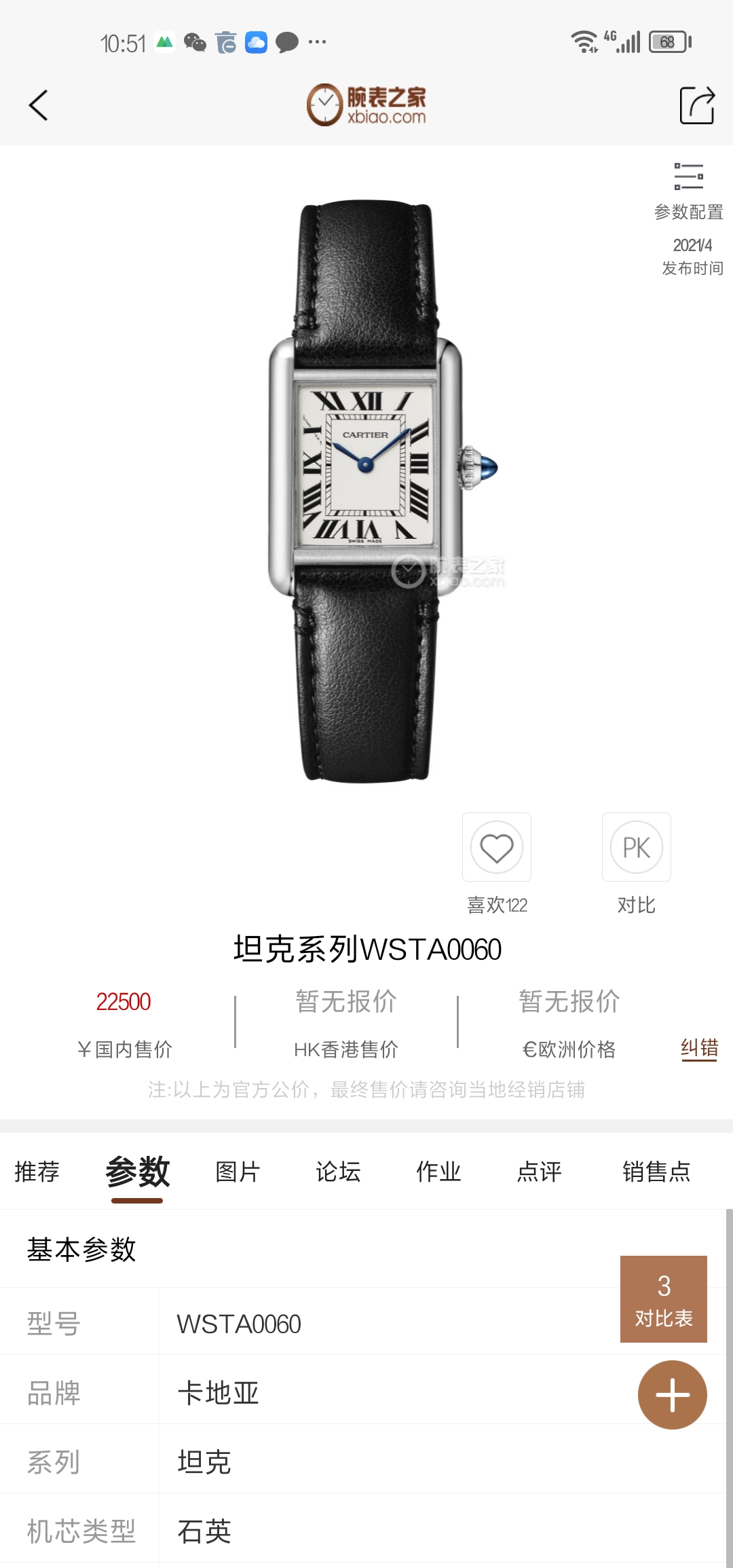 卡地亚坦克TANKWSTA0060石英女性