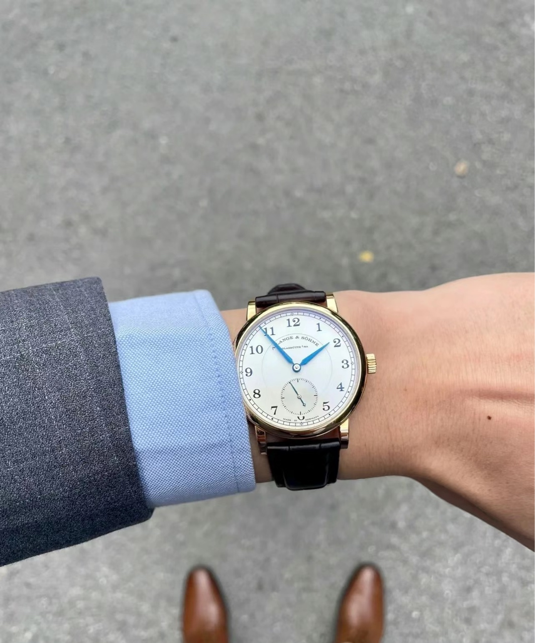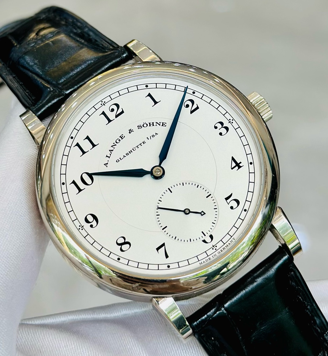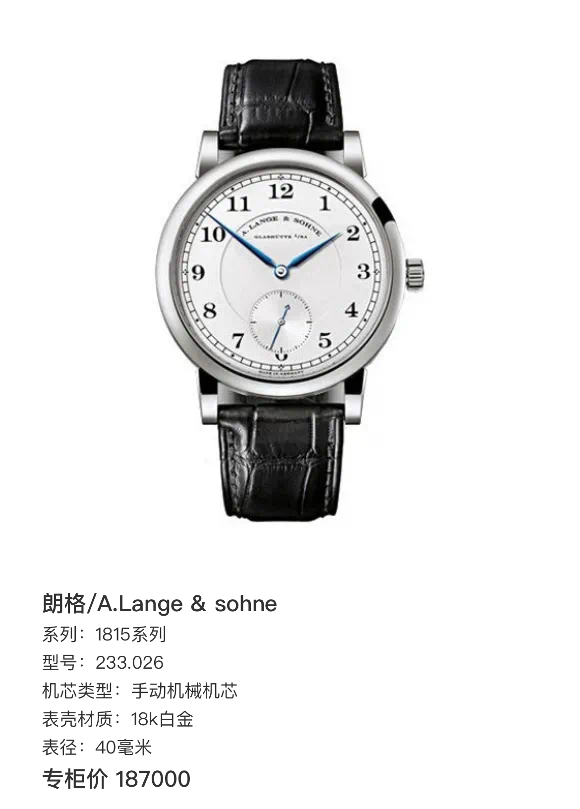 朗格/A.Lange & sohne ,1815系列 ,233.026 ,手动机械机芯 ,18k白金 ,新款40毫米口径,专柜价 18.7万,在售最新款。朗格代表作1815系列的白金小三针款,官方型号为233.026。朗格一直以来坚持只做贵金属腕表,是真正的表中贵族。而它一直以来也很对得起自己的身价,饱满的表壳优雅尊贵,白盘加蓝钢指针堪称绝配,背透的机芯更是美轮美奂,把德国高级制表的魅力展现的淋漓尽致。