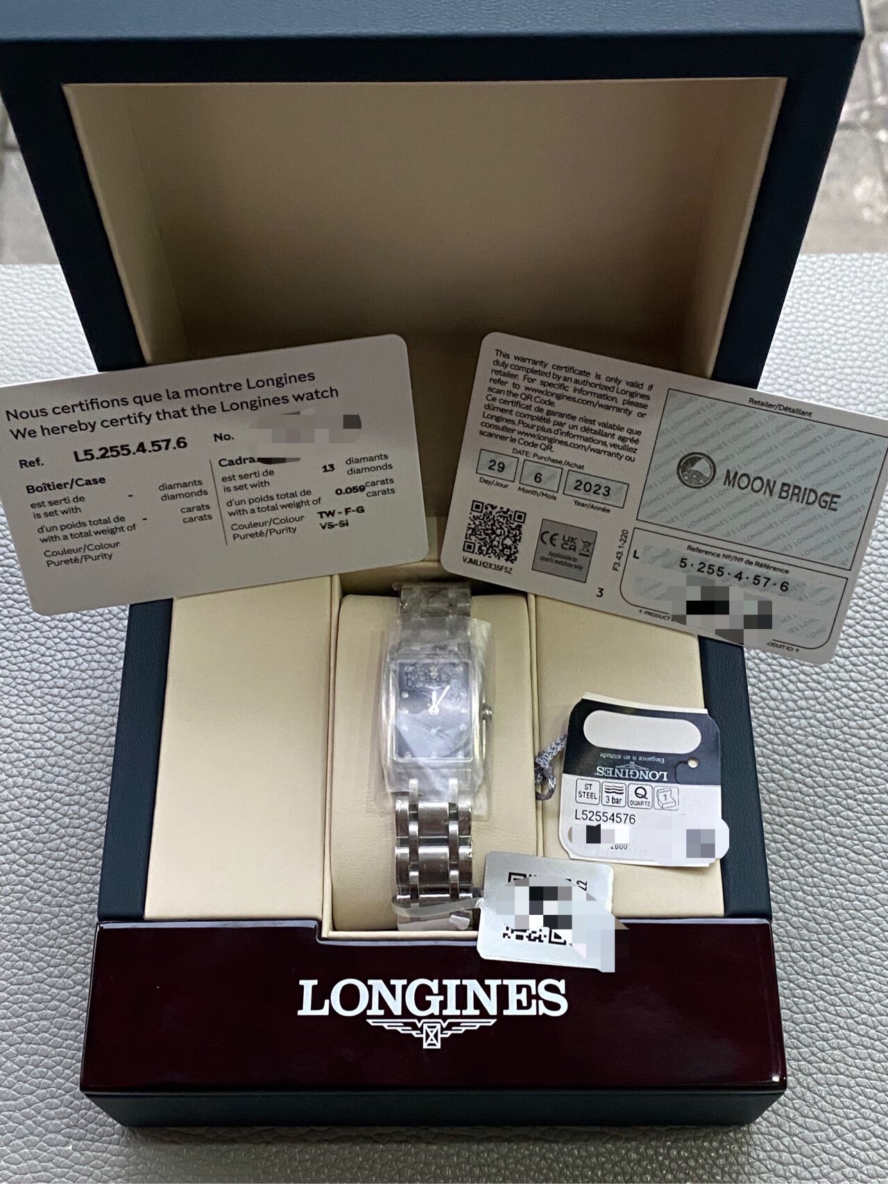 浪琴 黛卓维纳系列 L5.255.4.57.6 女士石英机芯腕表 20.8X 32mm大表径 经典黑色表盘搭配钻石刻度 6点位独立秒针 简单精致 2023年全套全膜 公价14400 现货特价️出