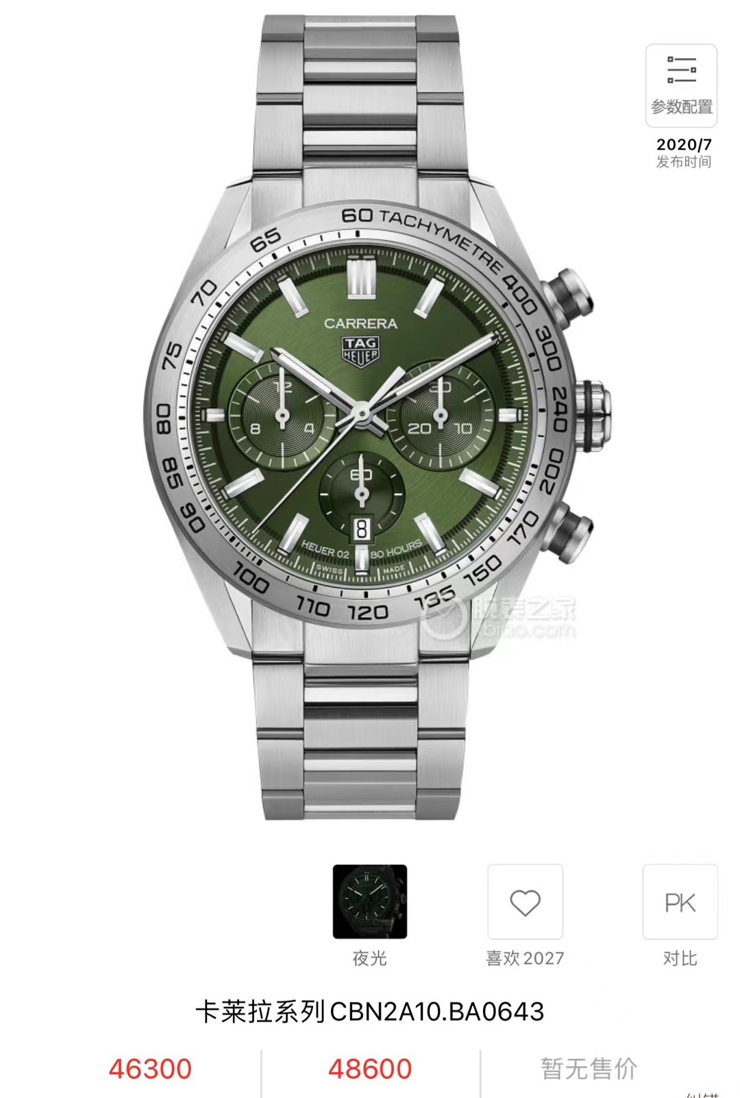 泰格豪雅/TAG Heuer TAG HEUER CARRERA(卡莱拉系列) CBN2A10.BA0643 自动机械机芯 精钢 精细磨砂/抛光 44 mm 专柜价46300