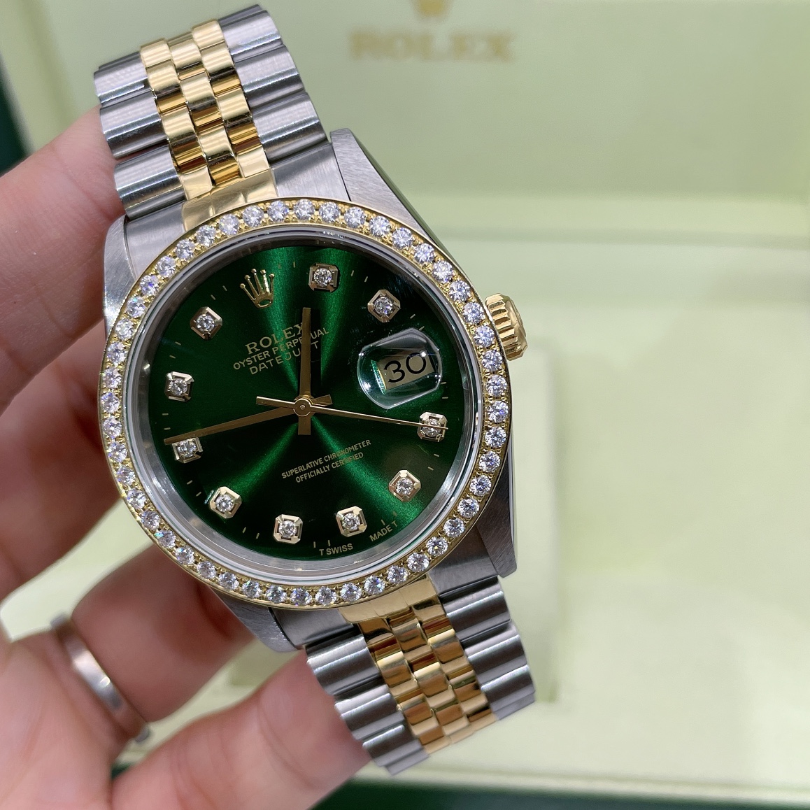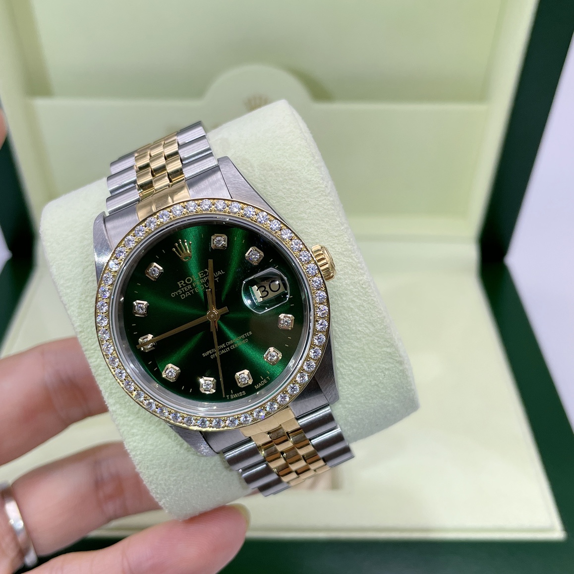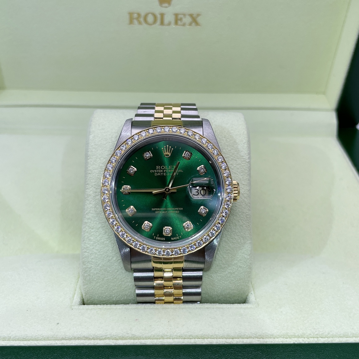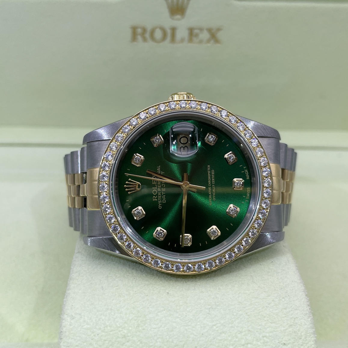 现货 劳力士 日志型系列16233. 36mm表径 大包钻 稀缺绿色盘 里外后钻 18k黄金间金自动机械男表 专柜价¥97800 现在好价得~ 后盘后钻 单表