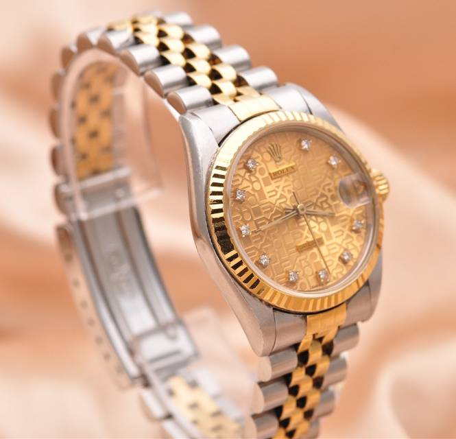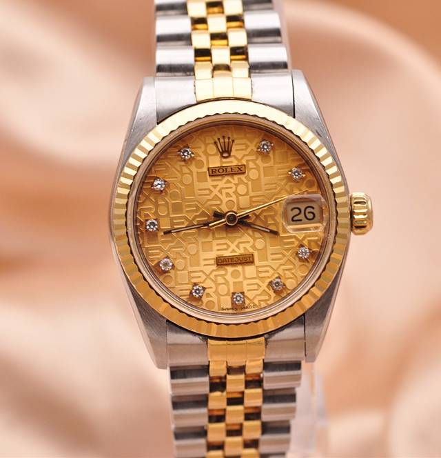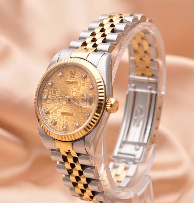 【劳力士Rolex】日志型系列原镶钻自动机械女表68273;精钢/18K黄金材质/原镶钻;31mm表盘直径; 香槟色电脑面盘、钻石刻度、日期显示、密底、折叠扣。95新单表好品相,参考公价约89500元~现货好价格~欢迎品鉴!