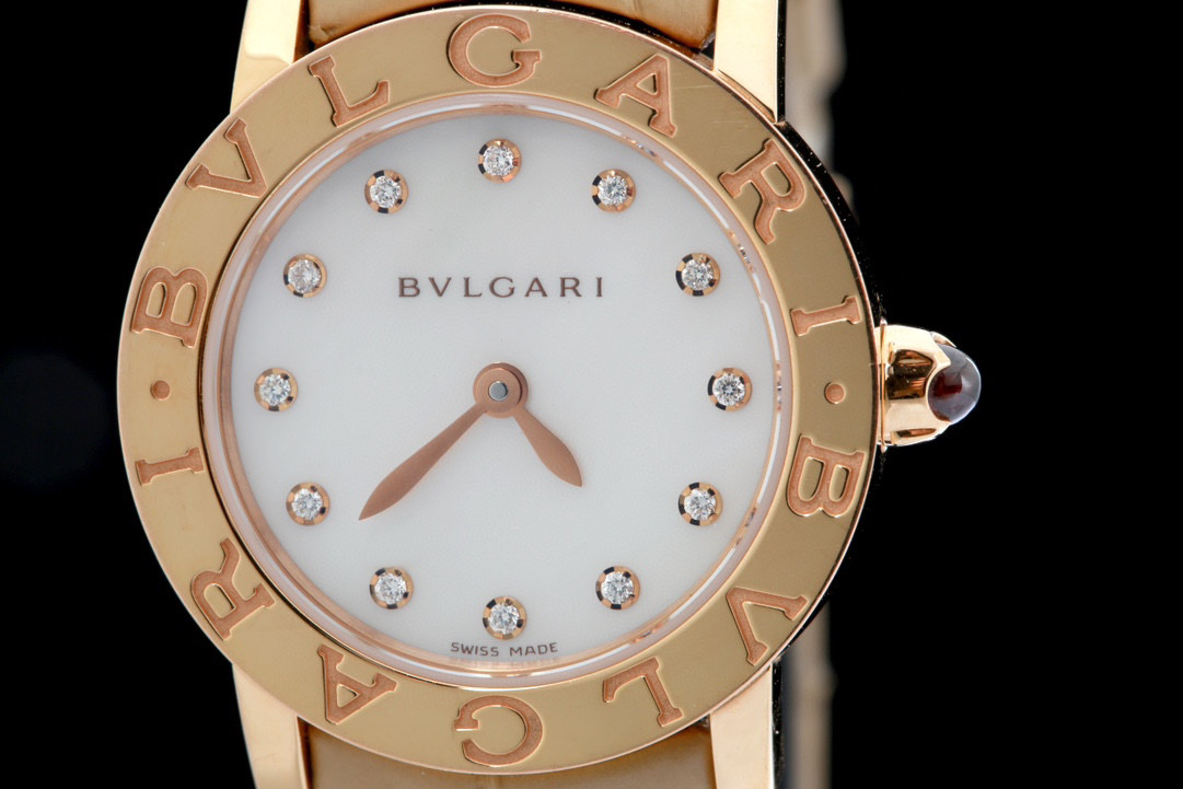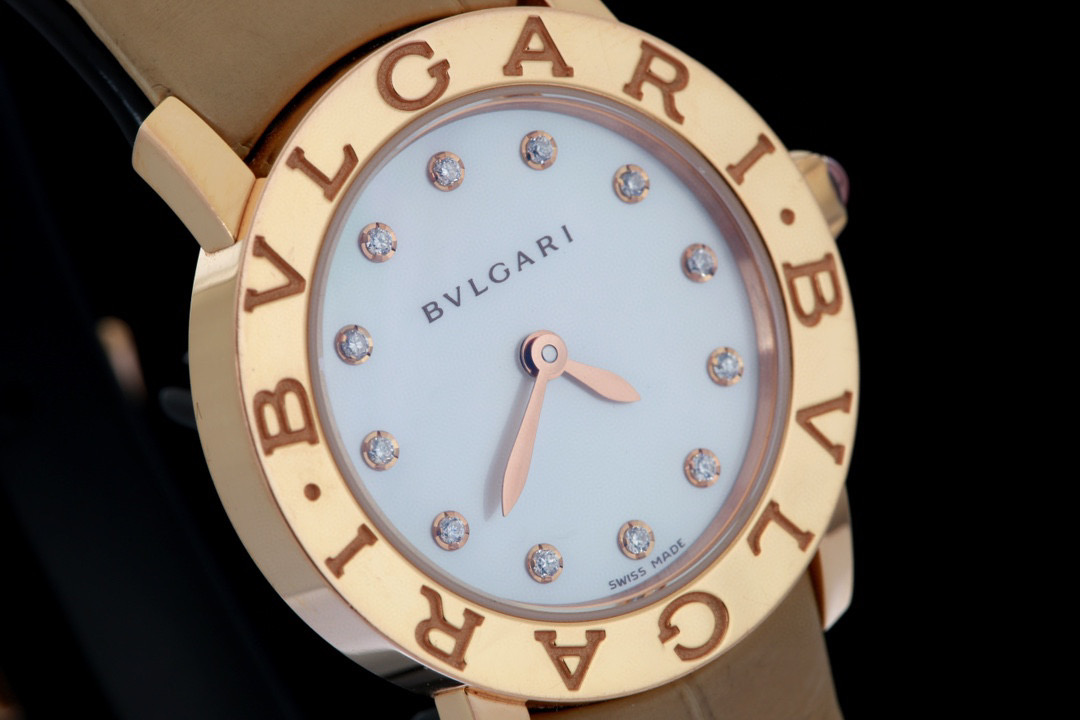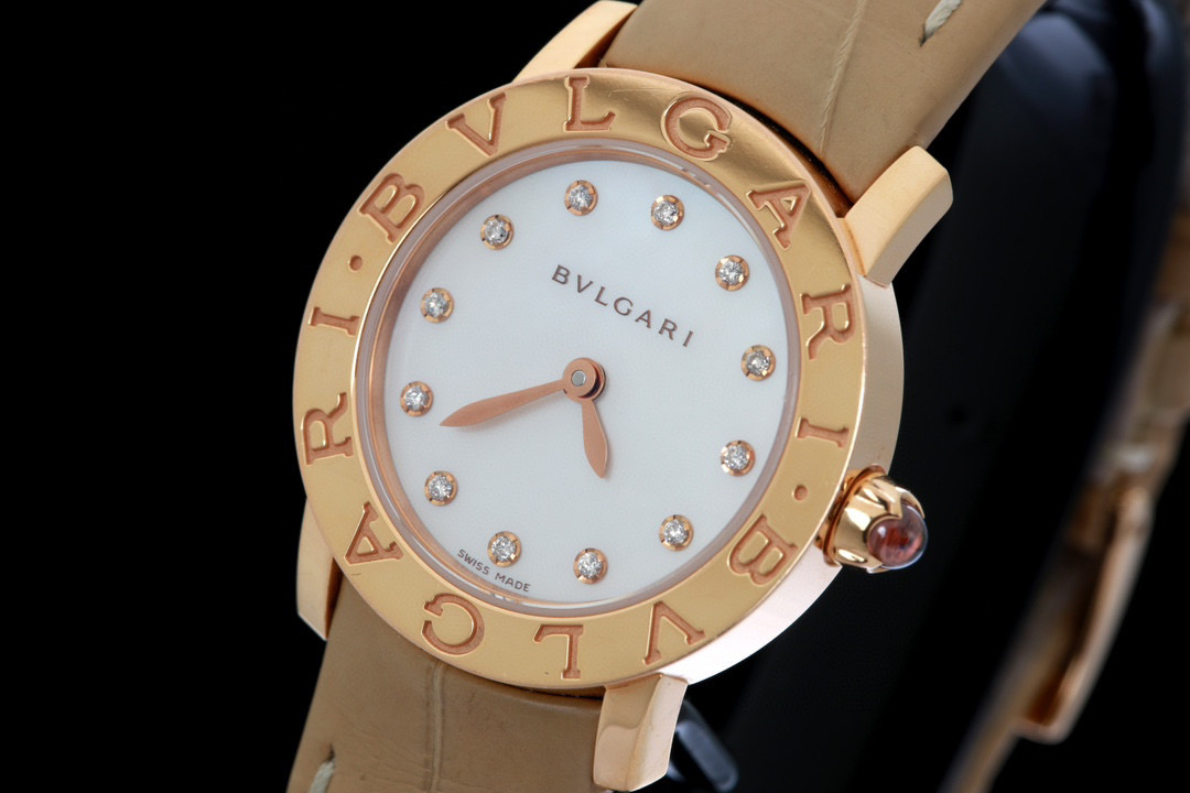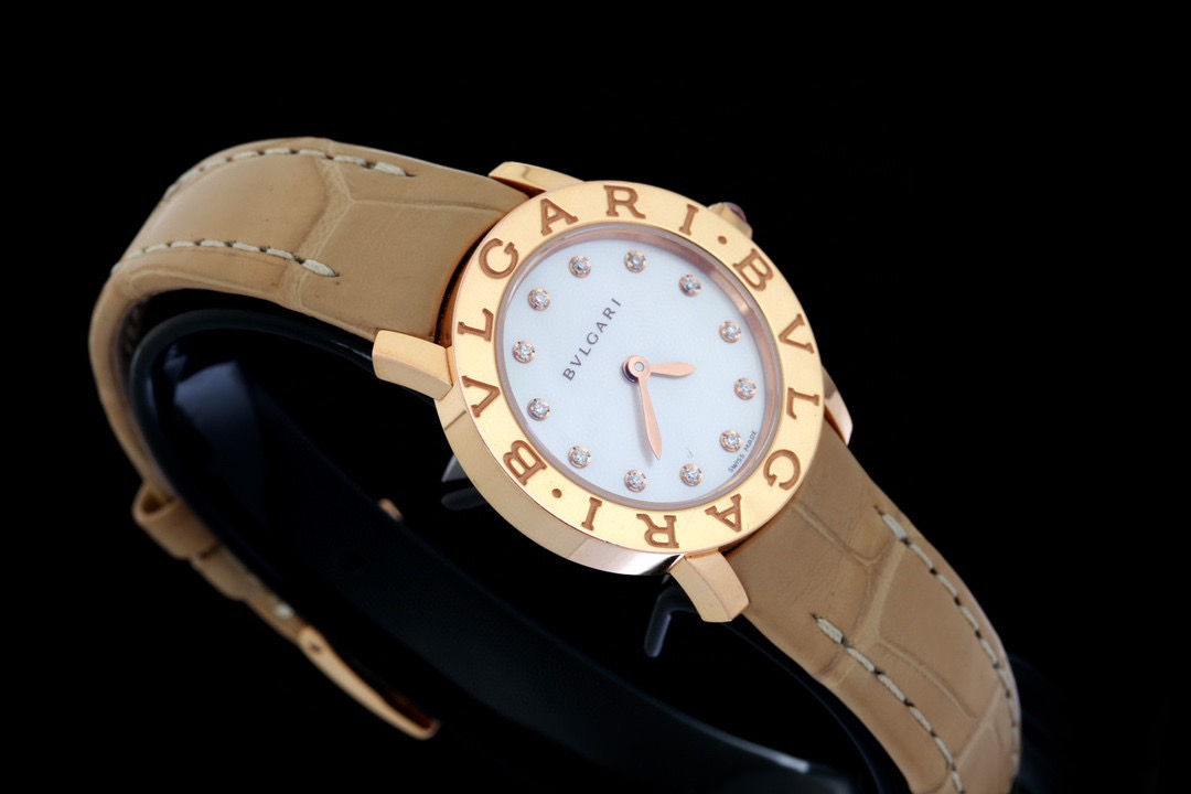 宝格丽,BVLGARI∙BVLGARI系列,101884 BBLP26WGL/12,表径26mm,玫瑰金材质,Cal.B046石英机芯,珍珠母贝表盘,配以钻石时标,表冠镶嵌粉色宝石,单表无附件,专柜价87000,现货特价