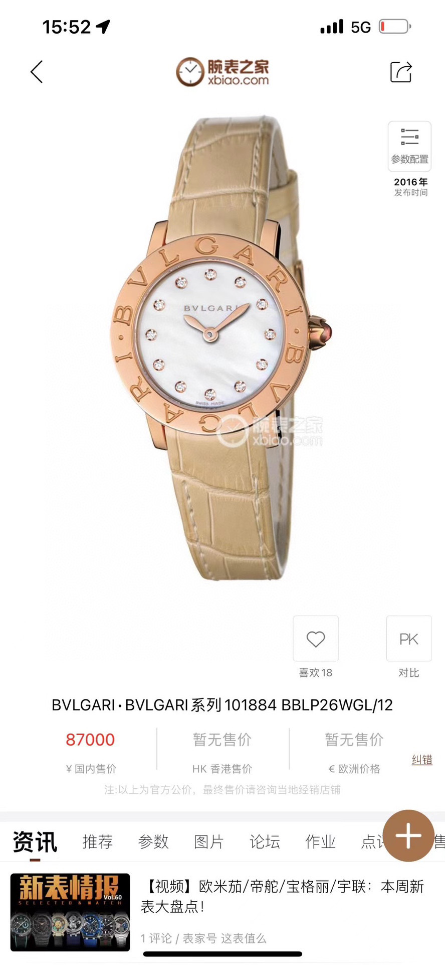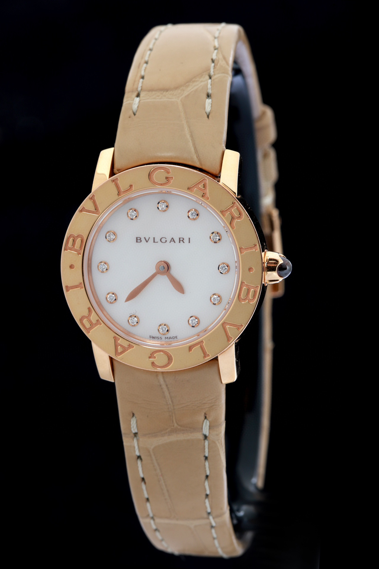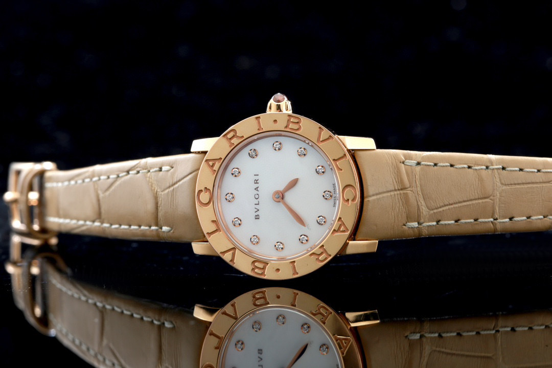 宝格丽,BVLGARI∙BVLGARI系列,101884 BBLP26WGL/12,表径26mm,玫瑰金材质,Cal.B046石英机芯,珍珠母贝表盘,配以钻石时标,表冠镶嵌粉色宝石,单表无附件,专柜价87000,现货特价