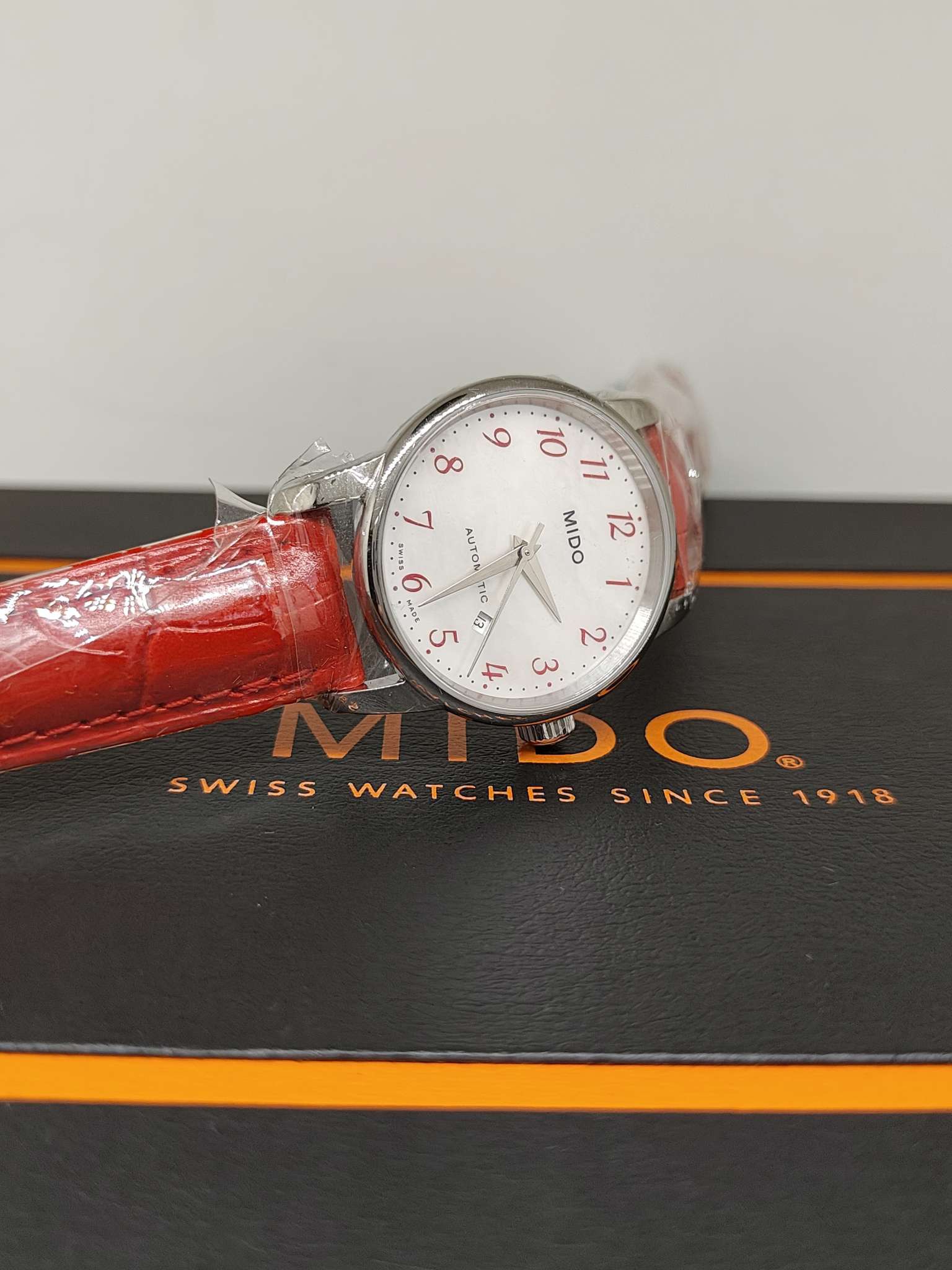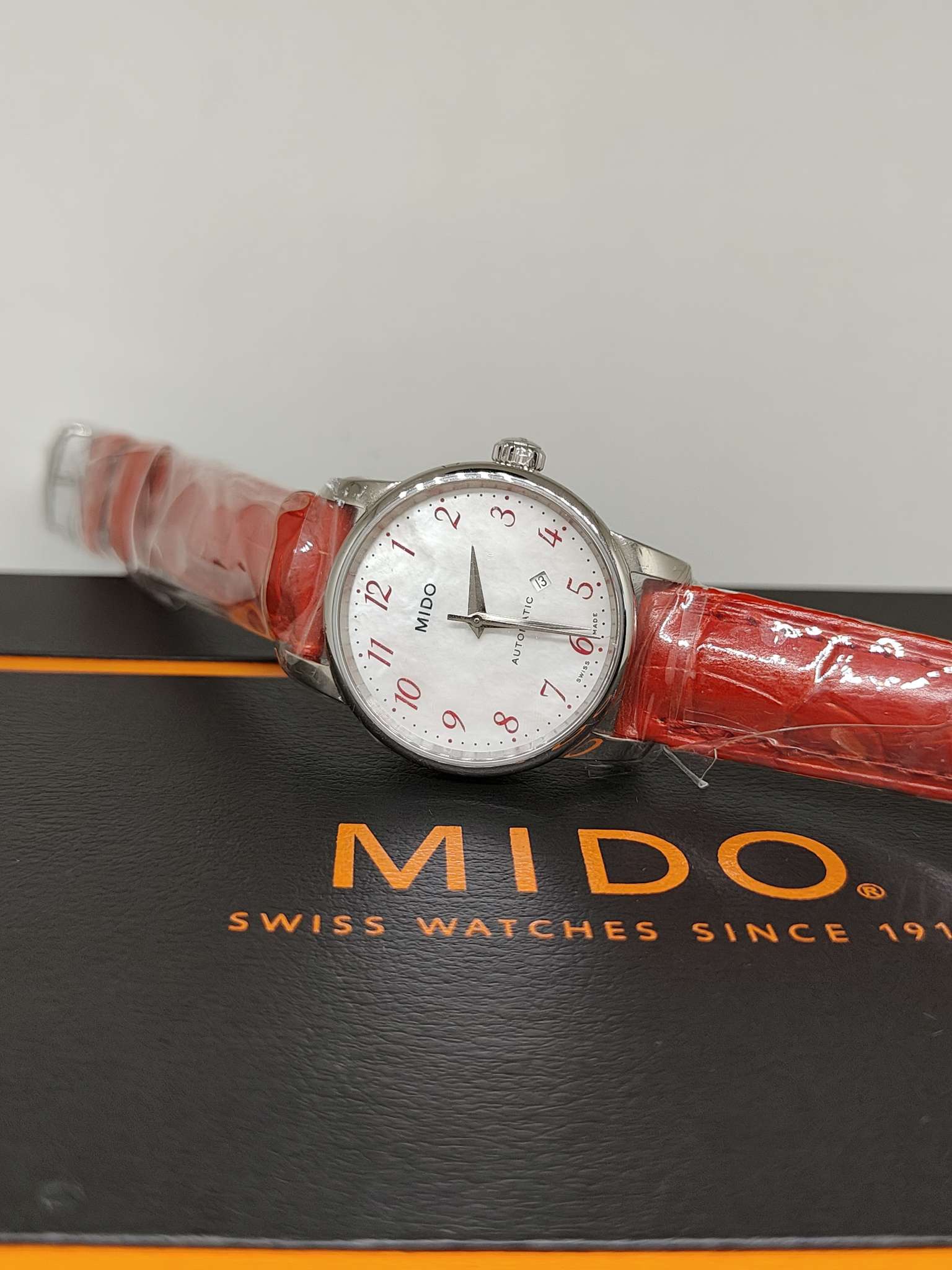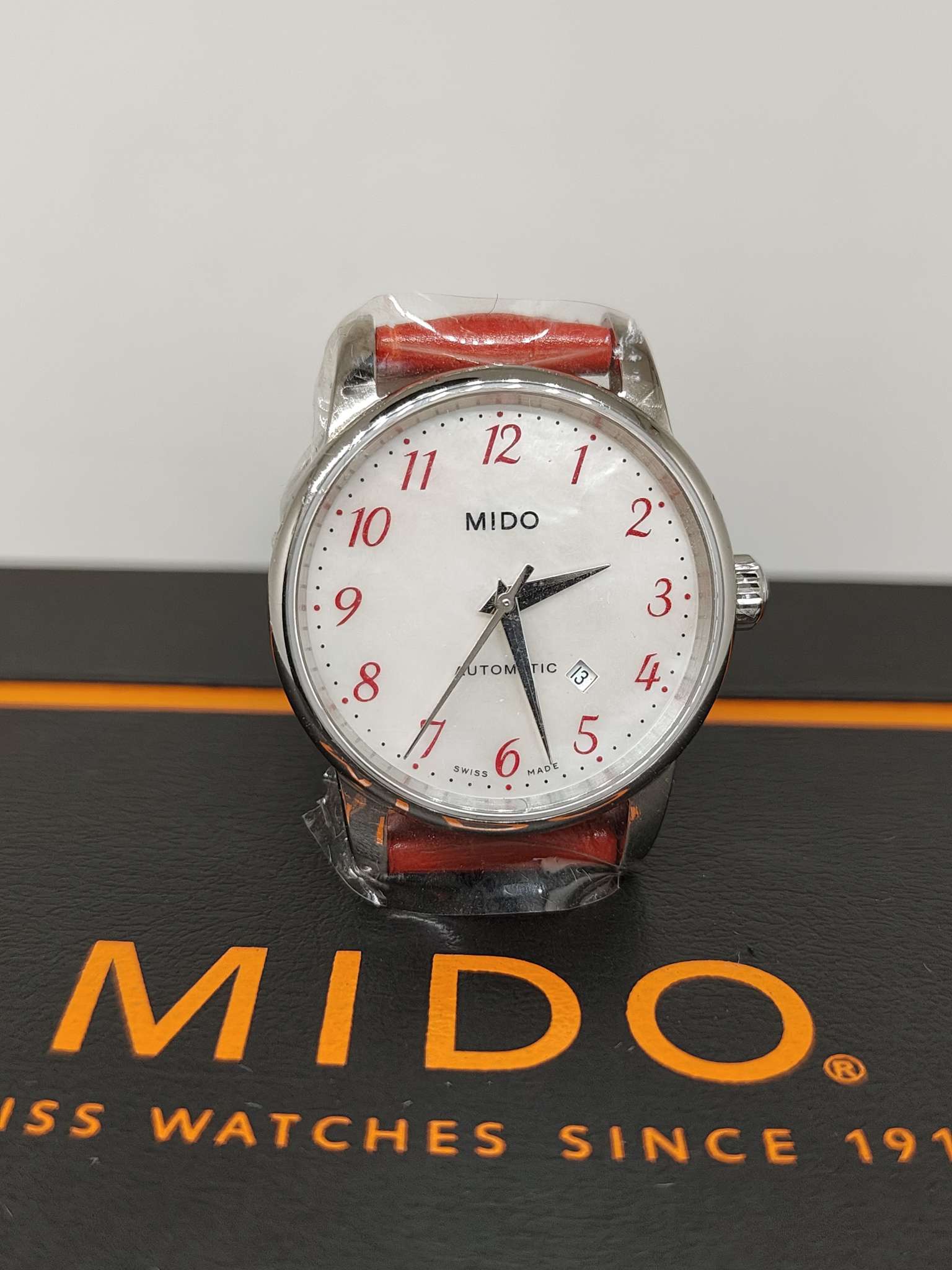 美度/Mido Baroncelli II 贝伦赛丽II系列 M7600.4.39.7 自动机械机芯,银白表盘,红色表带,折叠表扣,背透表底,50米防水,日期显示,不锈钢 29毫米 专柜价6100 国行全新当天卡